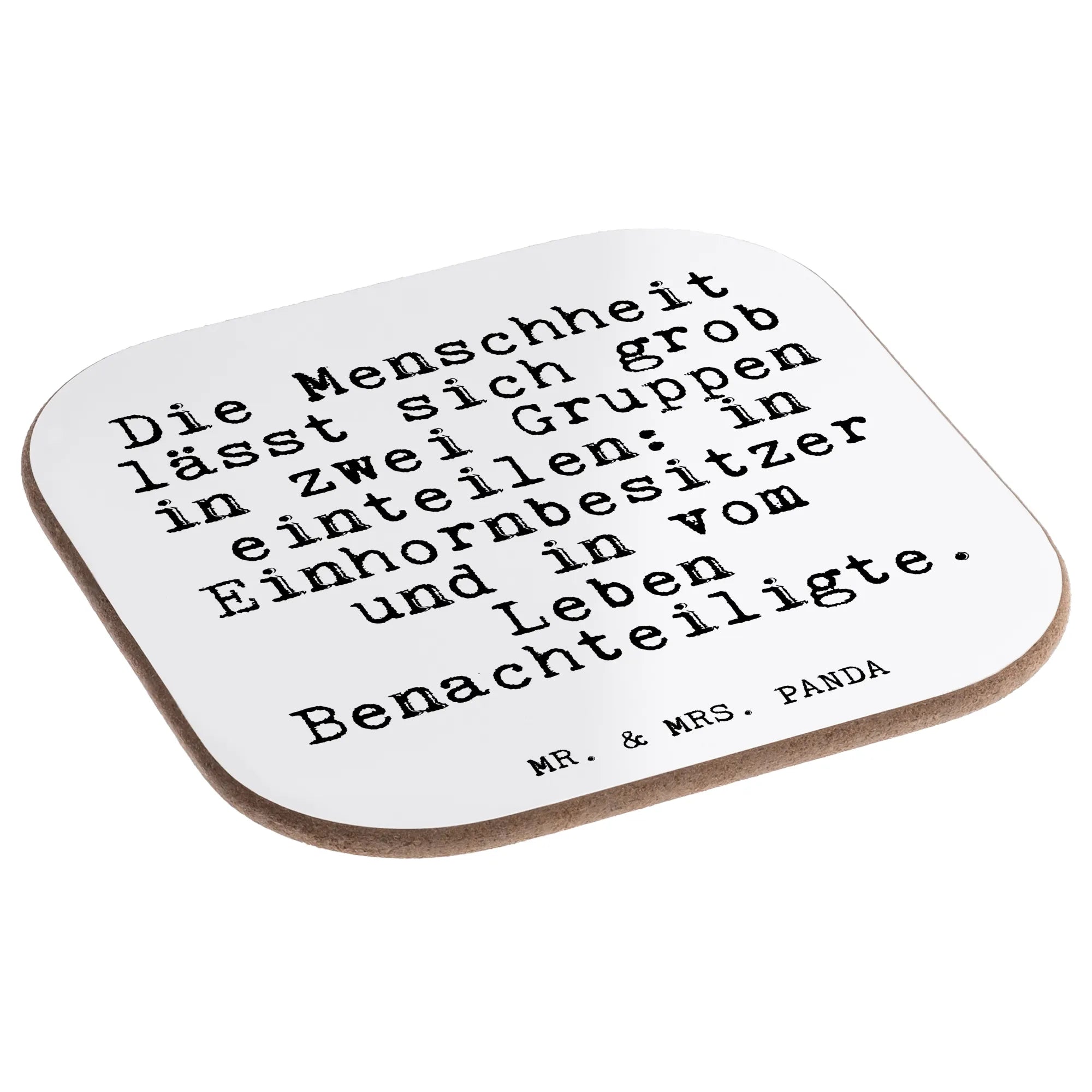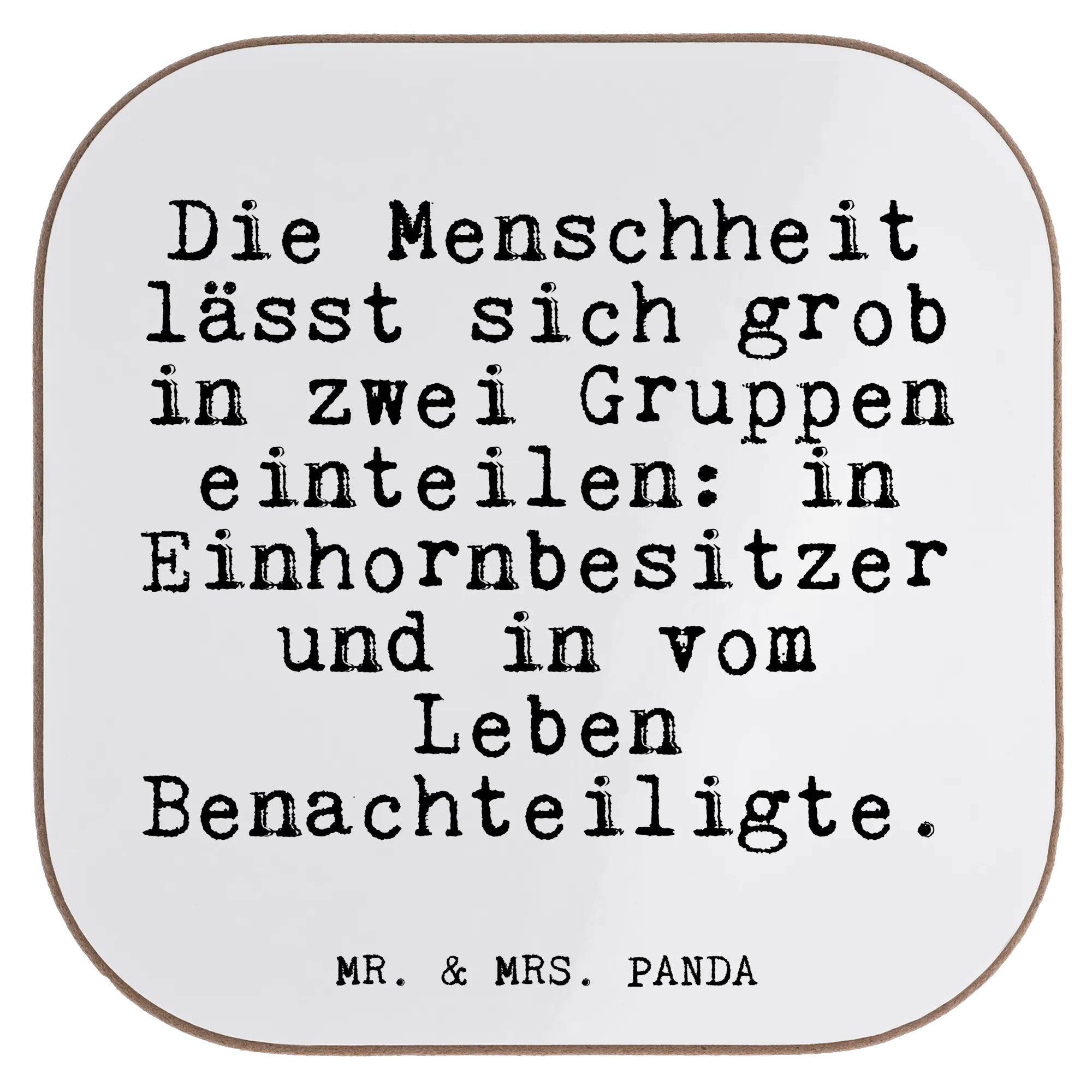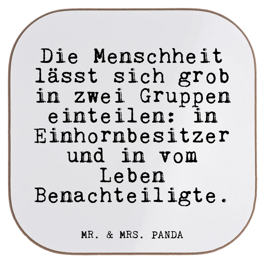 Witz trifft Alltagsschutz: Unser quadratischer Untersetzer von Mr. & Mrs. Panda ist mehr als nur ein Glasuntersetzer. Bedruckt mit dem frechen Spruch „Die Menschheit lässt sich grob in zwei Gruppen einteilen: in Einhornbesitzer und in vom Leben Benachteiligte.“ bringt er Humor und Stil auf Deinen Tisch und ist zugleich praktischer Schutz gegen Abdrücke, Kratzer und extreme Temperaturen.