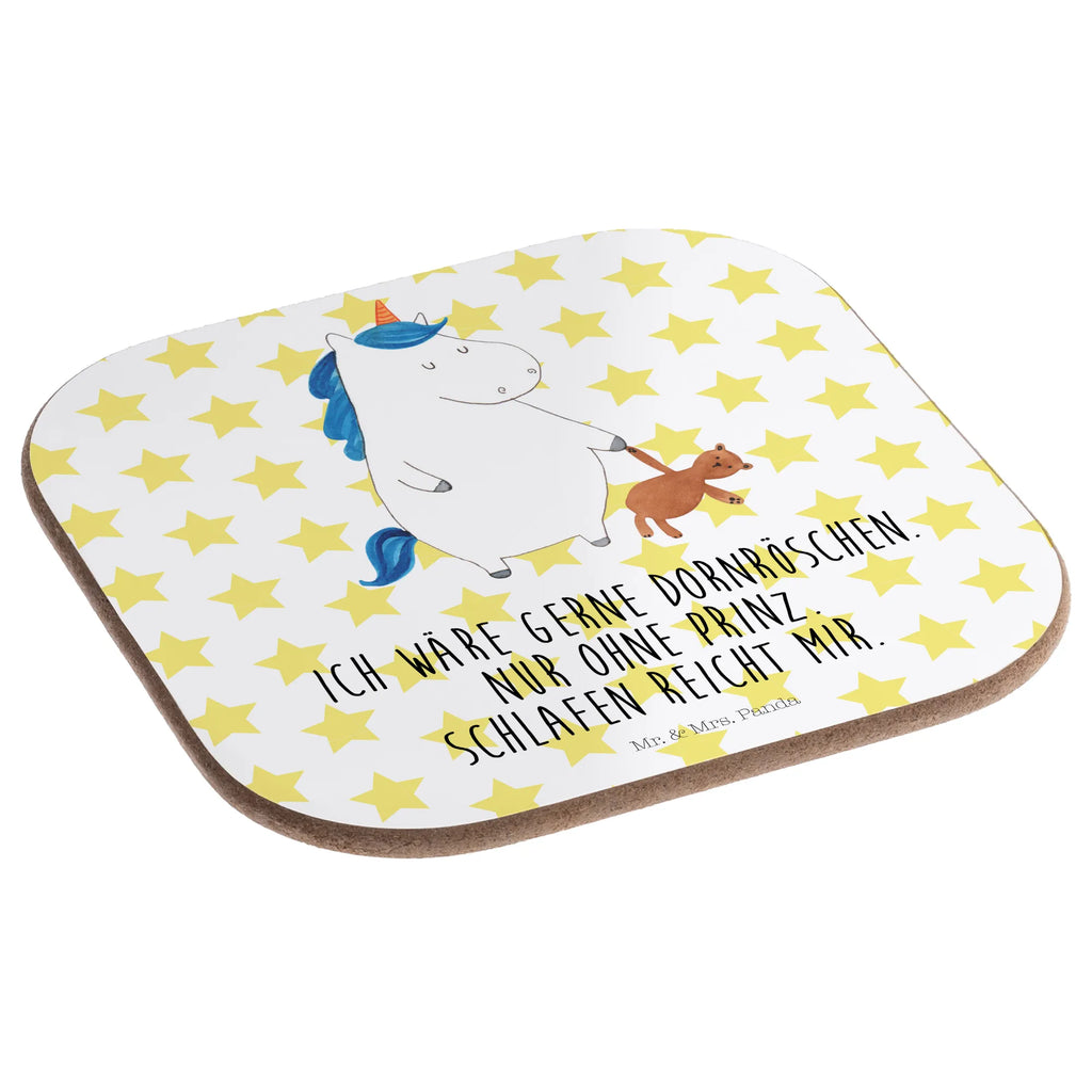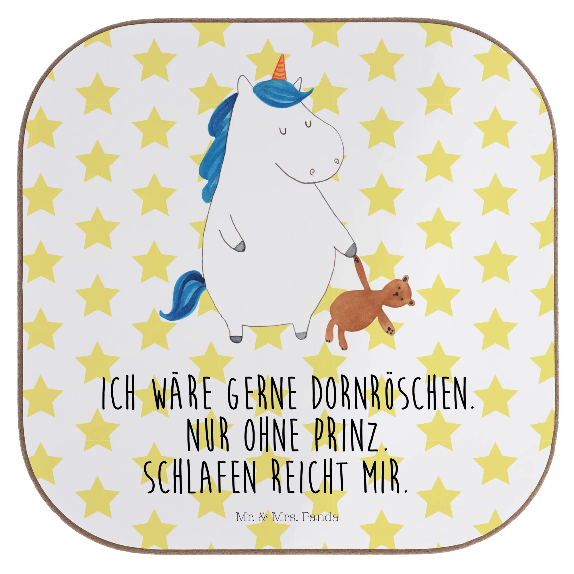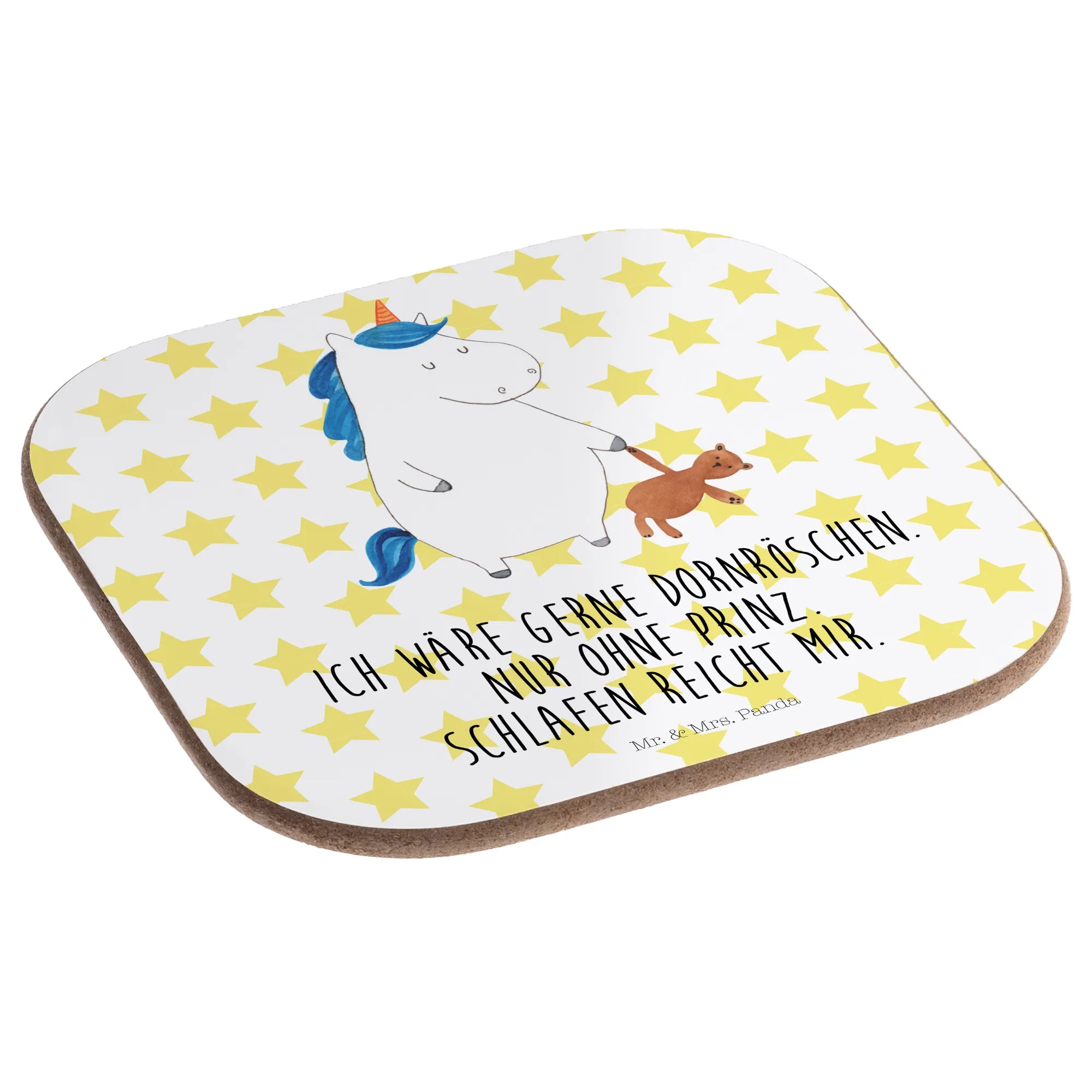 Entdecke den zauberhaften Untersetzer "Einhorn Teddy" aus der einzigartigen Einhorn-Kollektion von Mr. & Mrs. Panda! Dieser wunderschöne quadratische Untersetzer ist nicht nur ein praktisches Accessoire für deinen Tisch, sondern auch ein echter Hingucker. Bedruckt mit einem süßen, schlafenden Einhorn, das einen Teddybären in der Hand hält, bringt er ein Stück Magie und Freude in dein Zuhause. Der lustige Spruch "Ich wäre gerne Dornröschen. Nur ohne Prinz. Schlafen reicht mir." sorgt für gute Laune und ist perfekt für alle, die das Singleleben in vollen Zügen genießen.