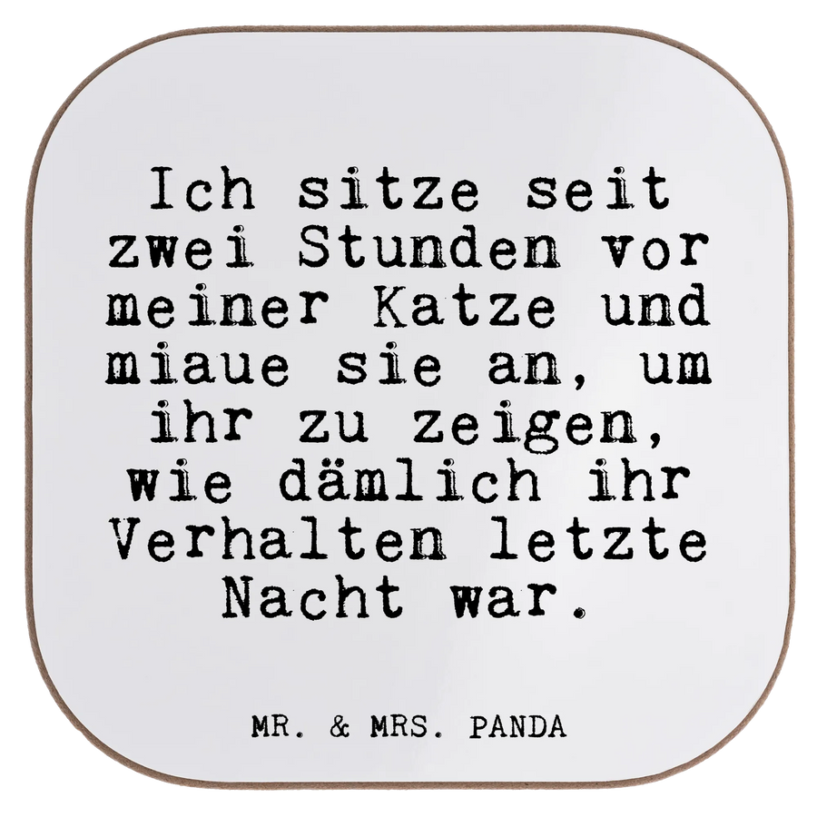 Schenke Deinem Lieblingsmenschen ein Stück Freude im Alltag mit unserem einzigartigen Untersetzer mit dem spritzigen Spruch: 'Ich sitze seit zwei Stunden vor meiner Katze und miaue sie an, um ihr zu zeigen, wie dämlich ihr Verhalten letzte Nacht war.' Dieser quadratische Untersetzer von Mr. & Mrs. Panda ist nicht nur praktisch, sondern auch ein echter Hingucker für alle Katzenliebhaber!