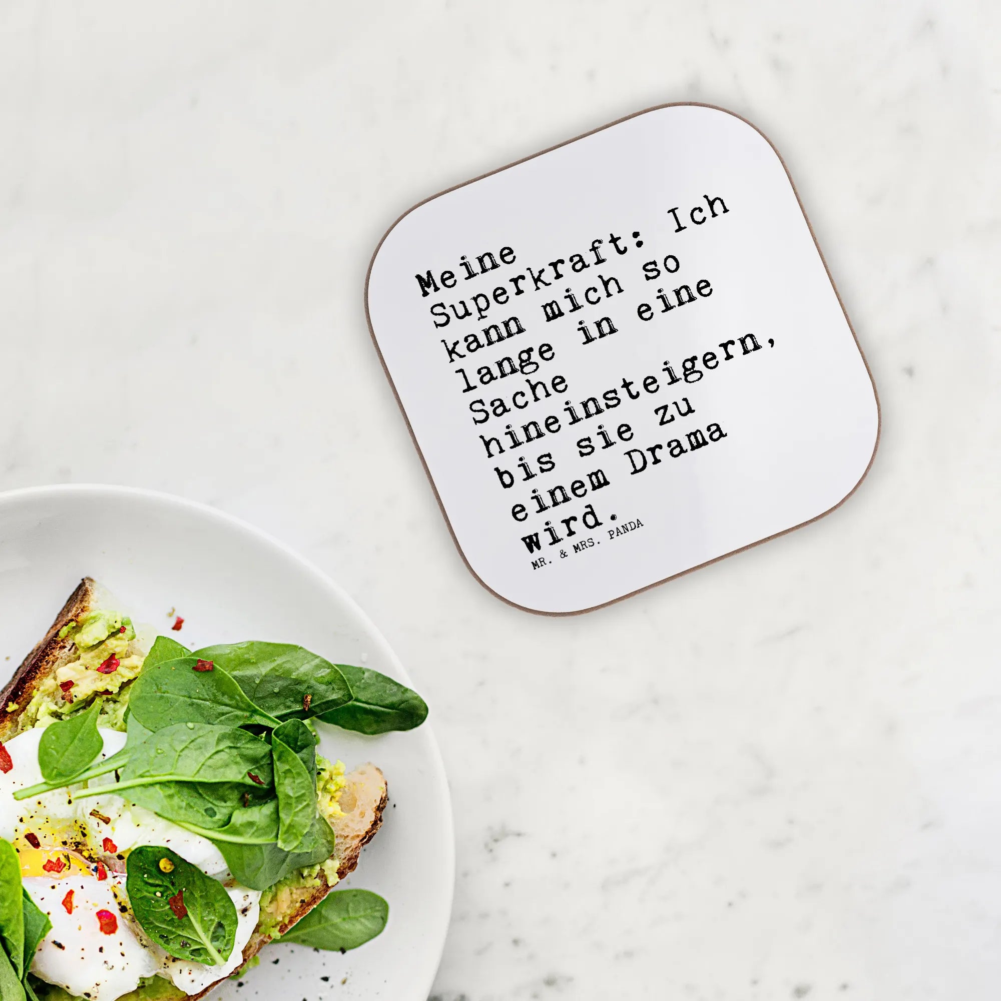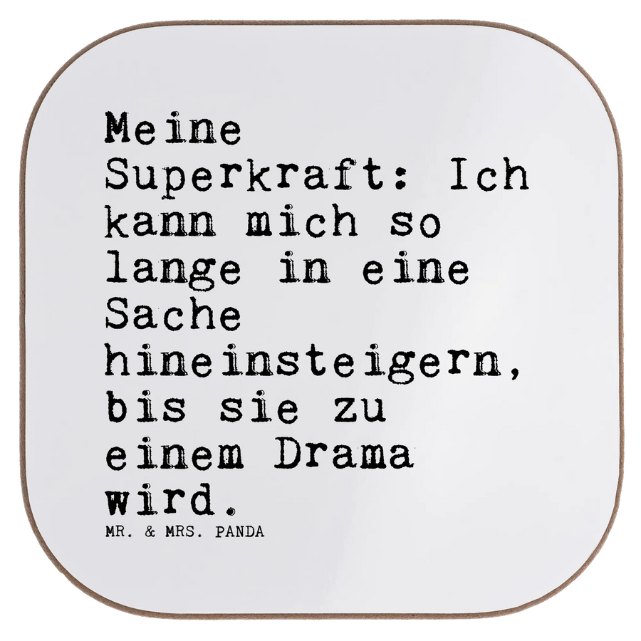 Quadratische Untersetzer Sprüche und Zitate Meine Superkraft: Ich kann mich so lange in eine Sache hineinsteigern, bis sie zu einem Drama wird. - Weiß
