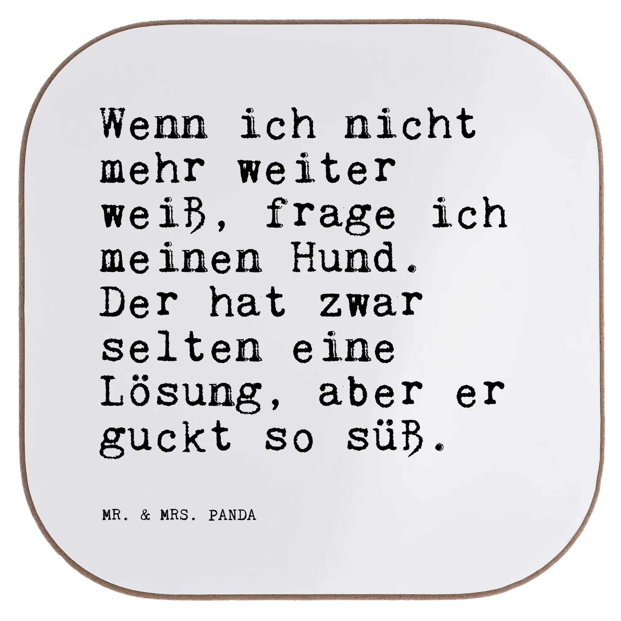 Du liebst Hundeblicke? Dann wirst du unseren quadratischen Untersetzer aus der Spruchreif Kollektion von Mr. & Mrs. Panda lieben. Mit dem süßen Spruch „Wenn ich nicht mehr weiter weiß, frage ich meinen Hund. Der hat zwar selten eine Lösung, aber er guckt so süß.“ bringt er Wärme und Humor auf jeden Tisch. 🐶