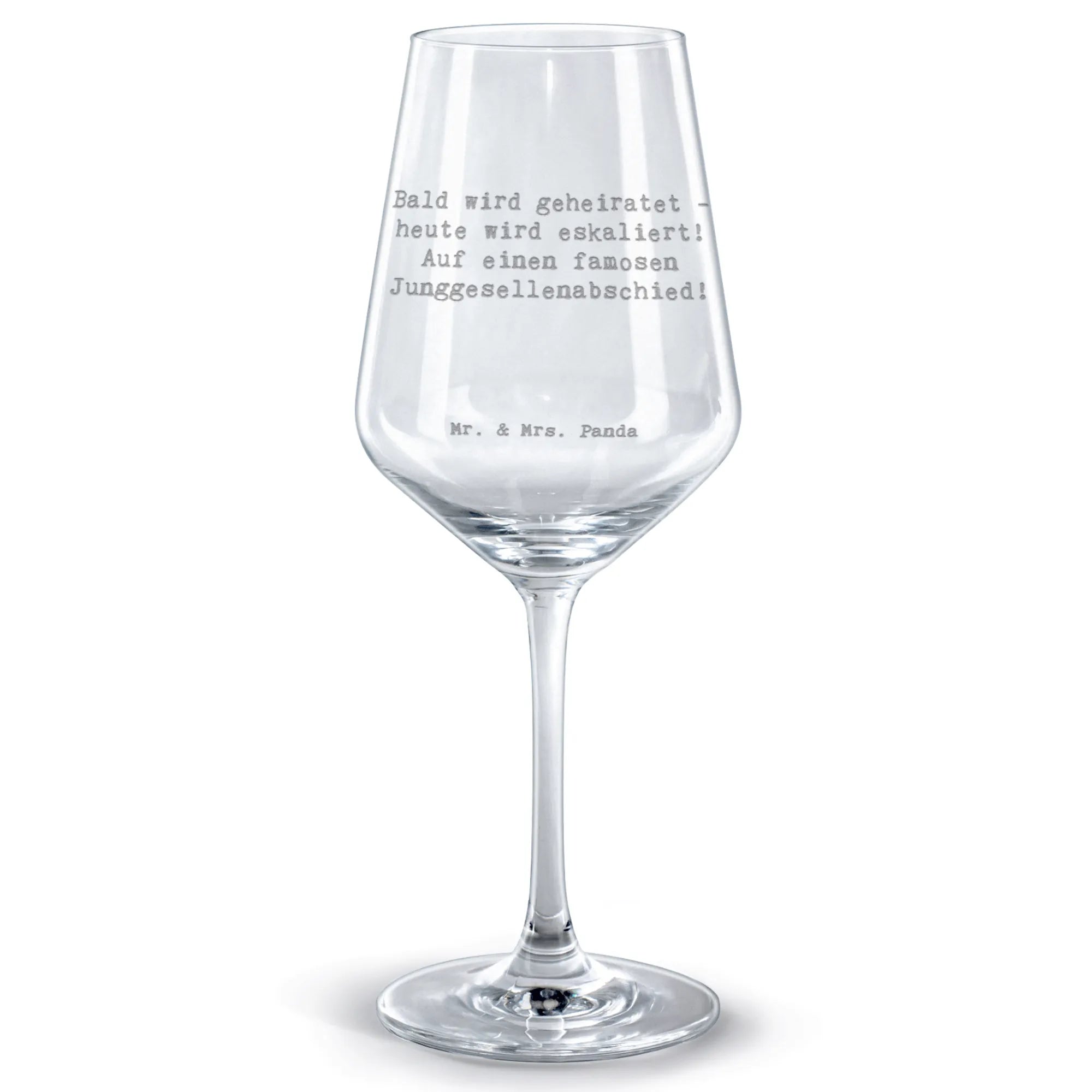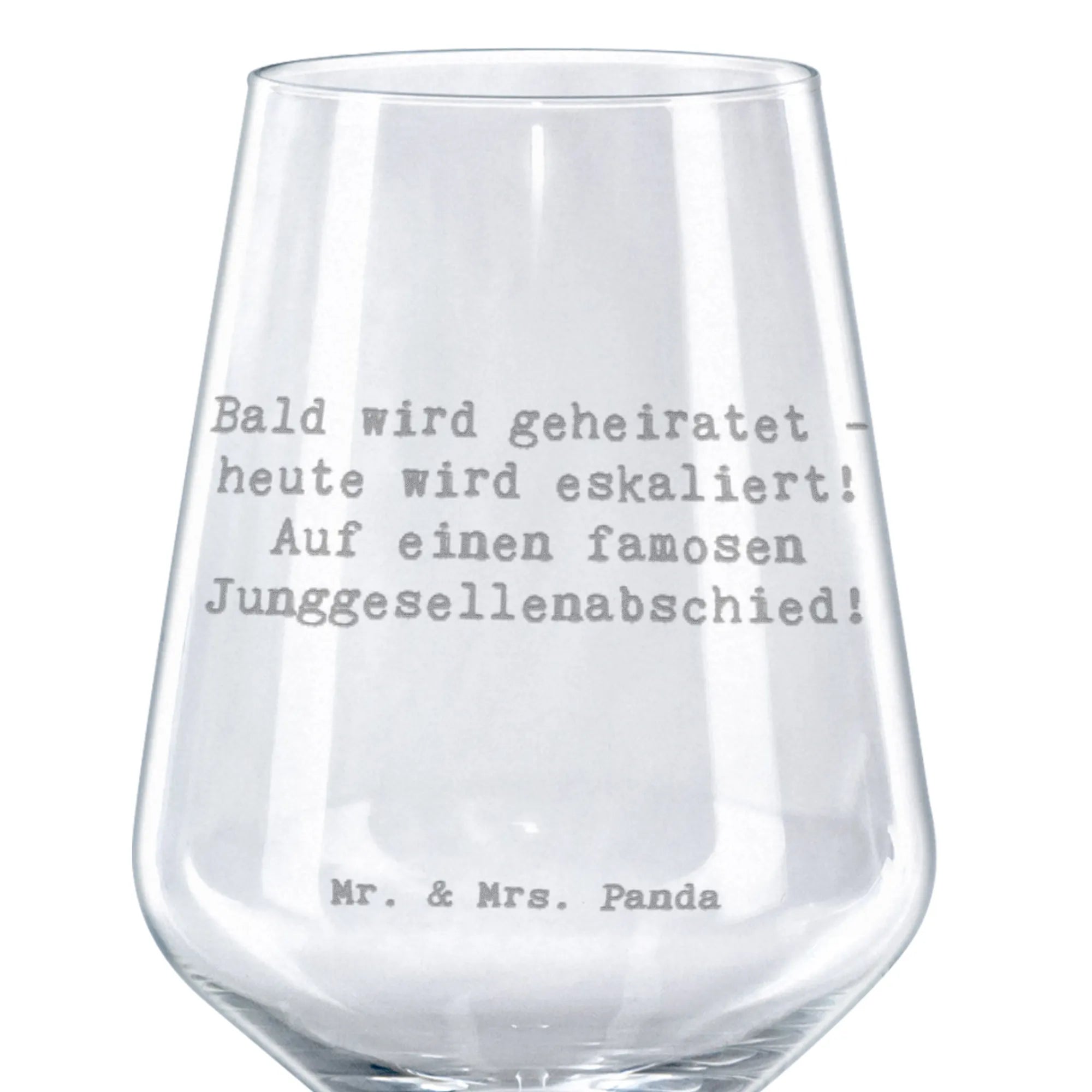 Bald wird geheiratet und das müssen wir feiern! Das wunderschöne Rotweinglas von Mr. & Mrs. Panda mit dem aufmunternden Slogan "Bald wird geheiratet - heute wird eskaliert! Auf einen famosen Junggesellenabschied!" ist das perfekte Geschenk für alle Weinliebhaber und die, die einen unvergesslichen Junggesellenabschied planen.