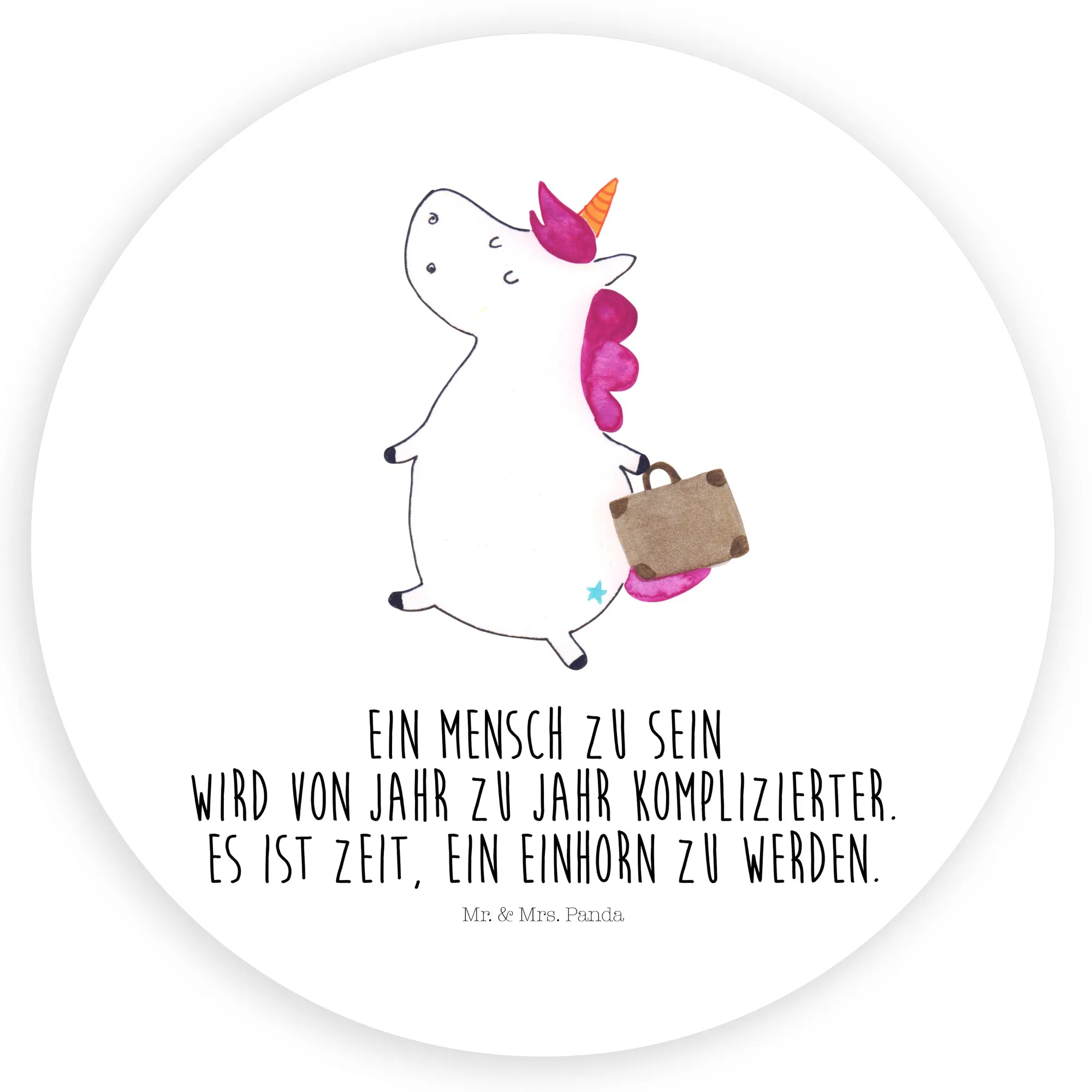 Stell dir vor, ein fröhliches Einhorn mit einem Koffer in der Hand macht sich bereit für das nächste große Abenteuer. Es strahlt vor Freude und Unbeschwertheit, während es die Welt erkundet. Dieses süße Motiv fängt genau diese verspielte Einstellung ein: 'Ein Mensch zu sein wird von Jahr zu Jahr komplizierter. Es ist Zeit, ein Einhorn zu werden.' Lasse dich inspirieren, die Fantasie eines Kindes zu bewahren und die Welt mit einem Lächeln zu sehen. Es ist nie zu spät, den inneren Traumreisenden zum Leben zu erwecken!