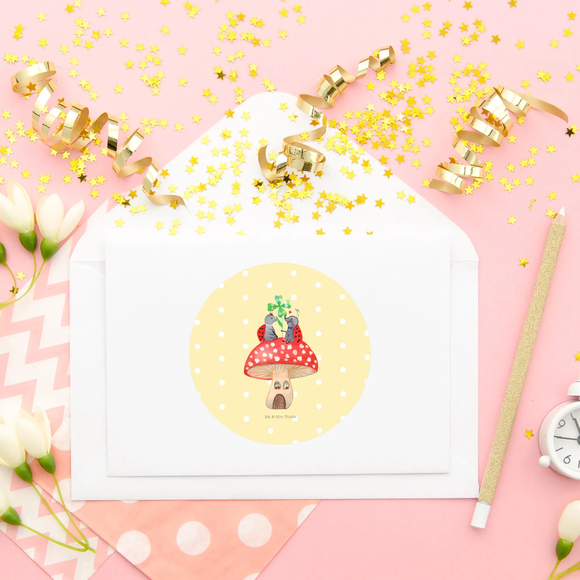 Hochzeiten, Geburtstage, Bastelprojekte, Schulhefte, kleine Unternehmen, die ein rundes Logo-Etikett suchen, und alle, die gern mit liebevollen Details arbeiten. Das Motiv ist ohne Text – nur das zarte Marienkäfer Paar auf dem Fliegenpilz, das für sich spricht.