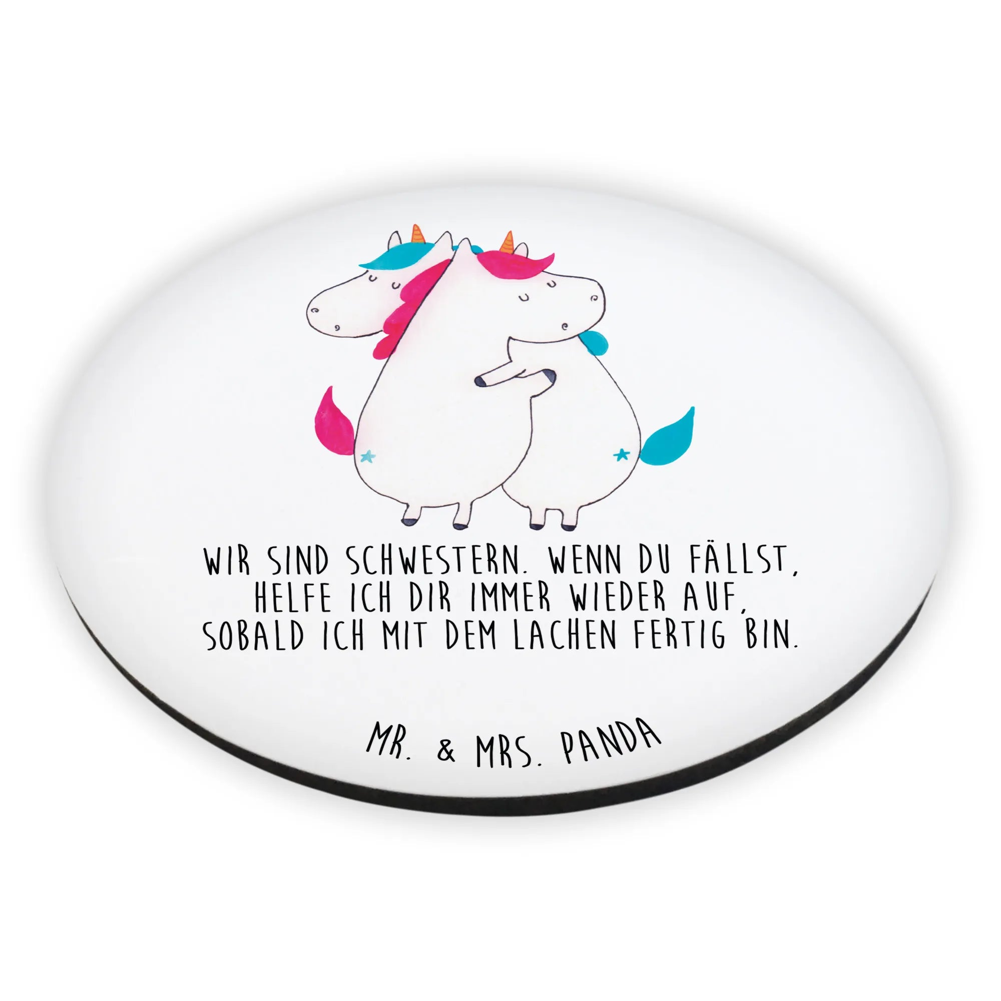 Der Rund Magnet "Einhörner Umarmen" aus der zauberhaften Einhorn-Kollektion von Mr. & Mrs. Panda ist das perfekte Geschenk für all deine Lieblingsmenschen, insbesondere für Schwestern und beste Freundinnen. Mit seinen bunten und lebhaften Farben bringt er Freude in jeden Kühlschrank und auf jedes Whiteboard. Der Magnet zeigt zwei süße Einhörner, die sich herzlich umarmen – ein Motiv, das nicht nur bezaubert, sondern auch symbolisiert, wie wichtig Geschwister und Freundschaften sind. Mit dem liebevollen Spruch "Wir sind Schwestern. Wenn du fällst, helfe ich dir immer wieder auf, sobald ich mit dem Lachen fertig bin." vermittelt dieser Magnet eine Botschaft der Unterstützung und der Liebe, die jedes Herz erwärmt.