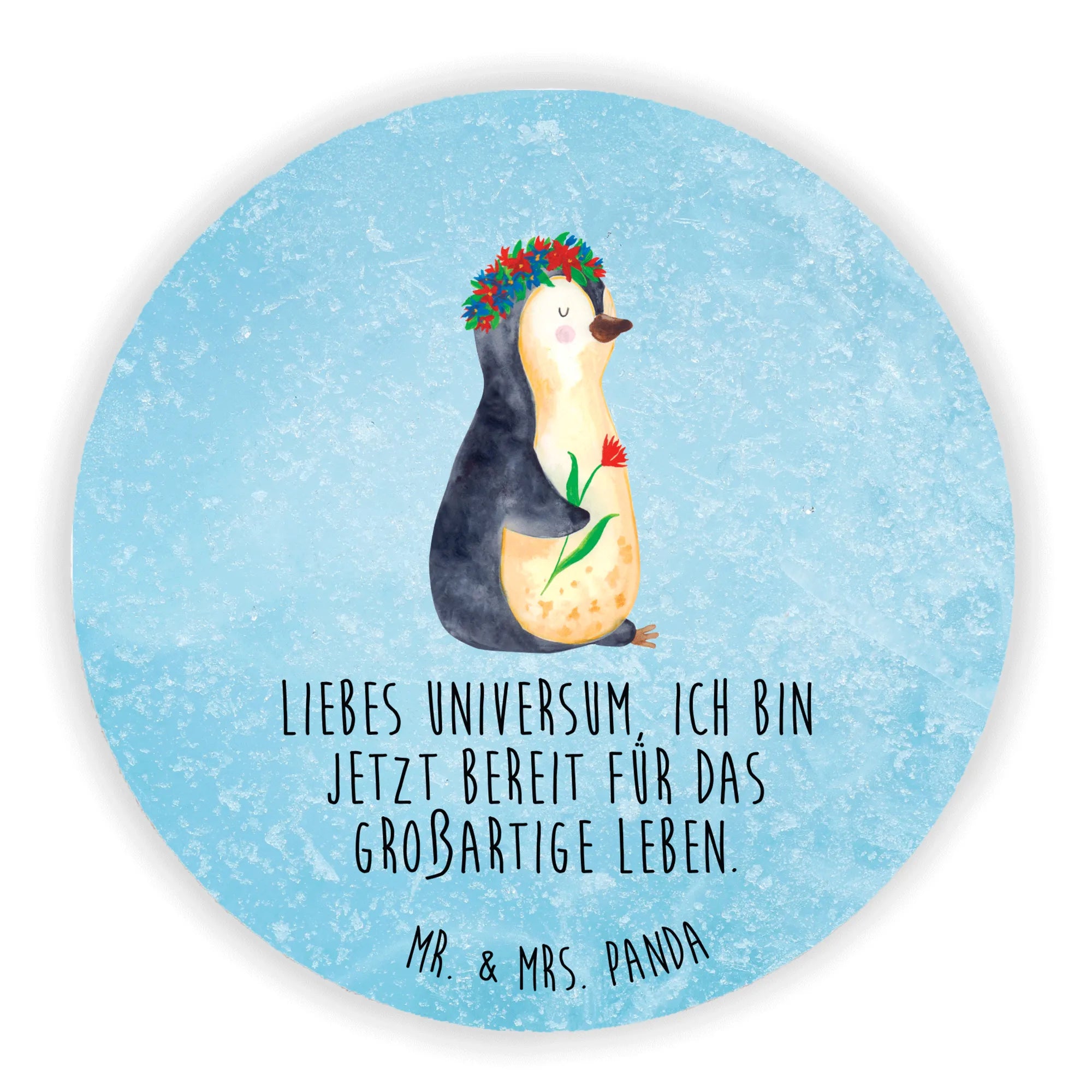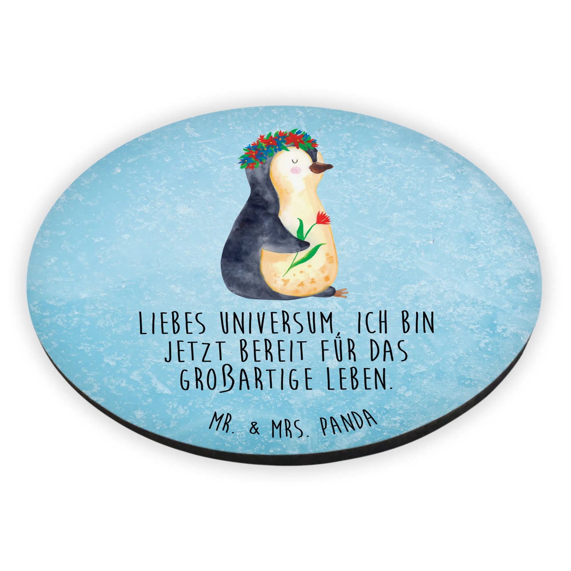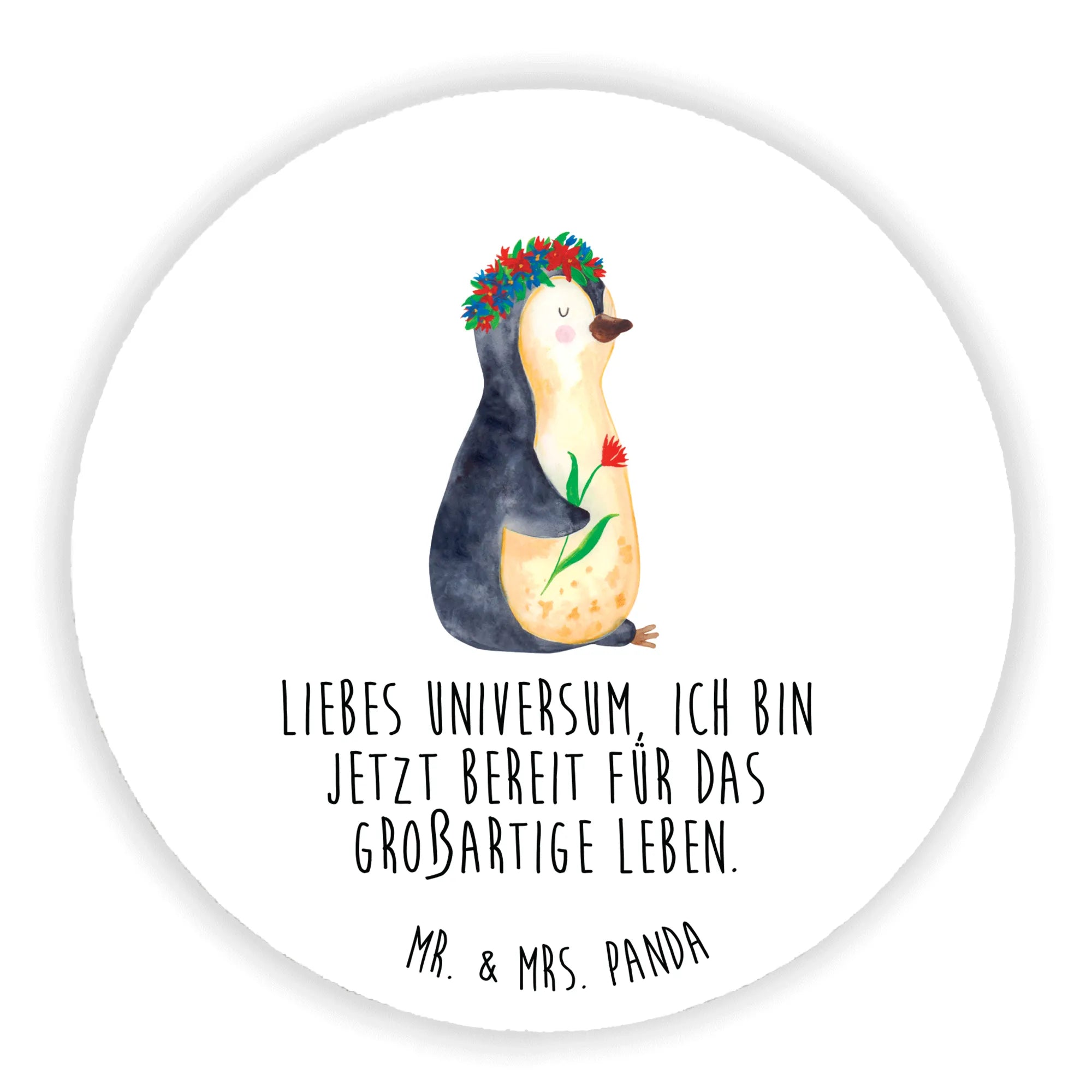 Der Rund Magnet "Pinguin Blumenkranz" von Mr. & Mrs. Panda ist das perfekte Geschenk für alle, die niedliche und motivierende Deko lieben! Mit einem entzückenden Pinguin, der einen Blumenkranz trägt und einer Blume in der Hand, zaubert dieser Magnet ein Lächeln auf jedes Gesicht. Der Slogan "Liebes Universum, ich bin jetzt bereit für das großartige Leben." unterstreicht die positive Botschaft und ist eine wunderbare Erinnerung an Lebensfreude und Motivation.