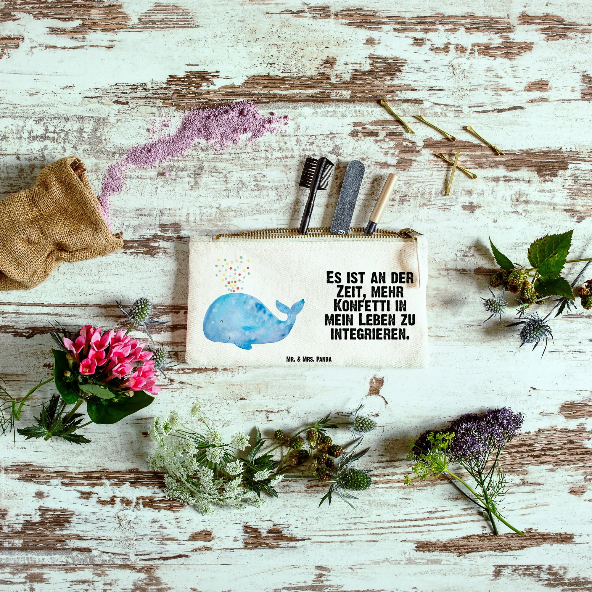 Suchst du nach dem perfekten Geschenk für deinen Freund oder eine Freundin, die das Meer liebt? Die Schminktasche Wal Konfetti aus der zauberhaften Meerestiere Kollektion von Mr. & Mrs. Panda ist die ideale Wahl!