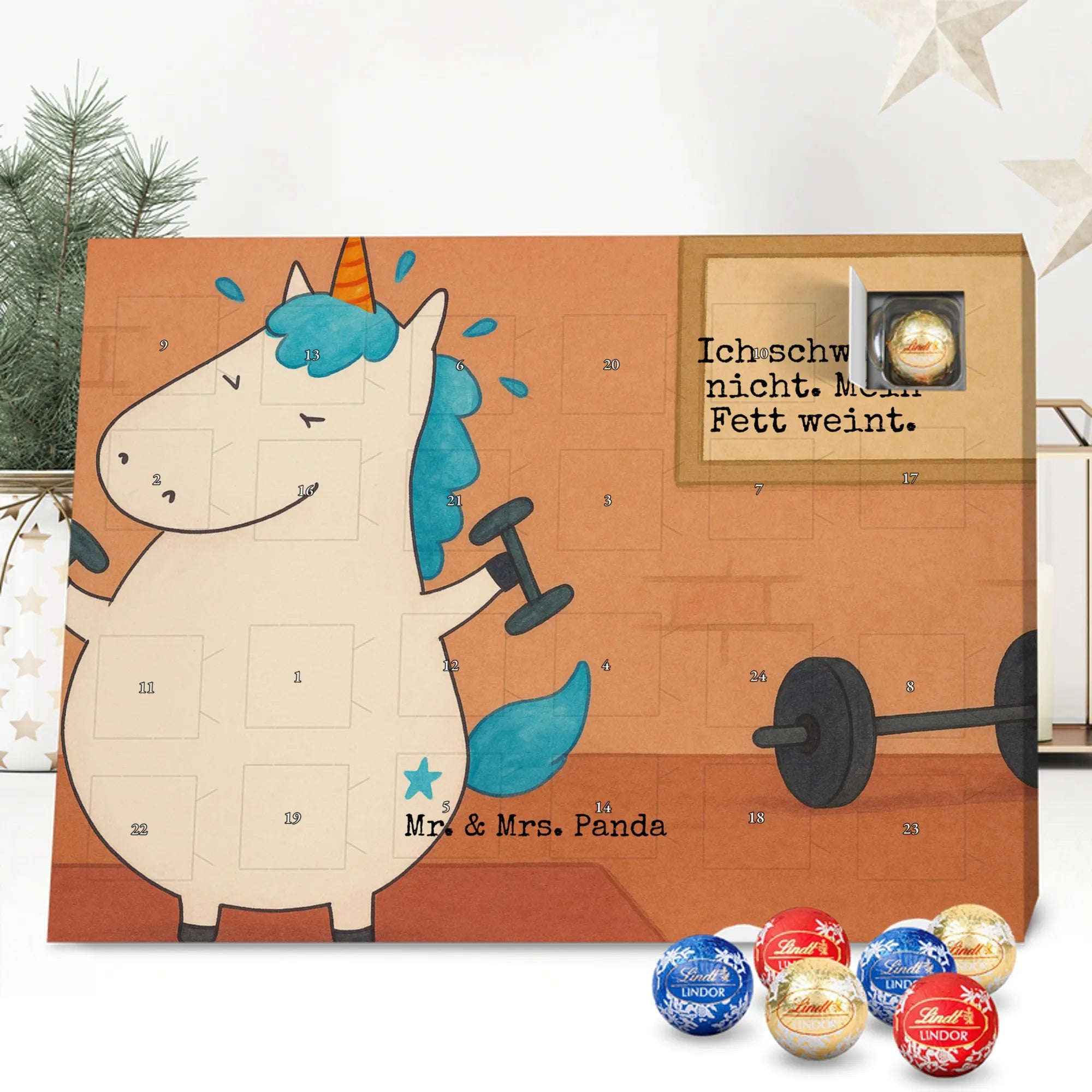 Unser liebevoller Schokoladen Adventskalender von Mr. & Mrs. Panda ist perfekt für alle, die sich eine fröhliche und süße Adventszeit wünschen. Aufwendig bedruckt mit unseren typischen Motiven & Sprüchen, nicht personalisierbar – dafür aber unglaublich hübsch anzusehen. Die brillante Druckqualität mit seidenmatter Oberflächenveredelung verleiht dem Kalender ein edles Aussehen, und die bedruckten Seitenflächen runden das Design ab. Maße: 233 mm x 178 mm x 24 mm. Besonderheit: kann aufgehängt oder aufgestellt werden, so bleibt er flexibel für deinen Deko-Stil. Gefüllt mit Lindt Lindor: 24 einzeln verpackte Markenschokoladen Kugeln in drei leckeren Sorten – Vollmilch, Feinherb und Weiße Schokolade – sorgen für tägliche Genussmomente. Zutaten: Zucker, pflanzliches Fett (Kokosnuss, Palmkern), Kakaobutter, Vollmilchpulver, Kakaomasse, Milchzucker, Magermilchpulver, Butterreinfett, Emulgator (Sojalecithin), Gerstenmalzextrakt, Aromen. Besondere Hinweise: Kann Haselnüsse und Mandeln enthalten. Ein tolles Geschenk oder eine hübsche Dekoration – unser Schokoladen Adventskalender macht die Wartezeit bis Weihnachten noch schöner!