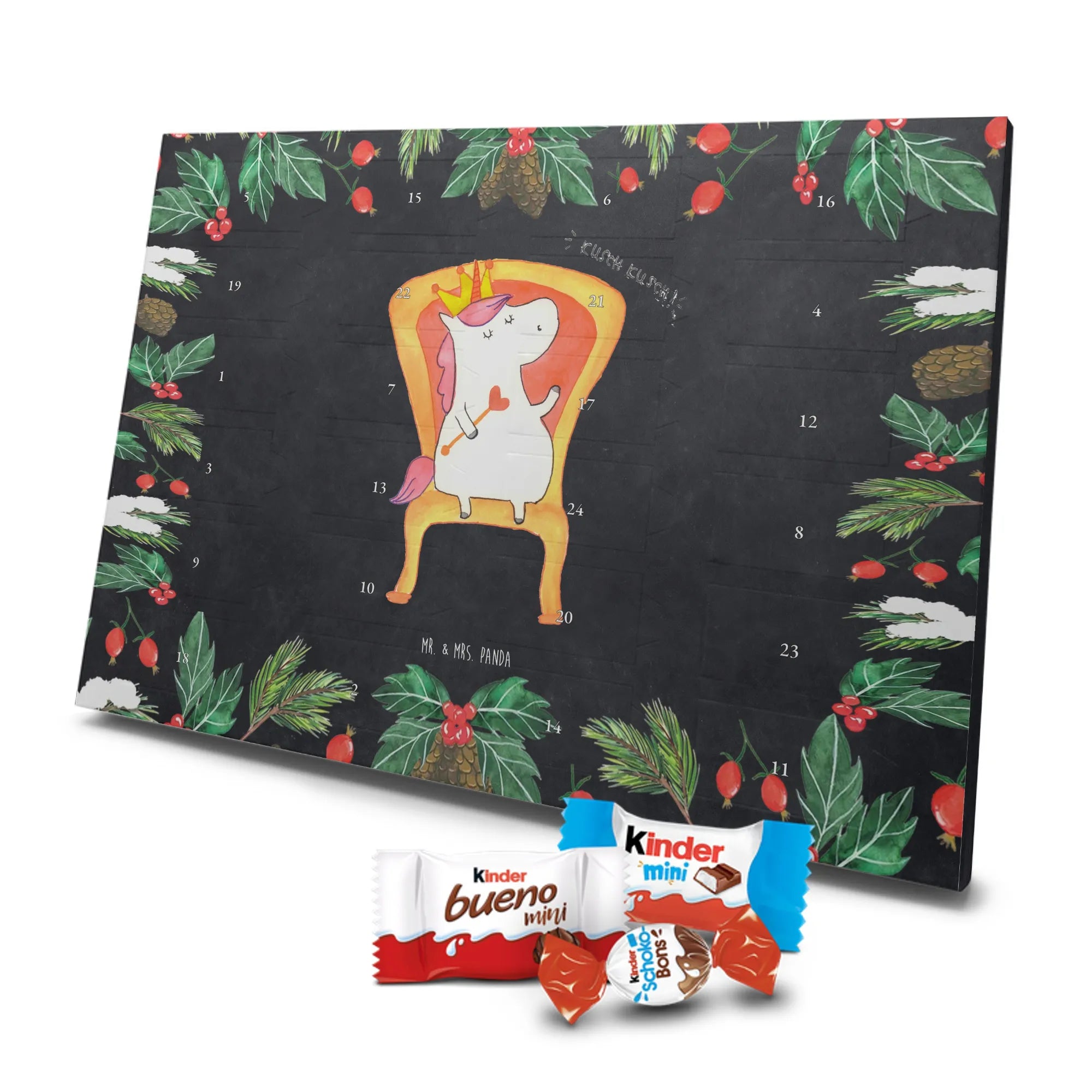Schoko Adventskalender von Mr. & Mrs. Panda – die charmante Art, sich oder anderen die Adventszeit zu versüßen. Der Kalender ist bedruckt mit wunderschönen Motiven & Sprüchen von Mr. & Mrs. Panda und nicht personalisierbar. Wir legen Wert auf brillante Druckqualität mit seidenmatter Oberflächenveredelung sowie auf bedruckte Seitenflächen für ein stimmiges Gesamtbild. Maße: 355 mm x 245 mm x 11 mm. Besonders praktisch: kann aufgehängt oder aufgestellt werden und passt so in jede Wohnung. Gefüllt mit Markenname Schokolade: Adventskalender gefüllt mit kinder® Schokolade. Inhalt: kinder® Schoko-Bons, kinder® Bueno mini und kinder® Schokolade mini. Die 24 Türchen sind mit kleinen Schoko-Überraschungen bestückt und schaffen jeden Tag Vorfreude. Ob als Geschenk für Kinder, Partner oder als nette Aufmerksamkeit für Kolleginnen und Kollegen – dieser Kalender macht Freude. Robust, schön gestaltet und sofort einsatzbereit für die süßeste Zeit des Jahres!