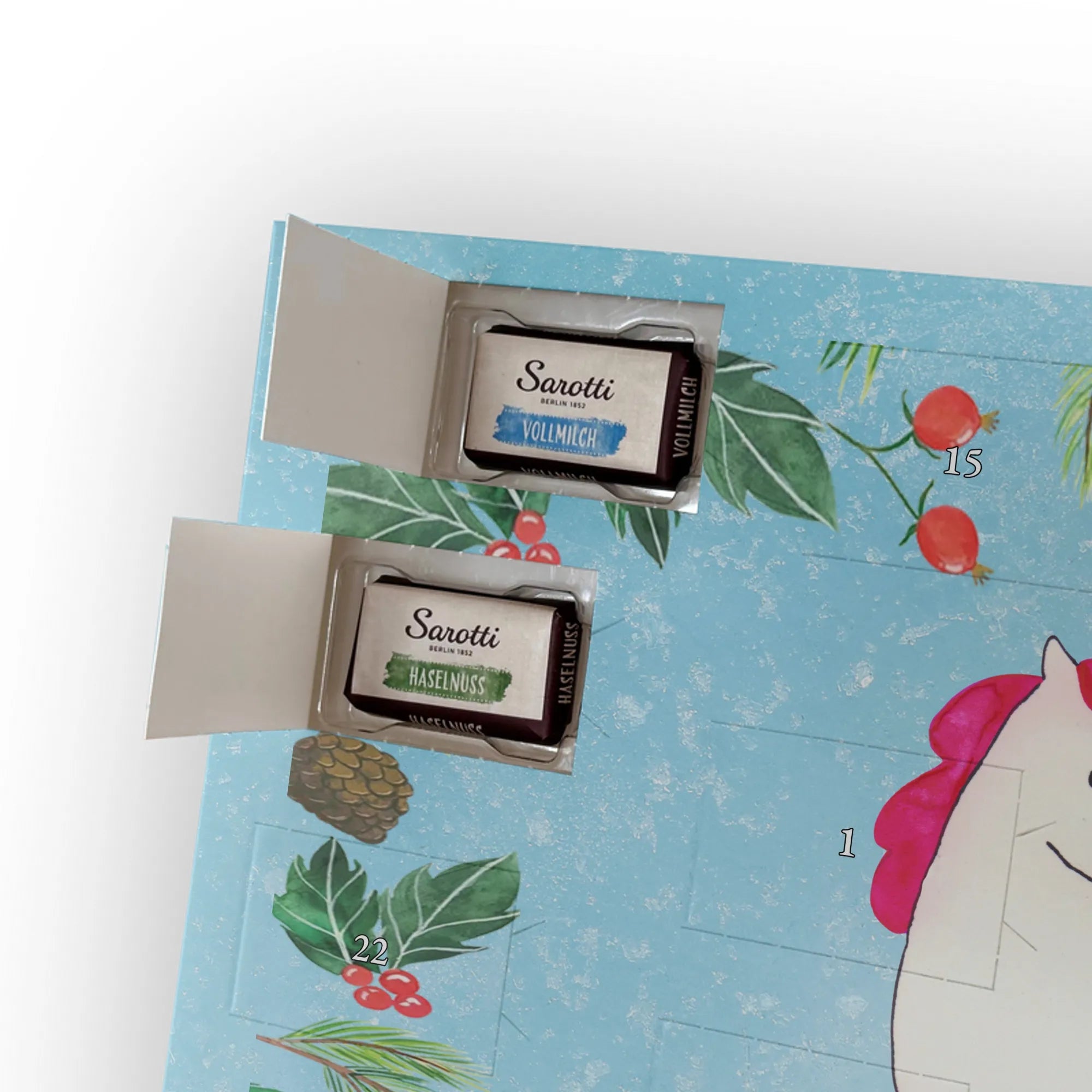 Feiere die Adventszeit mit dem liebevoll gestalteten Schoko Adventskalender von Mr. & Mrs. Panda. Mit zauberhaften Motiven und Sprüchen bedruckt, besticht der Kalender durch brillante Farben und eine seidenmatte Oberflächenveredelung. Die bedruckten Seitenflächen sorgen für ein stimmiges Gesamtbild, das sich perfekt in deine Weihnachtsdeko einfügt. Der Kalender ist nicht personalisierbar, bietet dir aber die Freiheit, ihn aufzuhängen oder aufzustellen. Hinter den Türchen findest du 24 einzeln verpackte Schokoladentäfelchen in vier beliebten Geschmacksrichtungen – Vollmilch, Nougat, Zartbitter und Haselnuss – von Sarotti® und Confiserie Heidel®. Insgesamt enthält der Kalender 107 g Markenschokolade. Maße: 355 mm x 245 mm x 11 mm – ideal dimensioniert für Regal, Tisch oder Fensterbank. Verschenke liebevolle Vorfreude und kleine Genussmomente: dieser Schoko Adventskalender vereint schönes Design mit hochwertiger Markenschokolade und ist ein tolles Mitbringsel oder Geschenk für Freunde und Familie.