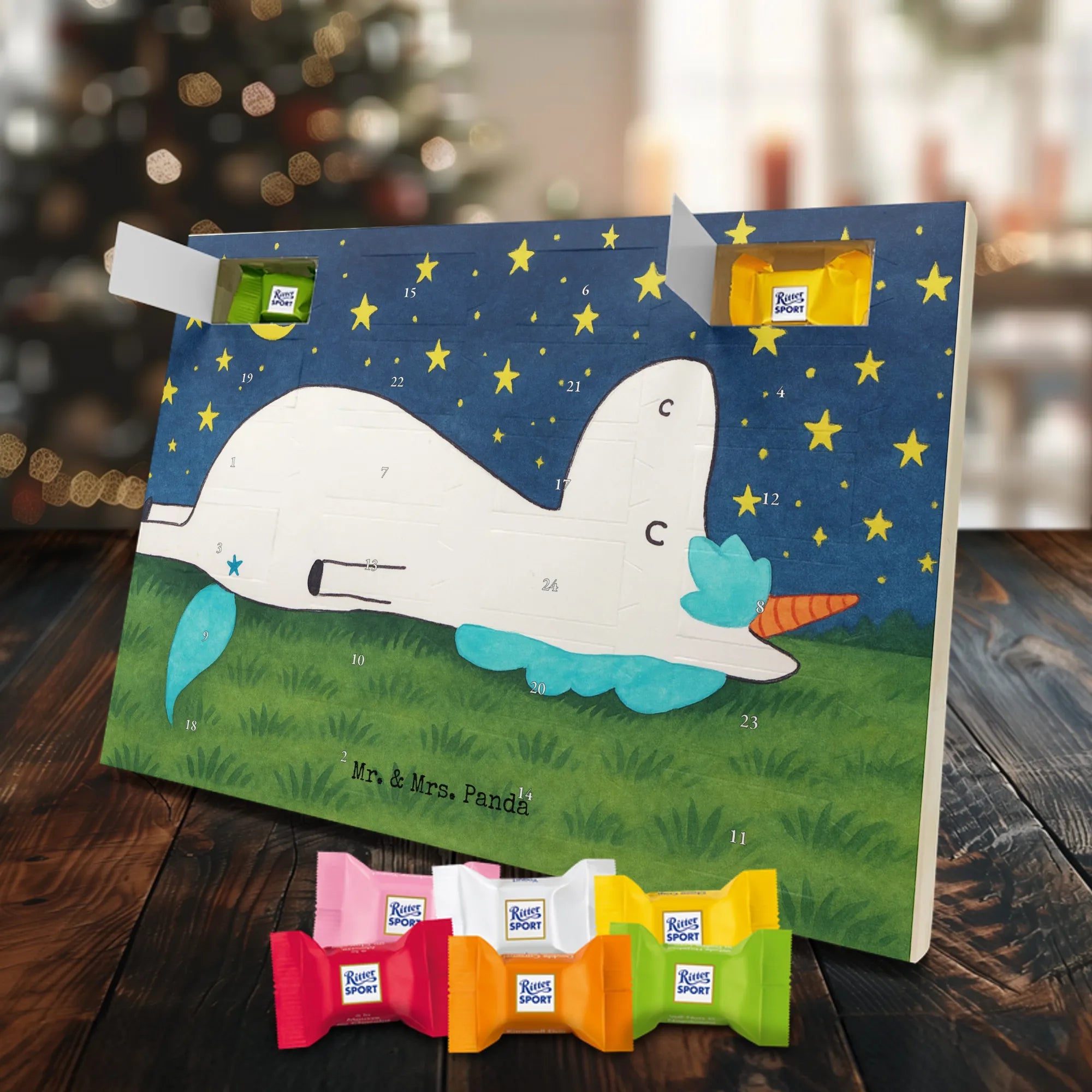 Adventskalender Schokolade von Mr. & Mrs. Panda – eine liebevolle Kombination aus hübschem Design und süßem Inhalt. Der Kalender ist bedruckt mit wunderschönen Motiven & Sprüchen von Mr. & Mrs. Panda und besticht durch brillante Druckqualität mit seidenmatter Oberflächenveredelung. Die Seitenflächen sind ebenfalls bedruckt, wodurch der Kalender rundum ein Hingucker ist. Er ist nicht personalisierbar. Maße: 325 mm x 225 mm x 27 mm. Besonders praktisch: Du kannst ihn sowohl aufgehängt als auch aufgestellt nutzen, je nachdem, wo er bei dir am schönsten wirkt. Gefüllt ist der Kalender mit Ritter Sport Schokowürfeln in verführerischen Sorten – Mousse au Chocolat, Schoko Crisp, Voll-Nuss in Nougatcreme, Karamell Duo, Joghurt und Erdbeer-Joghurt. Wichtiger Hinweis: Es handelt sich um einen Kalender gefüllt mit Ritter Sport Schokolade, nicht um einen Kalender der Marke Ritter Sport. Schenke deinen Liebsten oder dir selbst tägliche Schokoglücksmomente mit diesem charmanten Adventskalender.