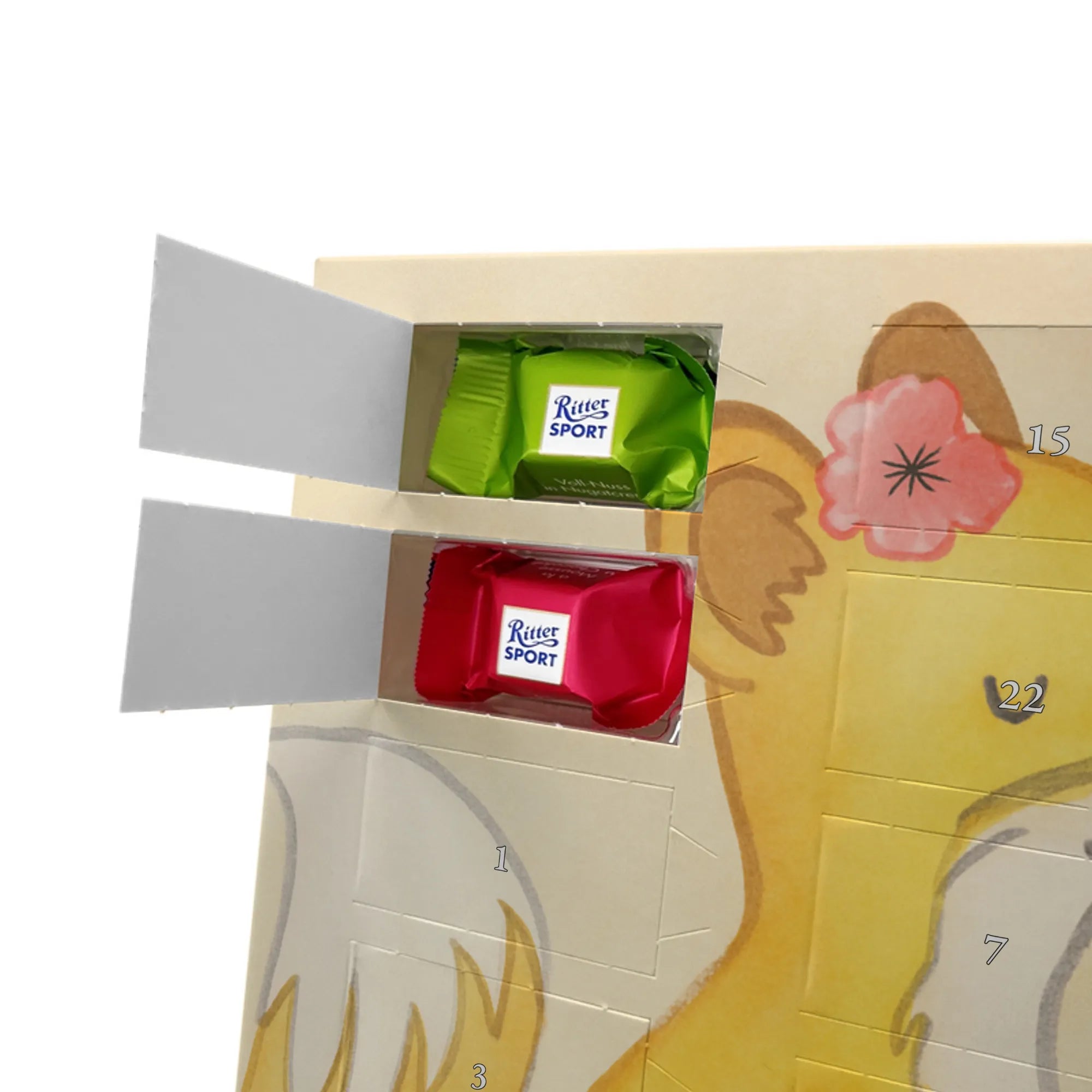 Unser zauberhafter Schoko Adventskalender von Mr. & Mrs. Panda bringt dir die Vorweihnachtszeit mit Liebe und Charme. Der Kalender ist bedruckt mit wunderschönen Motiven & Sprüchen von Mr. & Mrs. Panda und überrascht dich hinter jedem Türchen. Er ist nicht personalisierbar und kommt in brillanter Druckqualität mit seidenmatter Oberflächenveredelung – so sehen die Illustrationen einfach himmlisch aus. Die Seitenflächen sind ebenfalls bedruckt, sodass sich der Kalender von allen Seiten hübsch präsentiert. Maße: 325 mm x 225 mm x 27 mm. Eine besondere Eigenschaft: Du kannst ihn aufgehängt oder aufgestellt verwenden, je nachdem, wo er bei dir am besten zur Geltung kommt. Gefüllt ist der Kalender mit Ritter Sport Schokowürfeln in leckeren Geschmacksrichtungen: Mousse au Chocolat, Schoko Crisp, Voll-Nuss in Nougatcreme, Karamell Duo, Joghurt und Erdbeer-Joghurt. Bitte beachte: Es handelt sich um einen Kalender gefüllt mit Ritter Sport Schokolade, nicht um einen Kalender der Marke Ritter Sport. Perfekt als Geschenk für Freunde, Familie oder einfach als süße Belohnung für dich selbst – dieser Schoko Adventskalender macht die Adventszeit jeden Tag ein bisschen süßer.