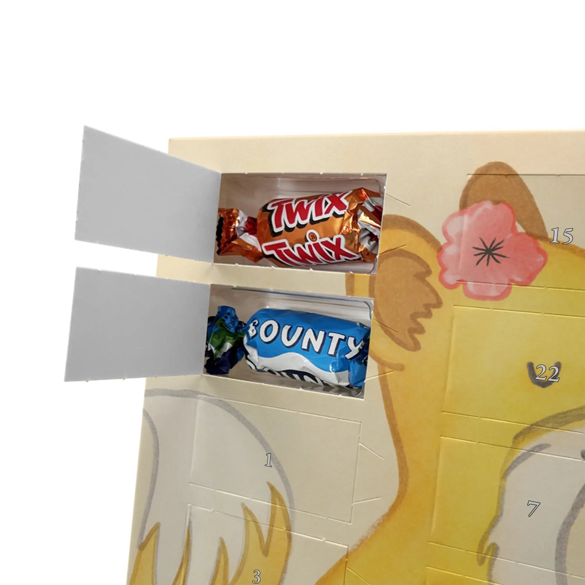 Unser Schoko Adventskalender von Mr. & Mrs. Panda bringt dir und deinen Lieben jede Menge Vorfreude und zauberhafte Momente in die Adventszeit. Der Kalender ist liebevoll bedruckt mit wunderschönen Motiven und frechen Sprüchen im typischen Mr. & Mrs. Panda Stil – ein echter Blickfang auf dem Tisch oder an der Wand. Die brillante Druckqualität kombiniert mit einer seidenmatten Oberflächenveredelung sorgt für edle Farben und ein angenehmes Gefühl beim Anfassen. Auch die Seitenflächen sind bedruckt, sodass der Kalender von allen Seiten hübsch aussieht. Er ist nicht personalisierbar, dafür aber in seiner Gestaltung rundum stimmig. Gefüllt ist der Adventskalender mit 24 hochwertigen Celebrations-Füllungen in acht verschiedenen Sorten: Maltesers, Mars, Snickers, Twix, Milky Way, Bounty, Galaxy und Galaxy Caramel — so ist für jede Naschkatze etwas dabei. Die Besonderheit: Du kannst den Kalender entweder aufstellen oder dank rückseitiger Aufhängung an die Wand hängen. Maße: 325 mm x 225 mm x 27 mm. Ein liebevolles Geschenk für Familie, Freunde oder einfach für dich selbst, das kleine tägliche Glücksmomente schenkt und die Adventszeit versüßt.