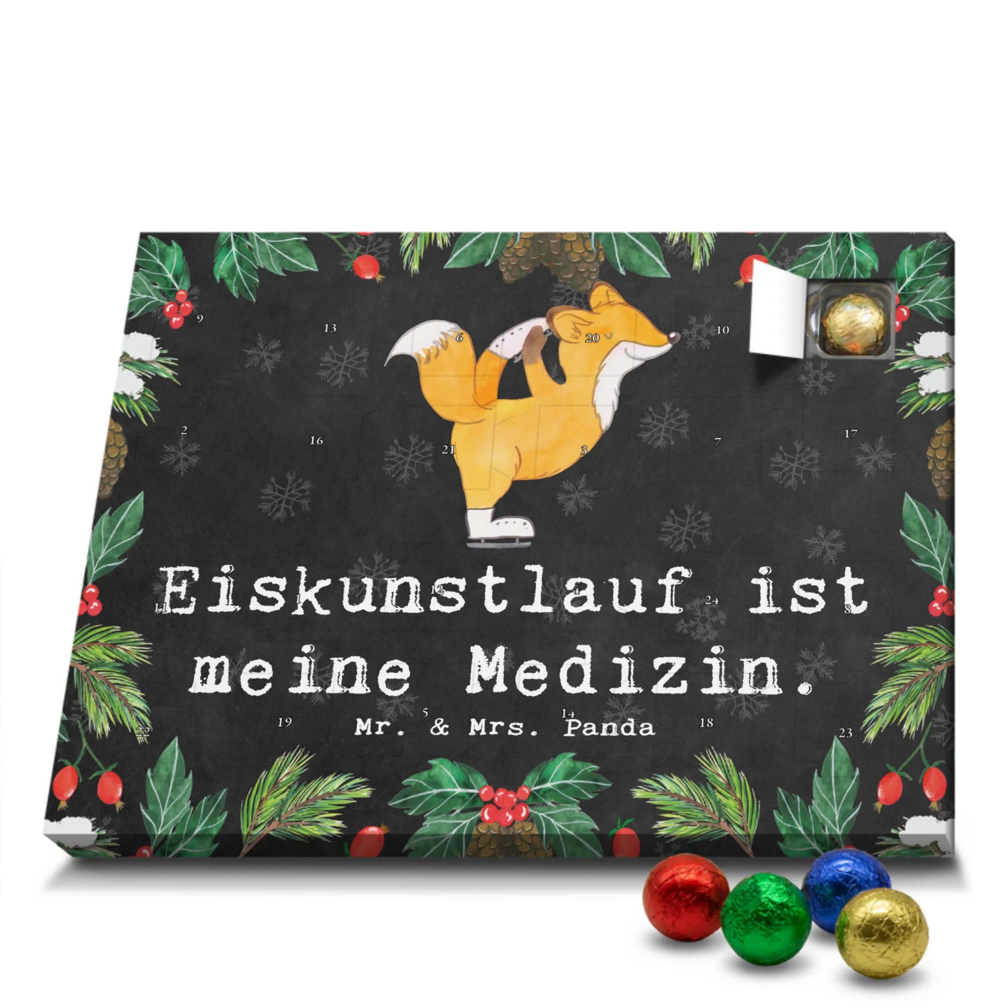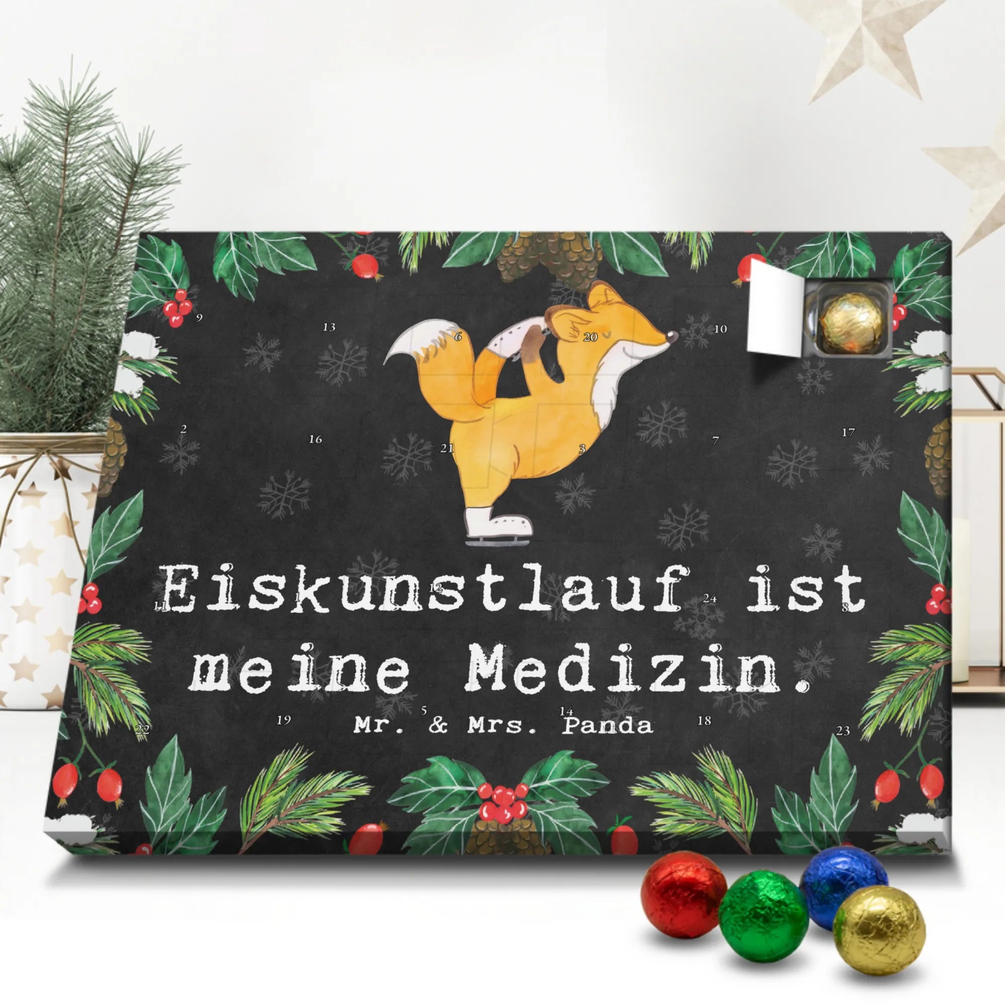 Wunderschöner Schokoladen Adventskalender von Mr. & Mrs. Panda – perfekt, um dir oder deinen Liebsten die Vorweihnachtszeit zu versüßen. Unser liebevoll gestalteter Schoko Adventskalender ist bedruckt mit wunderschönen Motiven & Sprüchen von Mr. & Mrs. Panda und bleibt ein fröhlicher Blickfang auf dem Tisch oder an der Wand. Er ist nicht personalisierbar, dafür aber mit viel Herz und Details gestaltet. Brillante Druckqualität mit seidenmatter Oberflächenveredelung sorgt dafür, dass die Farben strahlen und die Motive besonders edel wirken. Die Seitenflächen sind ebenfalls bedruckt, sodass der Kalender von allen Seiten hübsch aussieht. Maße: 233 mm x 178 mm x 24 mm und durch seine stabile Bauweise kannst du ihn sowohl aufstellen als auch an die Wand hängen – Besonderheit: kann aufgehängt oder aufgestellt werden. Gefüllt mit MARKENNAMEN Schokolade und leckeren Schokoladenkugeln, bietet jeder Tag eine kleine, köstliche Überraschung. Bitte beachte die besonderen Hinweise: (Kann Spuren von Haselnüssen, Mandeln, Gluten und Soja enthalten!), kühl und trocken lagern. Der Kalender eignet sich toll als Geschenk, als Adventsdekoration oder als liebevolle Aufmerksamkeit für Freunde und Familie. Mr. & Mrs. Panda wünscht dir eine süße und gemütliche Vorweihnachtszeit!