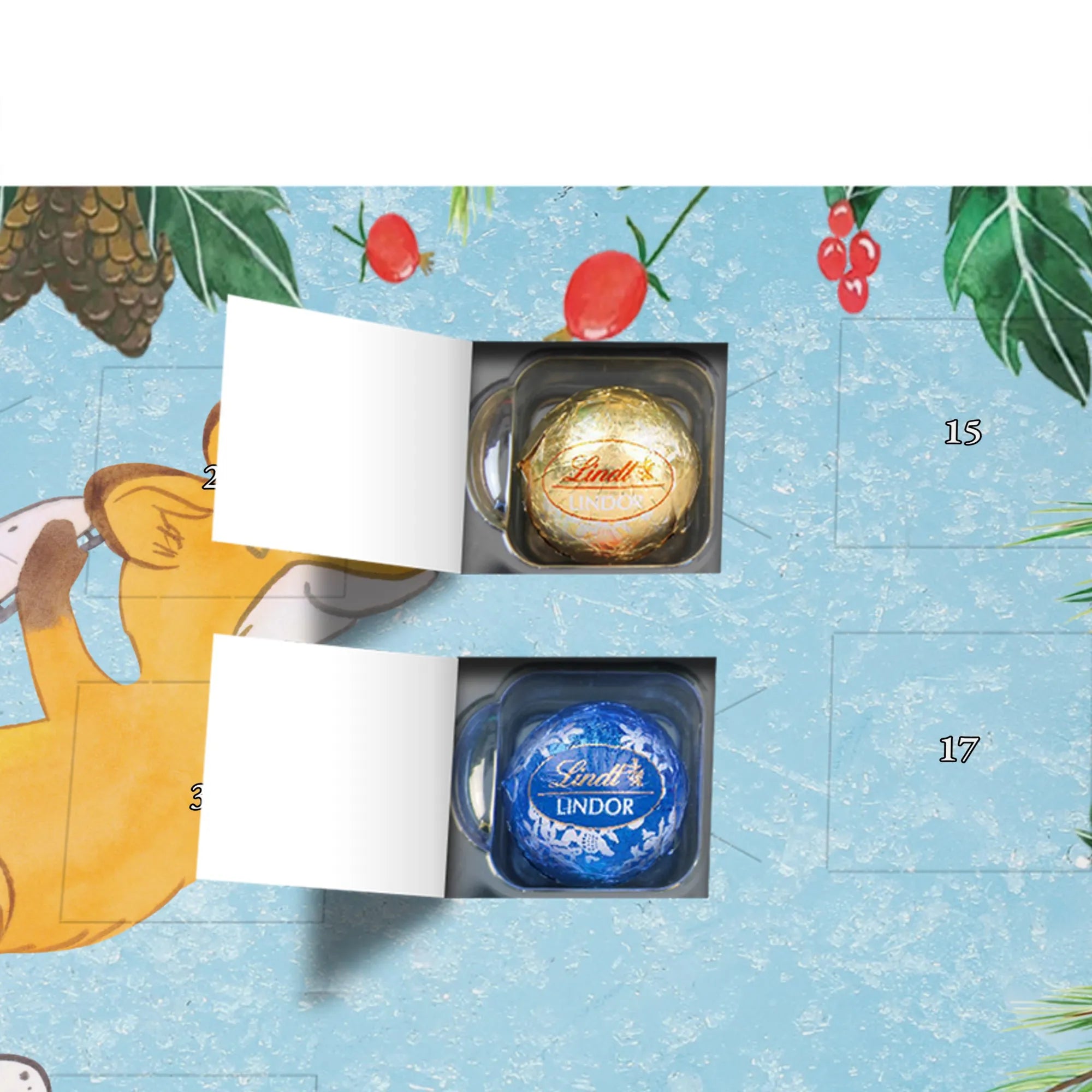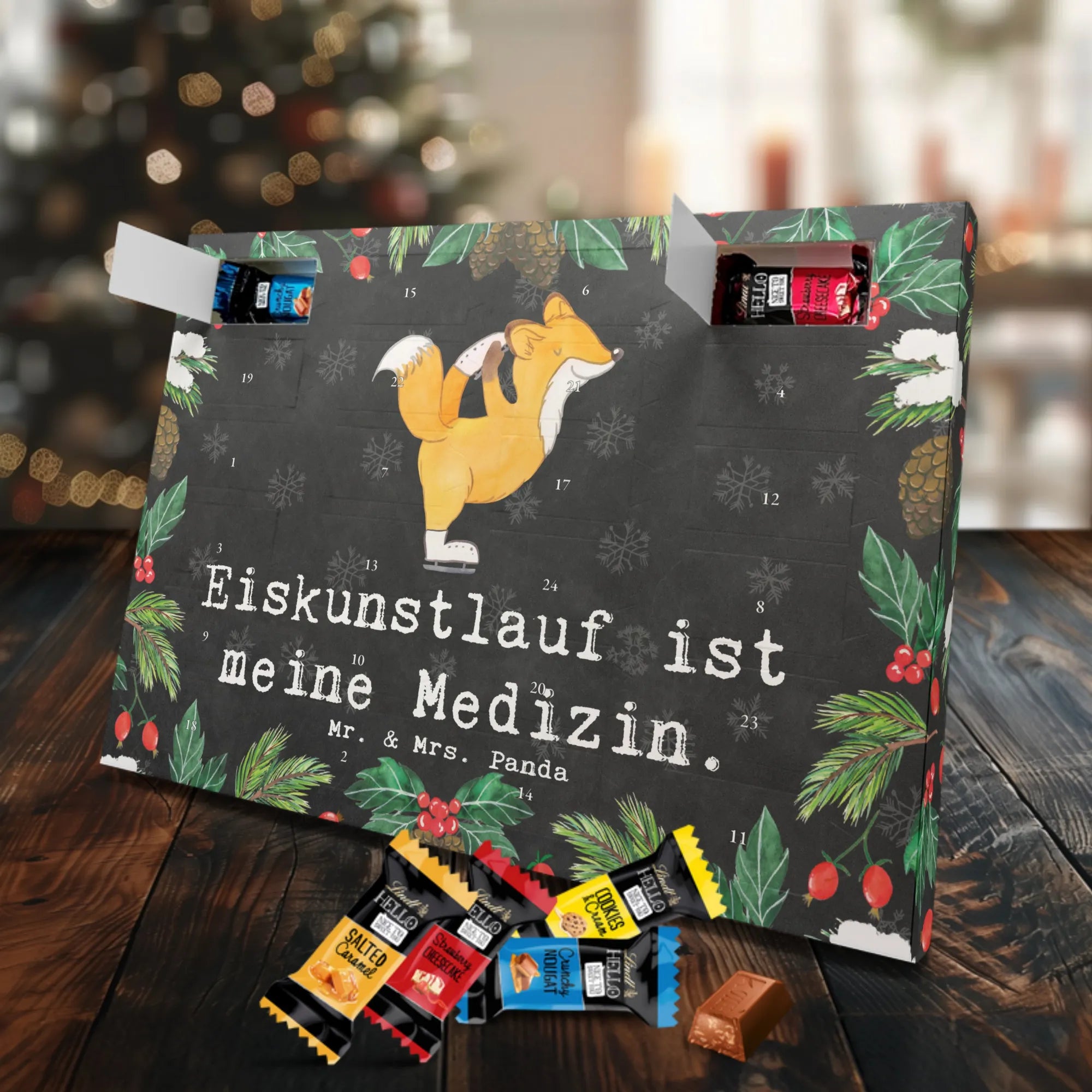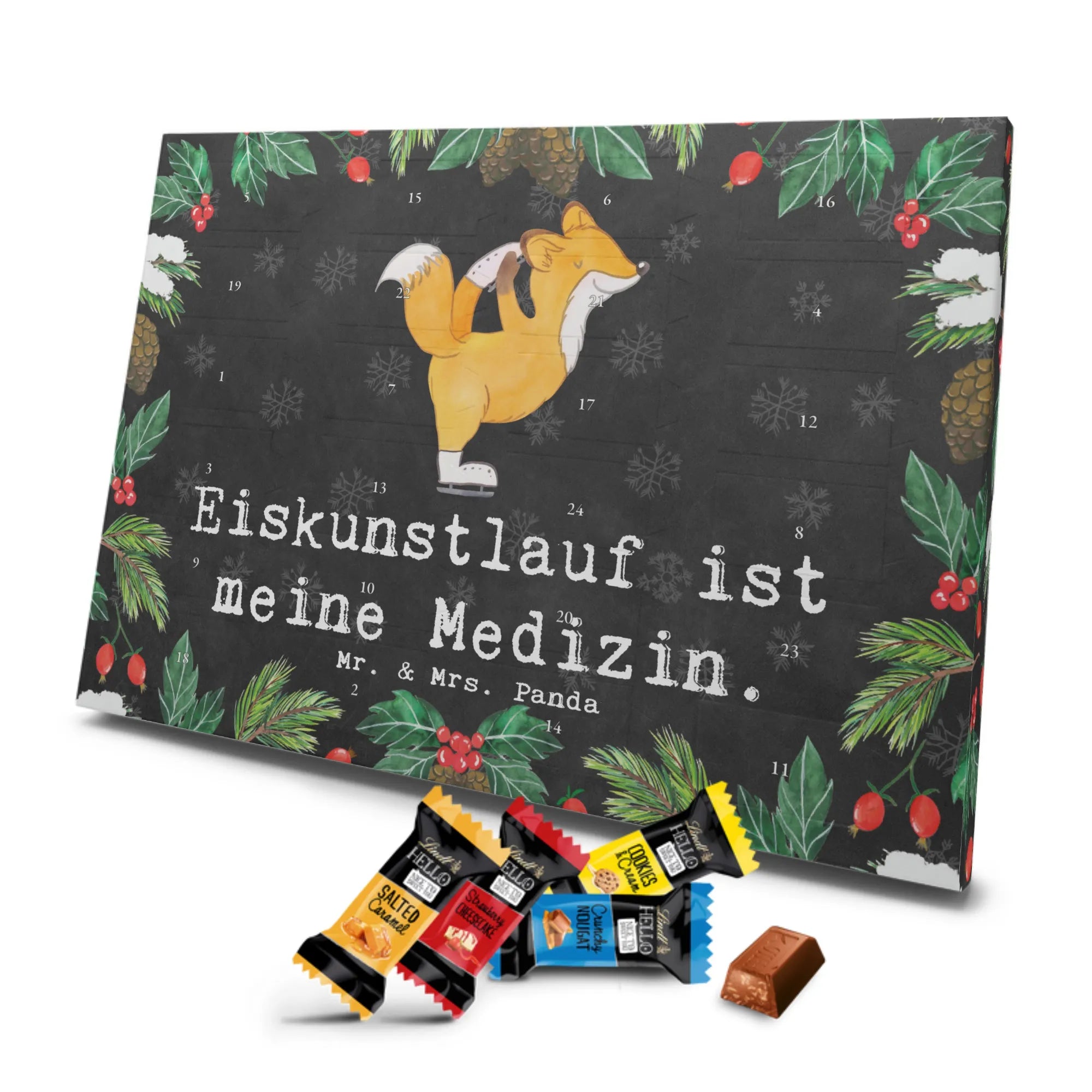 Entdecke den charmanten Schokoladen Adventskalender von Mr. & Mrs. Panda – ein kleines Kunstwerk für alle Schoko-Liebhaber. Der Schoko-Adventskalender ist mit liebevollen Illustrationen und kurzen Sprüchen bedruckt und verbreitet gemütliche Vorfreude auf Weihnachten. Er ist nicht personalisierbar, aber durch die brillante Druckqualität und die seidenmatte Oberflächenveredelung ein echtes Hingucker-Produkt. Auch die Seitenflächen sind bedruckt, was dem Kalender ein rundum schönes Erscheinungsbild verleiht. Maße: 325 mm x 225 mm x 27 mm. Das praktische Design erlaubt es, den Kalender aufzuhängen oder aufzustellen. Gefüllt mit Lindt Hello Schokolade: 24 einzeln verpackte Mini Sticks in vier leckeren Sorten – Karamell-Schokoladenkuchen, Kekse, Knuspriger Nougat und Erdbeer-Cheesecake. Zutaten sind u. a. Zucker, Kakaobutter, Vollmilchpulver, Haselnüsse und weitere Zutaten; Allergene: Milcheiweiß, Milchzucker, Soja, Weizen, Haselnüsse; kann Spuren von Mandeln und anderen Schalenfrüchten enthalten. Ideal als Geschenk oder zum Selbernaschen – einfach jeden Tag ein Türchen öffnen und genießen.
