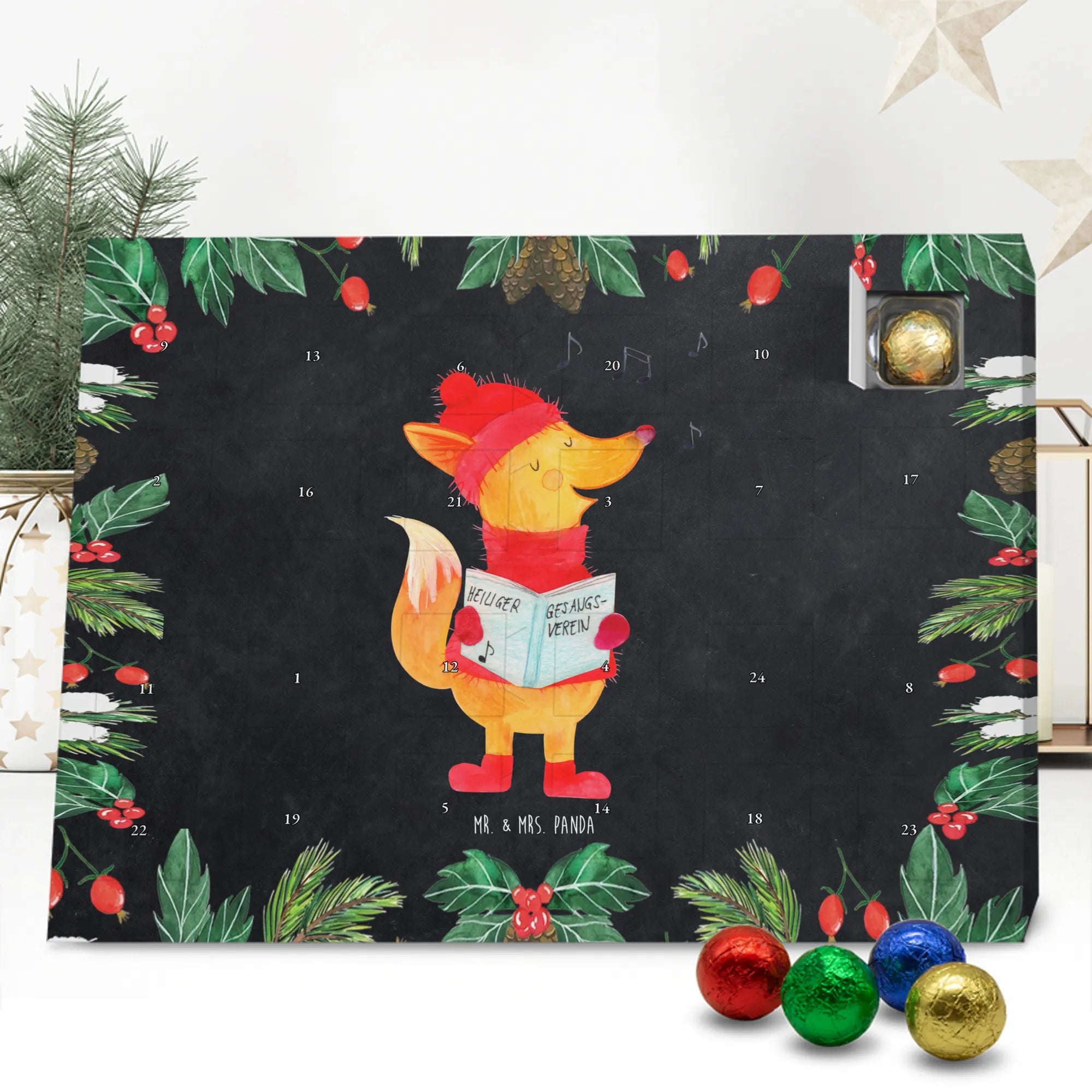 Wunderschöner Schokoladen-Adventskalender von Mr. & Mrs. Panda – süßes Design trifft hochwertige Verarbeitung. Unser Schokoladen-Adventskalender ist bedruckt mit wunderschönen Motiven & Sprüchen von Mr. & Mrs. Panda und nicht personalisierbar, dafür aber mit liebevollen Details gestaltet. Die brillante Druckqualität mit seidenmatter Oberflächenveredelung verleiht dem Kalender ein edles Finish, und auch die Seitenflächen sind bedruckt für einen rundum stimmigen Look. Maße: 233 mm x 178 mm x 24 mm. Die Konstruktion erlaubt sowohl das Aufstellen als auch das Aufhängen – Besonderheit: kann aufgehängt oder aufgestellt werden. Gefüllt mit MARKENNAMEN Schokolade und mit leckeren Schokoladenkugeln bestückt, ist jeder Dezembertag eine kleine Belohnung. Bitte lies die besonderen Hinweise: (Kann Spuren von Haselnüssen, Mandeln, Gluten und Soja enthalten!), kühl und trocken lagern. Ideal als Geschenk, Adventsdekoration oder süße Überraschung für Freunde und Familie. Mr. & Mrs. Panda wünscht dir eine gemütliche und genussvolle Adventszeit!