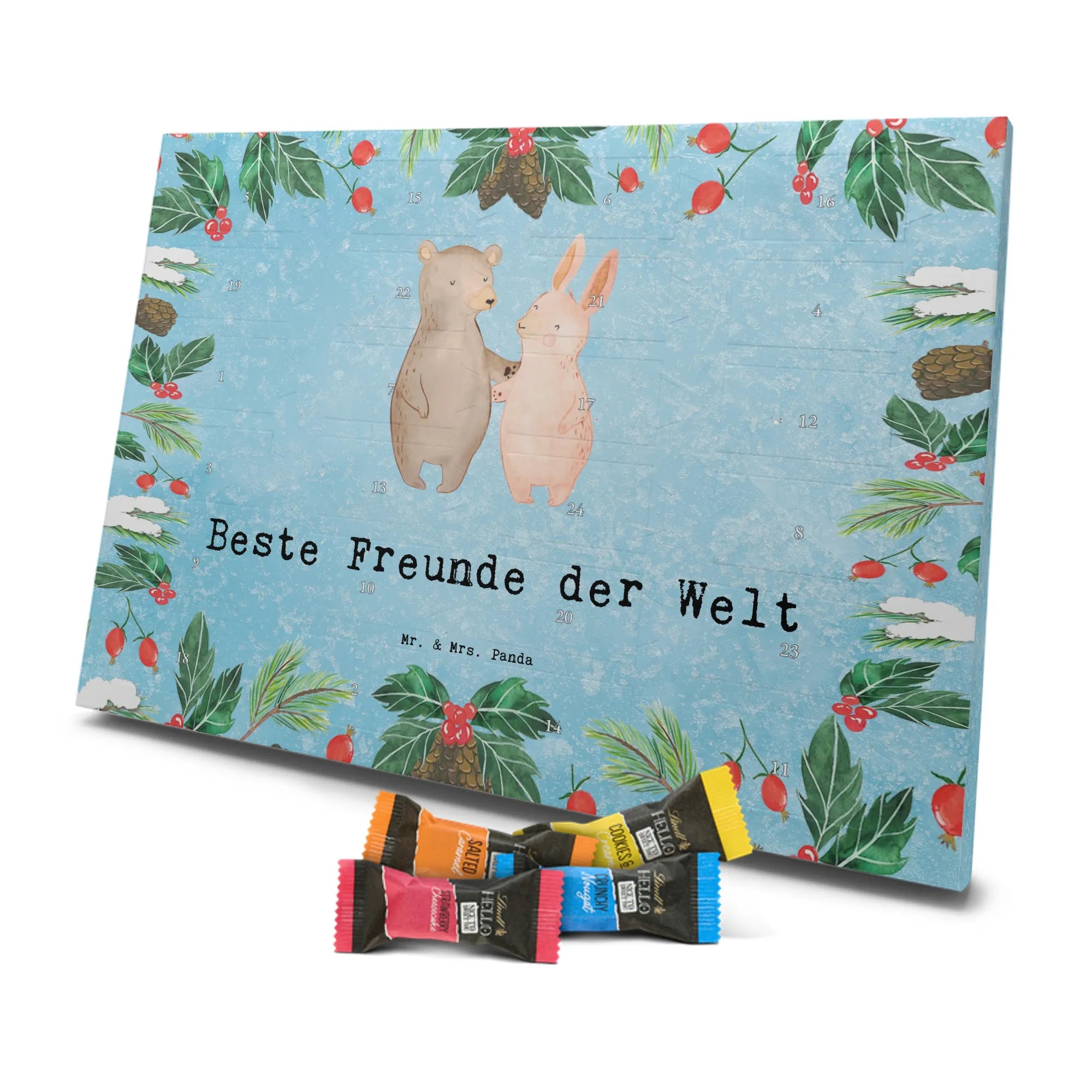 Feier die Adventszeit mit unserem liebevollen Schoko-Adventskalender von Mr. & Mrs. Panda. Jeder Kalender ist mit unseren typischen Motiven und heiteren Sprüchen bedruckt und bringt Vorfreude in dein Zuhause. Der Kalender ist nicht personalisierbar, punktet aber mit brillanter Druckqualität und einer seidenmatten Oberflächenveredelung. Auch die Seitenflächen sind gestaltet, damit das Motiv rundherum wirkt. Maße: 325 mm x 225 mm x 27 mm. Du kannst den Kalender problemlos aufhängen oder aufstellen – praktisch und dekorativ zugleich. Gefüllt mit Lindt Hello Schokolade: 24 einzeln verpackte Mini Sticks in vier beliebten Geschmacksrichtungen: Karamell-Schokoladenkuchen, Kekse, Knuspriger Nougat und Erdbeer-Cheesecake. Zutaten wie Zucker, Kakaobutter, Vollmilchpulver und Haselnüsse sind enthalten; Allergene: Milcheiweiß, Milchzucker, Soja, Weizen, Haselnüsse; kann Spuren anderer Schalenfrüchte, z. B. Mandeln, enthalten. Der Kalender ist eine tolle Geschenkidee für Erwachsene und Kinder – ein täglicher Schoko-Moment in der Adventszeit.