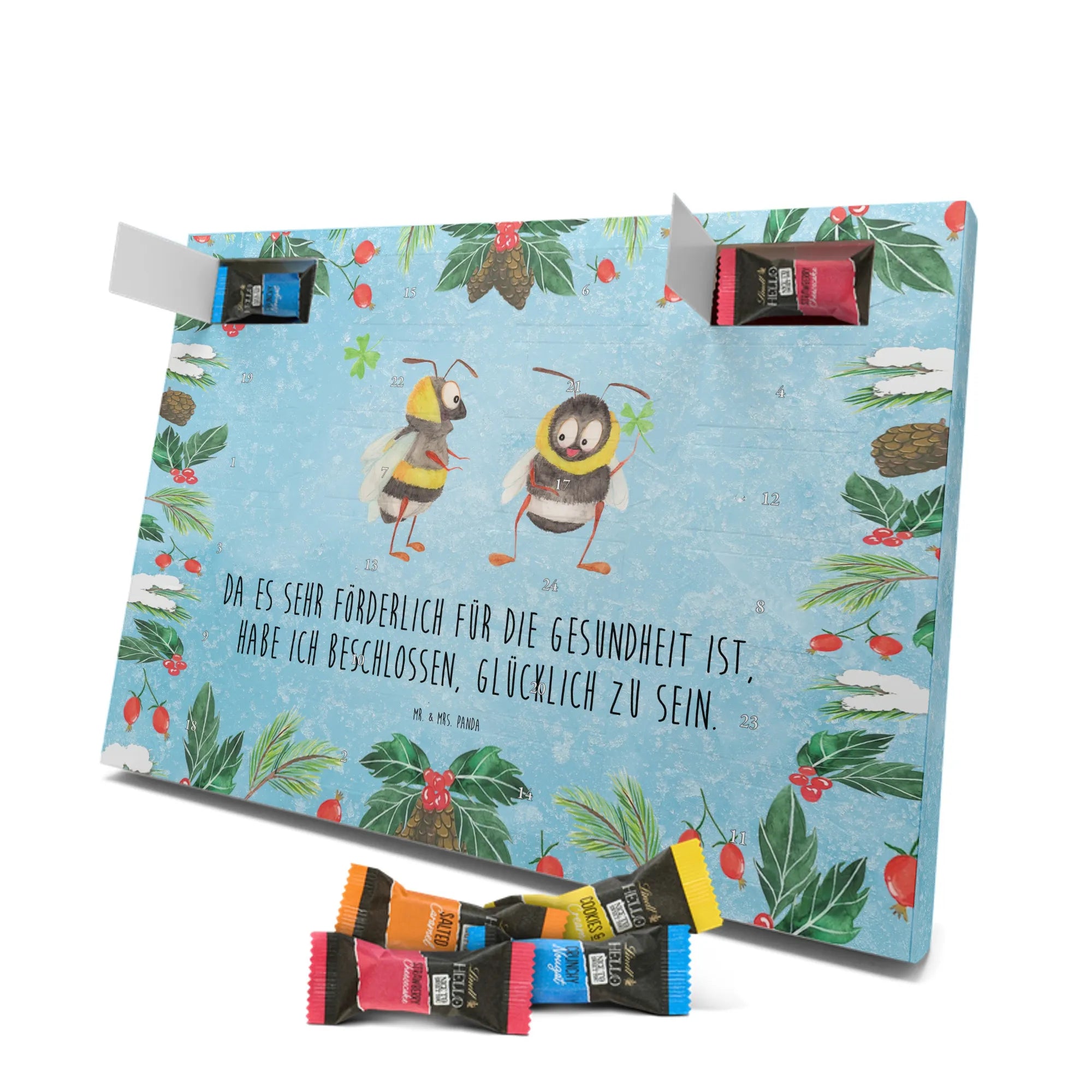 Unser zauberhafter Schoko Adventskalender von Mr. & Mrs. Panda bringt dir die süßeste Vorfreude auf Weihnachten! Dieser liebevoll gestaltete Adventskalender ist bedruckt mit wunderschönen Motiven & Sprüchen von Mr. & Mrs. Panda und ist nicht personalisierbar – dafür aber ein perfektes Geschenk für Freunde und Familie. Brillante Druckqualität mit seidenmatter Oberflächenveredelung sorgt für ein edles Finish, und die bedruckten Seitenflächen machen den Kalender von allen Seiten zu einem Hingucker. Maße: 233 mm x 178 mm x 24 mm. Besonderheit: kann aufgehängt oder aufgestellt werden, je nachdem, wie du ihn präsentieren möchtest. Gefüllt mit Lindt Lindor: 24 einzeln verpackte Markenschokoladen Kugeln in drei verschiedenen Sorten – Vollmilch, Feinherb und Weiße Schokolade – sorgen für abwechslungsreichen Genuss in der Adventszeit. Zutaten: Zucker, pflanzliches Fett (Kokosnuss, Palmkern), Kakaobutter, Vollmilchpulver, Kakaomasse, Milchzucker, Magermilchpulver, Butterreinfett, Emulgator (Sojalecithin), Gerstenmalzextrakt, Aromen. Besondere Hinweise: Kann Haselnüsse und Mandeln enthalten. Unser Schoko Adventskalender verbindet niedliches Design mit hochwertiger Füllung – ideal zum Verschenken oder selbst Naschen. Mr. & Mrs. Panda wünschen dir eine fröhliche und leckere Adventszeit!