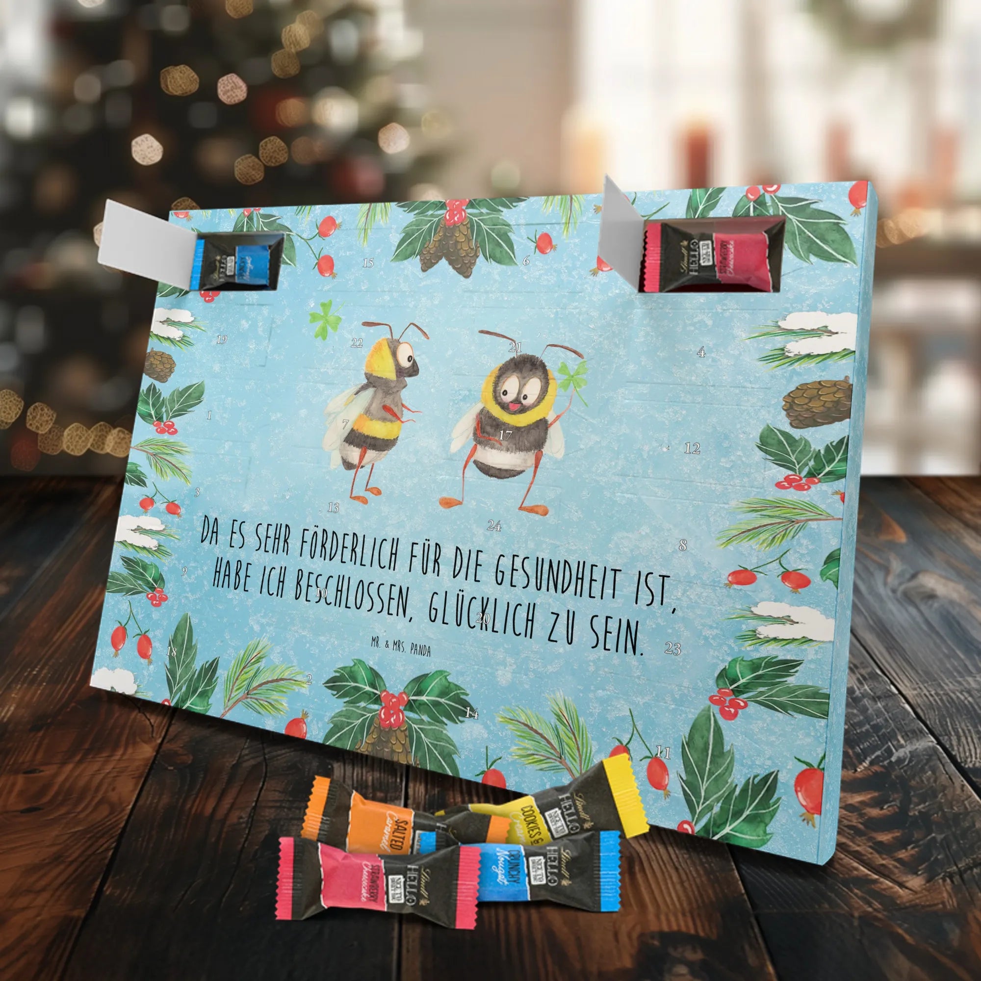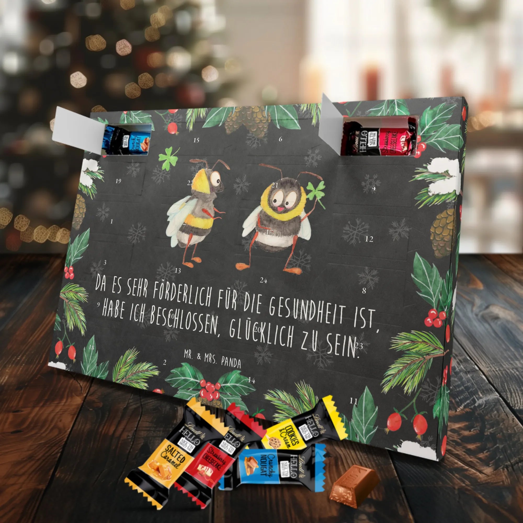 Unser liebevoller Schokoladen Adventskalender von Mr. & Mrs. Panda ist perfekt für alle, die sich eine fröhliche und süße Adventszeit wünschen. Aufwendig bedruckt mit unseren typischen Motiven & Sprüchen, nicht personalisierbar – dafür aber unglaublich hübsch anzusehen. Die brillante Druckqualität mit seidenmatter Oberflächenveredelung verleiht dem Kalender ein edles Aussehen, und die bedruckten Seitenflächen runden das Design ab. Maße: 233 mm x 178 mm x 24 mm. Besonderheit: kann aufgehängt oder aufgestellt werden, so bleibt er flexibel für deinen Deko-Stil. Gefüllt mit Lindt Lindor: 24 einzeln verpackte Markenschokoladen Kugeln in drei leckeren Sorten – Vollmilch, Feinherb und Weiße Schokolade – sorgen für tägliche Genussmomente. Zutaten: Zucker, pflanzliches Fett (Kokosnuss, Palmkern), Kakaobutter, Vollmilchpulver, Kakaomasse, Milchzucker, Magermilchpulver, Butterreinfett, Emulgator (Sojalecithin), Gerstenmalzextrakt, Aromen. Besondere Hinweise: Kann Haselnüsse und Mandeln enthalten. Ein tolles Geschenk oder eine hübsche Dekoration – unser Schokoladen Adventskalender macht die Wartezeit bis Weihnachten noch schöner!