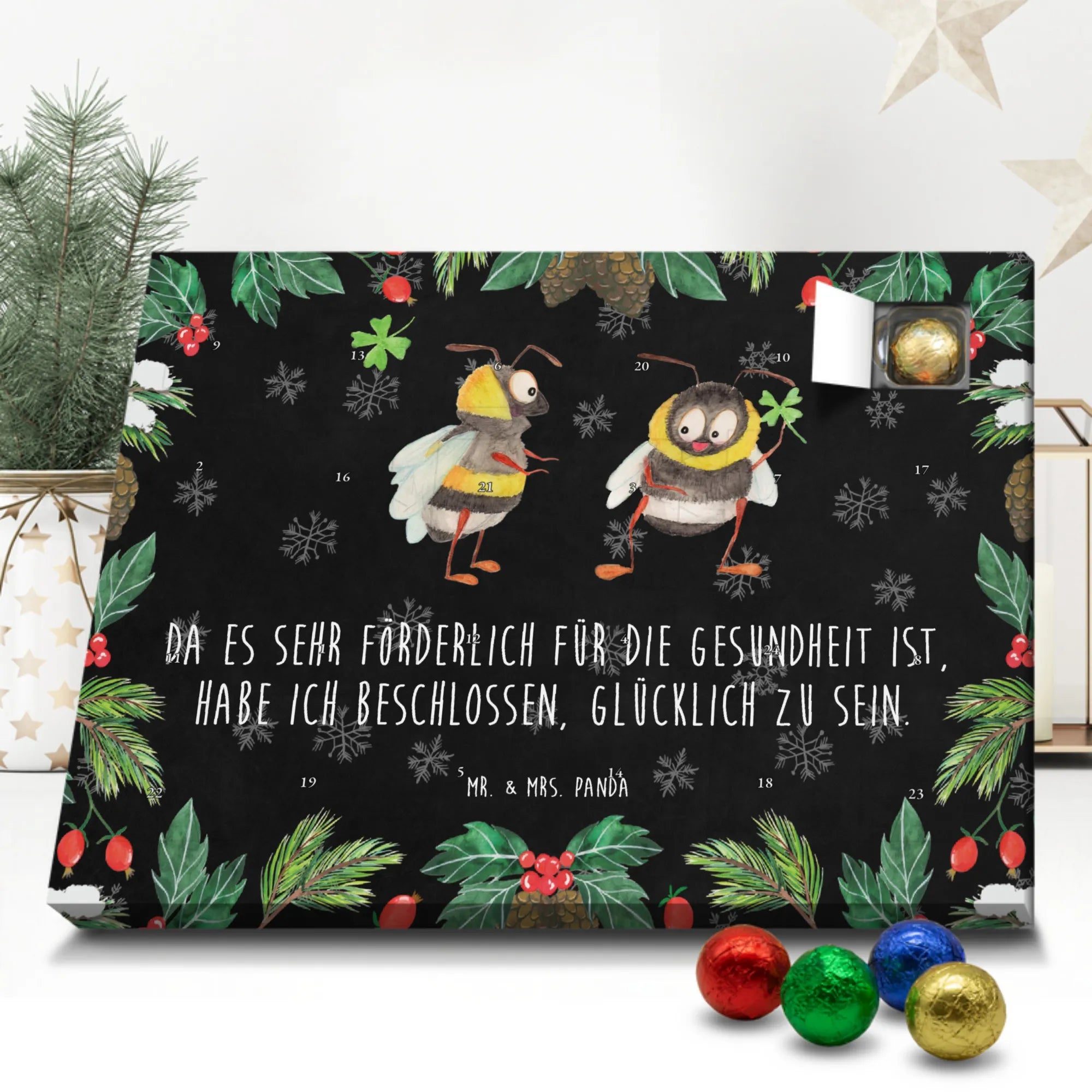 Wunderschöner Schokoladen Adventskalender von Mr. & Mrs. Panda – ein kleines Kunstwerk für deine Adventszeit. Dieser Schokoladen Adventskalender ist mit liebevollen Illustrationen und positiven Sprüchen bedruckt und macht jeden Morgen im Dezember zu einem kleinen Freudenmoment. Der Kalender ist nicht personalisierbar, aber durch die hochwertigen Motive ein persönlicher Ausdruck von Gemütlichkeit. Er überzeugt durch brillante Druckqualität mit seidenmatter Oberflächenveredelung und bedruckte Seitenflächen für einen rundum schönen Look. Maße: 233 mm x 178 mm x 24 mm und das praktische Design erlaubt das Aufhängen oder Aufstellen – Besonderheit: kann aufgehängt oder aufgestellt werden. Gefüllt mit MARKENNAMEN Schokolade und gefüllt mit leckeren Schokoladenkugeln, sorgt er für süße Augenblicke. Bitte achte auf die besonderen Hinweise: (Kann Spuren von Haselnüssen, Mandeln, Gluten und Soja enthalten!), kühl und trocken lagern. Egal ob als Geschenk für Freunde, Familie oder als hübsche Deko für dein Zuhause – dieser Adventskalender bringt Vorfreude und süßen Genuss in den Dezember. Mr. & Mrs. Panda grüßen dich herzlich und wünschen eine zauberhafte Adventszeit!