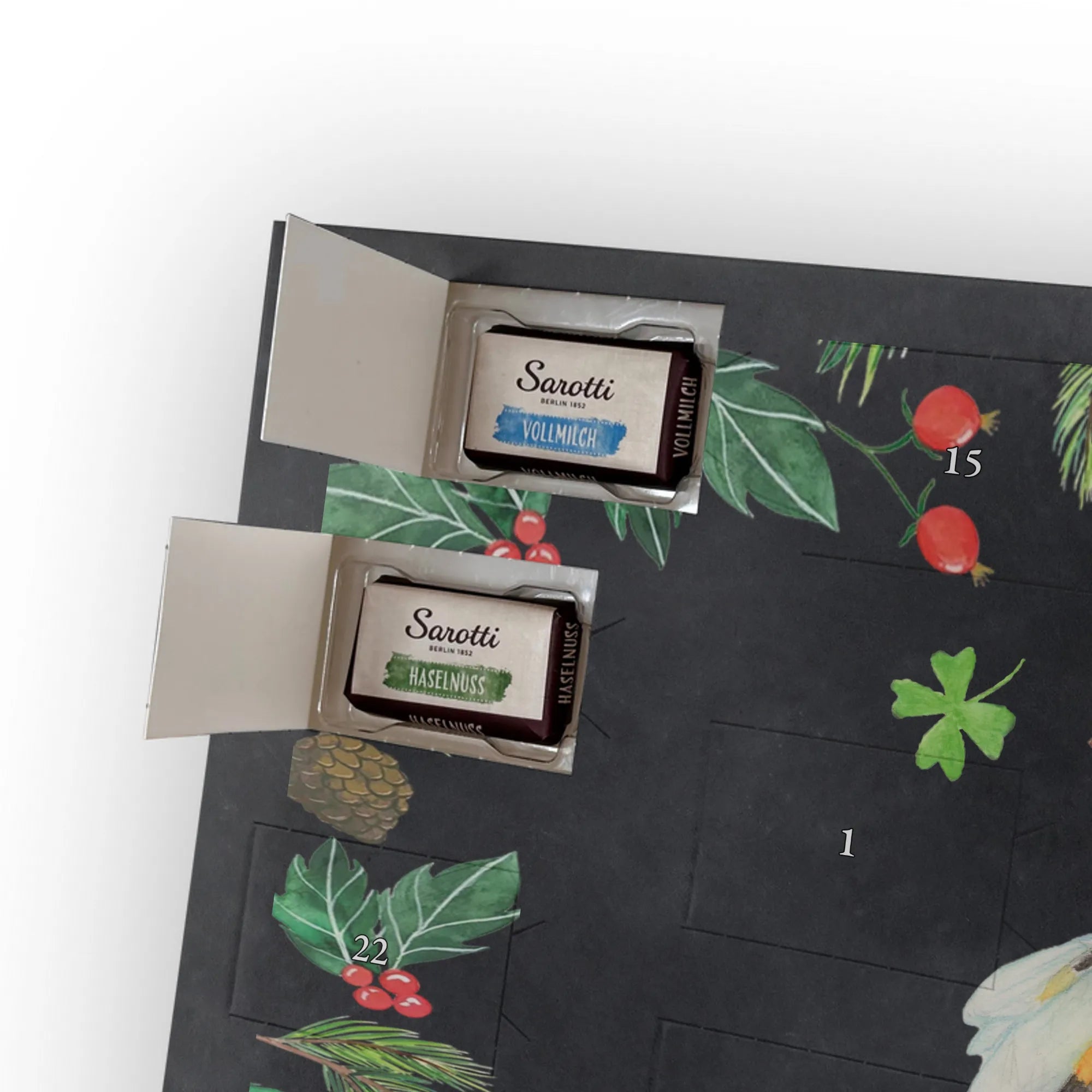 🐼 SCHOKOLADEN-ADVENTSKALENDER: Edler, seidenmatter Druck mit liebevollen Illustrationen.