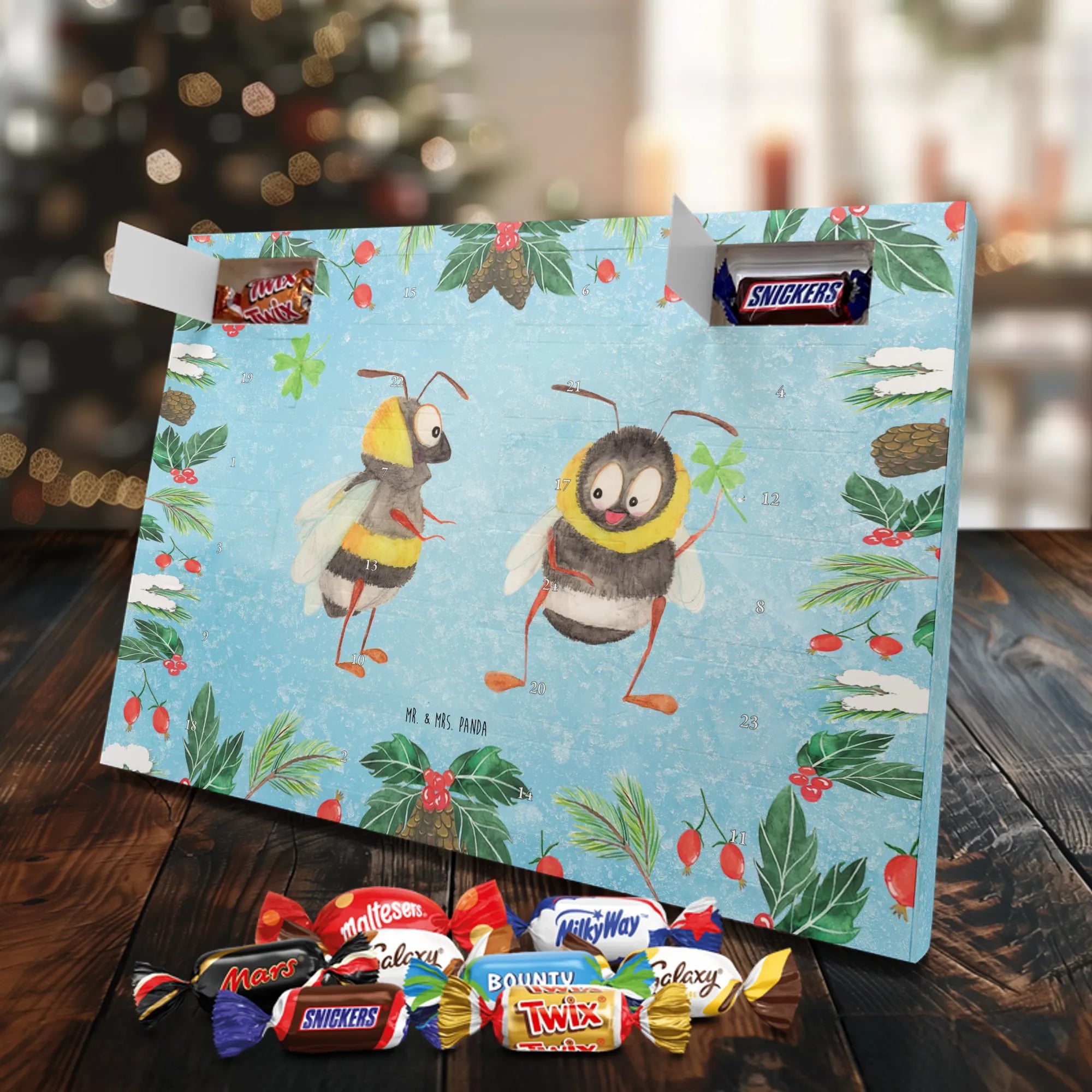 Unser Celebrations Adventskalender von Mr. & Mrs. Panda ist die süße Art, die Tage bis Weihnachten zu zählen. Liebevoll gestaltete Motive und herzliche Sprüche machen jeden Öffnungsmoment besonders. Die brillante Druckqualität zusammen mit einer seidenmatten Oberflächenveredelung sorgt für strahlende Farben und eine angenehme Haptik; auch die Seitenflächen sind bedruckt, damit alles rundum hübsch aussieht. Der Kalender ist nicht personalisierbar. Innen erwarten dich 24 hochwertige Celebrations-Füllungen in acht verschiedenen Sorten: Maltesers, Mars, Snickers, Twix, Milky Way, Bounty, Galaxy und Galaxy Caramel — abwechslungsreicher Genuss für jeden Tag. Als Extra kannst du den Kalender entweder einfach hinstellen oder an die Wand hängen. Maße: 325 mm x 225 mm x 27 mm. Ein ideales Geschenk für alle, die Freude an schönen Details und kleinen Süßigkeiten haben.
