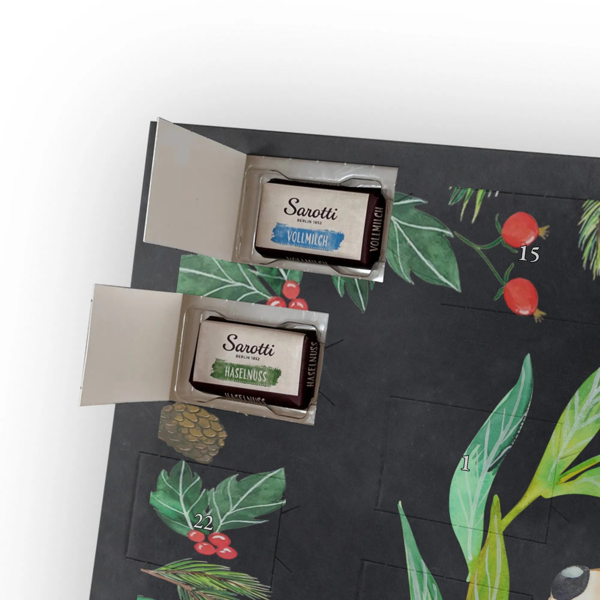 🐼 SCHOKOLADEN-ADVENTSKALENDER: Edler, seidenmatter Druck mit liebevollen Illustrationen.
