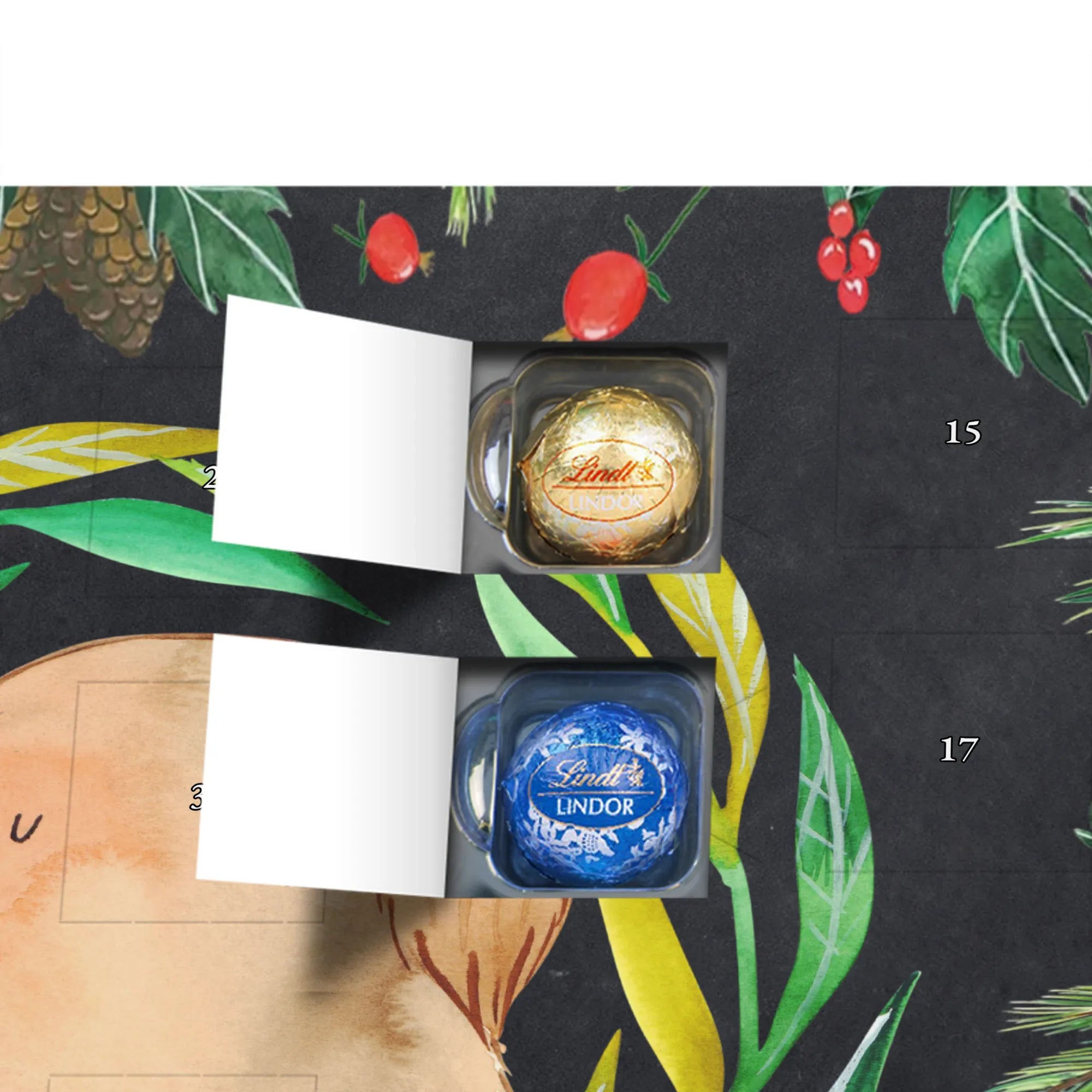 Unser zauberhafter Schoko Adventskalender von Mr. & Mrs. Panda bringt dir die süßeste Vorfreude auf Weihnachten! Dieser liebevoll gestaltete Adventskalender ist bedruckt mit wunderschönen Motiven & Sprüchen von Mr. & Mrs. Panda und ist nicht personalisierbar – dafür aber ein perfektes Geschenk für Freunde und Familie. Brillante Druckqualität mit seidenmatter Oberflächenveredelung sorgt für ein edles Finish, und die bedruckten Seitenflächen machen den Kalender von allen Seiten zu einem Hingucker. Maße: 233 mm x 178 mm x 24 mm. Besonderheit: kann aufgehängt oder aufgestellt werden, je nachdem, wie du ihn präsentieren möchtest. Gefüllt mit Lindt Lindor: 24 einzeln verpackte Markenschokoladen Kugeln in drei verschiedenen Sorten – Vollmilch, Feinherb und Weiße Schokolade – sorgen für abwechslungsreichen Genuss in der Adventszeit. Zutaten: Zucker, pflanzliches Fett (Kokosnuss, Palmkern), Kakaobutter, Vollmilchpulver, Kakaomasse, Milchzucker, Magermilchpulver, Butterreinfett, Emulgator (Sojalecithin), Gerstenmalzextrakt, Aromen. Besondere Hinweise: Kann Haselnüsse und Mandeln enthalten. Unser Schoko Adventskalender verbindet niedliches Design mit hochwertiger Füllung – ideal zum Verschenken oder selbst Naschen. Mr. & Mrs. Panda wünschen dir eine fröhliche und leckere Adventszeit!