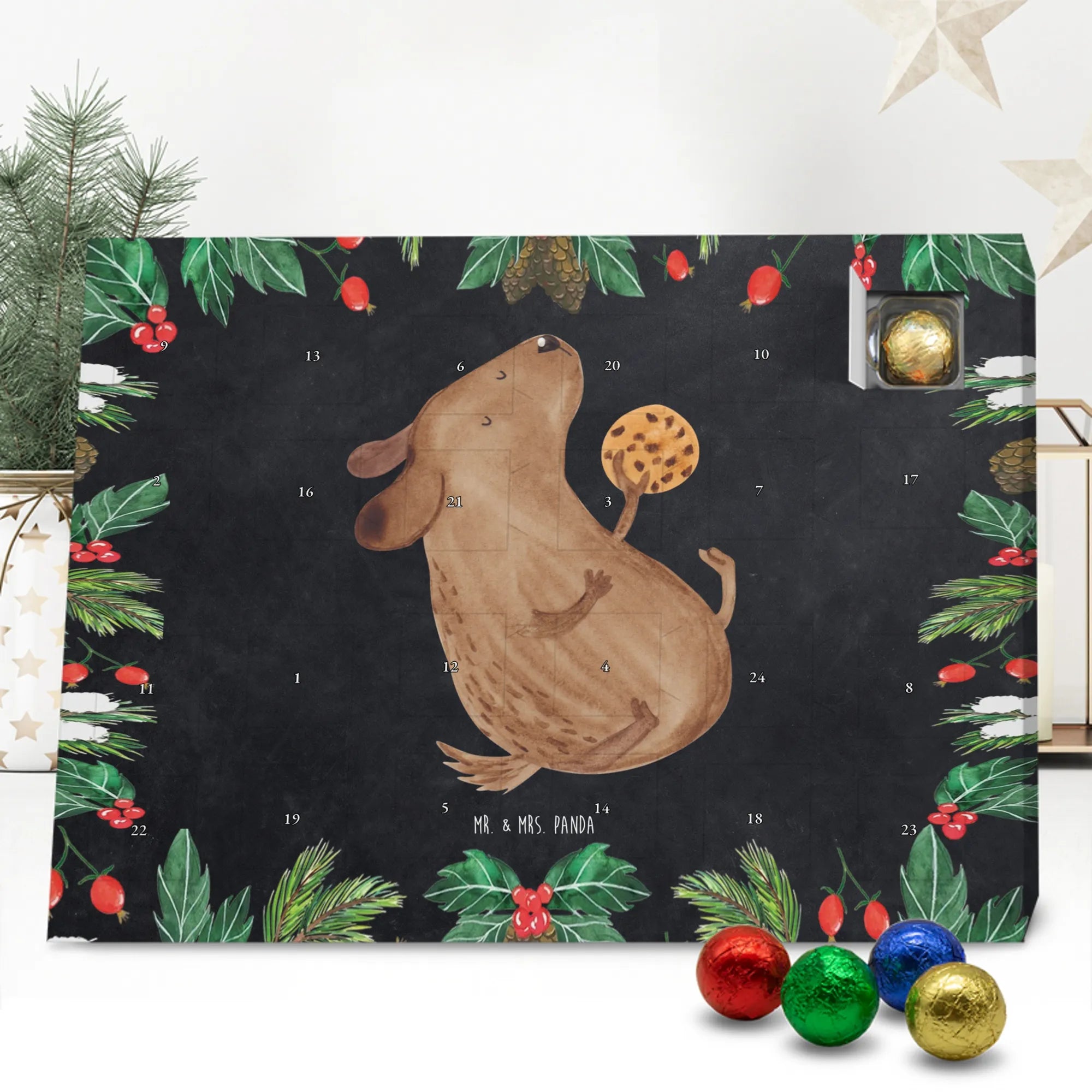 Wunderschöner Schokoladen-Adventskalender von Mr. & Mrs. Panda – süßes Design trifft hochwertige Verarbeitung. Unser Schokoladen-Adventskalender ist bedruckt mit wunderschönen Motiven & Sprüchen von Mr. & Mrs. Panda und nicht personalisierbar, dafür aber mit liebevollen Details gestaltet. Die brillante Druckqualität mit seidenmatter Oberflächenveredelung verleiht dem Kalender ein edles Finish, und auch die Seitenflächen sind bedruckt für einen rundum stimmigen Look. Maße: 233 mm x 178 mm x 24 mm. Die Konstruktion erlaubt sowohl das Aufstellen als auch das Aufhängen – Besonderheit: kann aufgehängt oder aufgestellt werden. Gefüllt mit MARKENNAMEN Schokolade und mit leckeren Schokoladenkugeln bestückt, ist jeder Dezembertag eine kleine Belohnung. Bitte lies die besonderen Hinweise: (Kann Spuren von Haselnüssen, Mandeln, Gluten und Soja enthalten!), kühl und trocken lagern. Ideal als Geschenk, Adventsdekoration oder süße Überraschung für Freunde und Familie. Mr. & Mrs. Panda wünscht dir eine gemütliche und genussvolle Adventszeit!