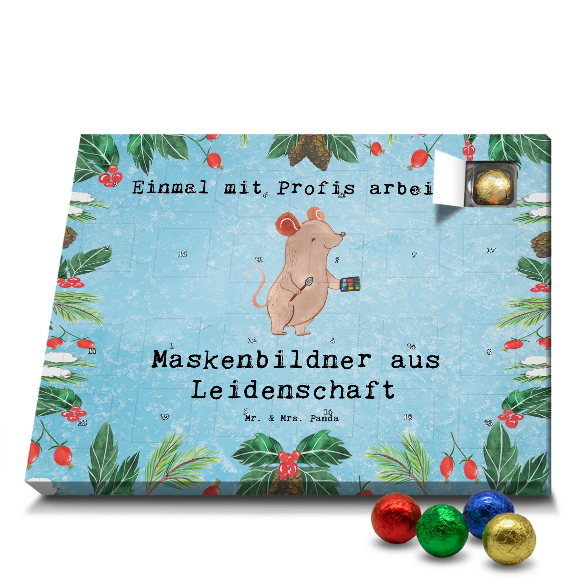 Wunderschöner Adventskalender mit Schokolade von Mr. & Mrs. Panda – für alle, die Advent und Design lieben. Dieser Adventskalender mit Schokolade ist liebevoll bedruckt mit wunderschönen Motiven & Sprüchen von Mr. & Mrs. Panda und ist nicht personalisierbar, aber mit viel Liebe zum Detail gefertigt. Brillante Druckqualität mit seidenmatter Oberflächenveredelung sorgt für einen edlen Look, und die bedruckten Seitenflächen geben dem Kalender eine besondere Optik. Maße: 233 mm x 178 mm x 24 mm. Dank seiner stabilen Verarbeitung kannst du ihn aufstellen oder ganz einfach aufhängen – Besonderheit: kann aufgehängt oder aufgestellt werden. Gefüllt mit MARKENNAMEN Schokolade und leckeren Schokoladenkugeln, bringt er jeden Tag ein kleines Glückserlebnis. Wichtige Hinweise: (Kann Spuren von Haselnüssen, Mandeln, Gluten und Soja enthalten!), bitte kühl und trocken lagern. Ob als Geschenk, Mitbringsel oder Adventsdeko – dieser Kalender zaubert ein Lächeln und sorgt für gemütliche Vorfreude. Viel Freude beim Entdecken der süßen Überraschungen wünscht dir Mr. & Mrs. Panda!