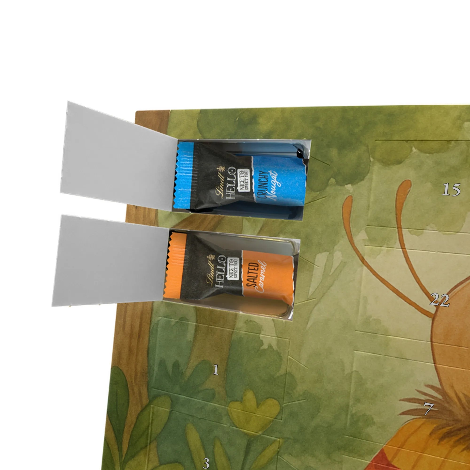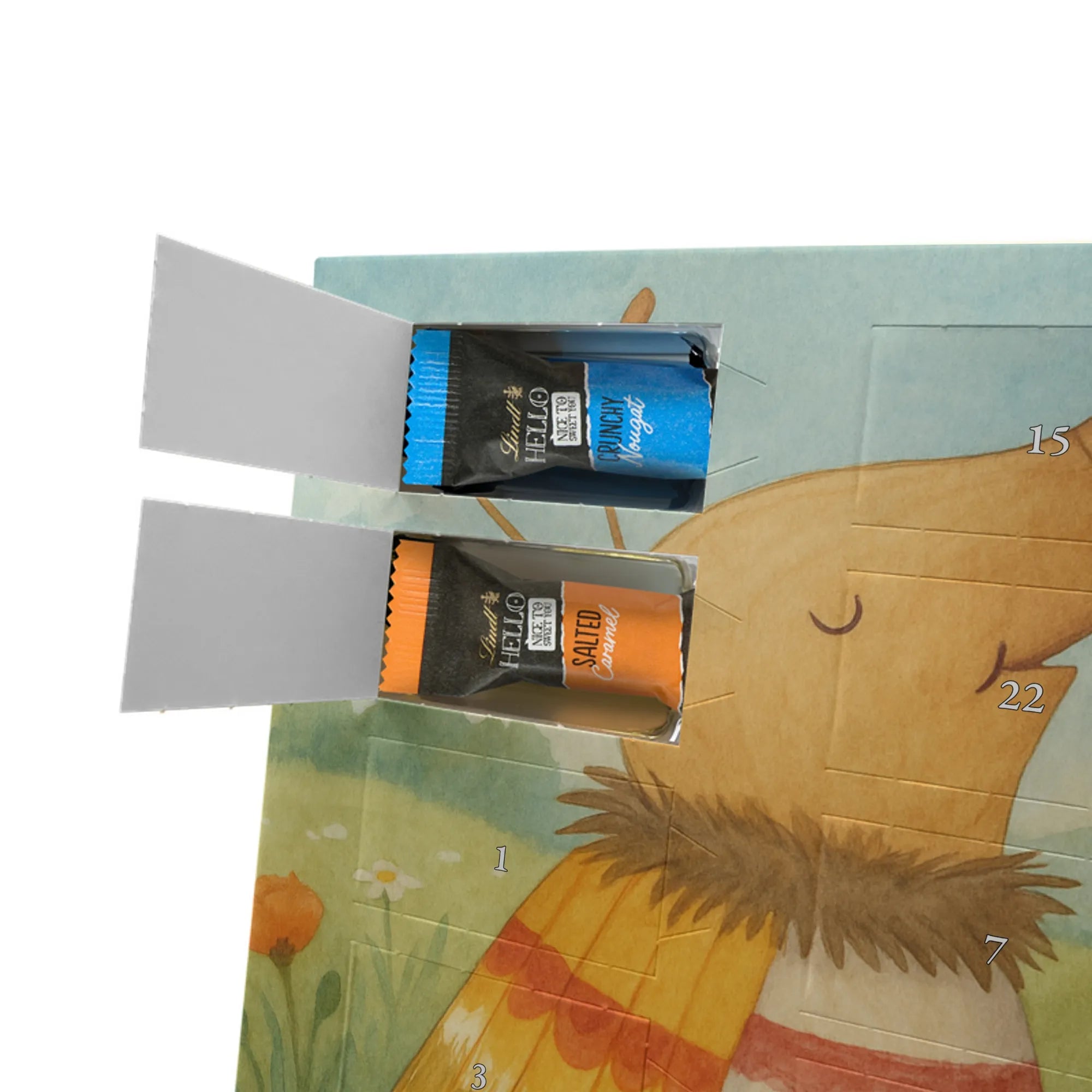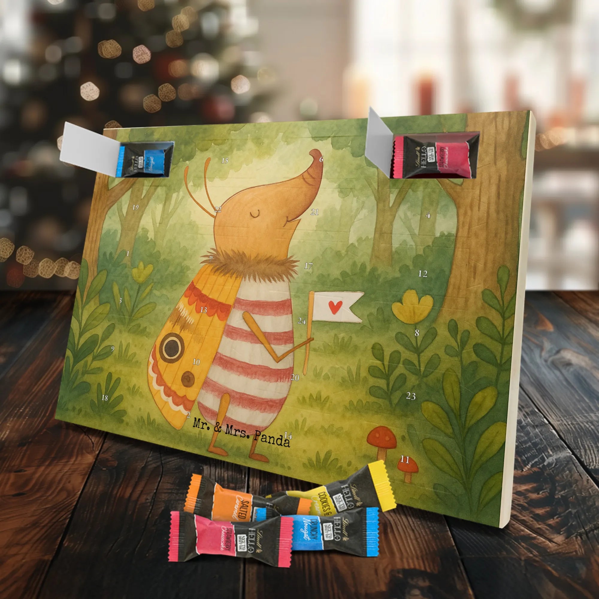 Entdecke den charmanten Schokoladen Adventskalender von Mr. & Mrs. Panda – ein kleines Kunstwerk für alle Schoko-Liebhaber. Der Schoko-Adventskalender ist mit liebevollen Illustrationen und kurzen Sprüchen bedruckt und verbreitet gemütliche Vorfreude auf Weihnachten. Er ist nicht personalisierbar, aber durch die brillante Druckqualität und die seidenmatte Oberflächenveredelung ein echtes Hingucker-Produkt. Auch die Seitenflächen sind bedruckt, was dem Kalender ein rundum schönes Erscheinungsbild verleiht. Maße: 325 mm x 225 mm x 27 mm. Das praktische Design erlaubt es, den Kalender aufzuhängen oder aufzustellen. Gefüllt mit Lindt Hello Schokolade: 24 einzeln verpackte Mini Sticks in vier leckeren Sorten – Karamell-Schokoladenkuchen, Kekse, Knuspriger Nougat und Erdbeer-Cheesecake. Zutaten sind u. a. Zucker, Kakaobutter, Vollmilchpulver, Haselnüsse und weitere Zutaten; Allergene: Milcheiweiß, Milchzucker, Soja, Weizen, Haselnüsse; kann Spuren von Mandeln und anderen Schalenfrüchten enthalten. Ideal als Geschenk oder zum Selbernaschen – einfach jeden Tag ein Türchen öffnen und genießen.