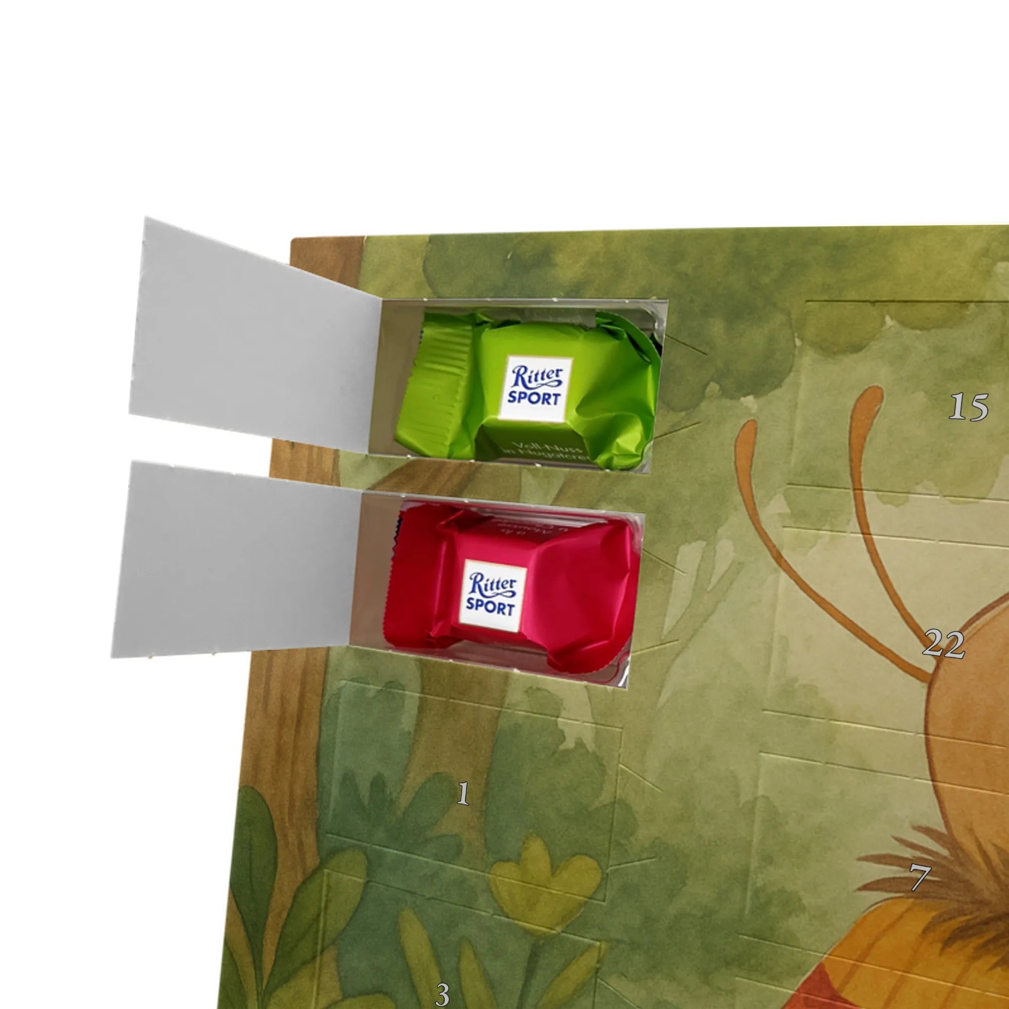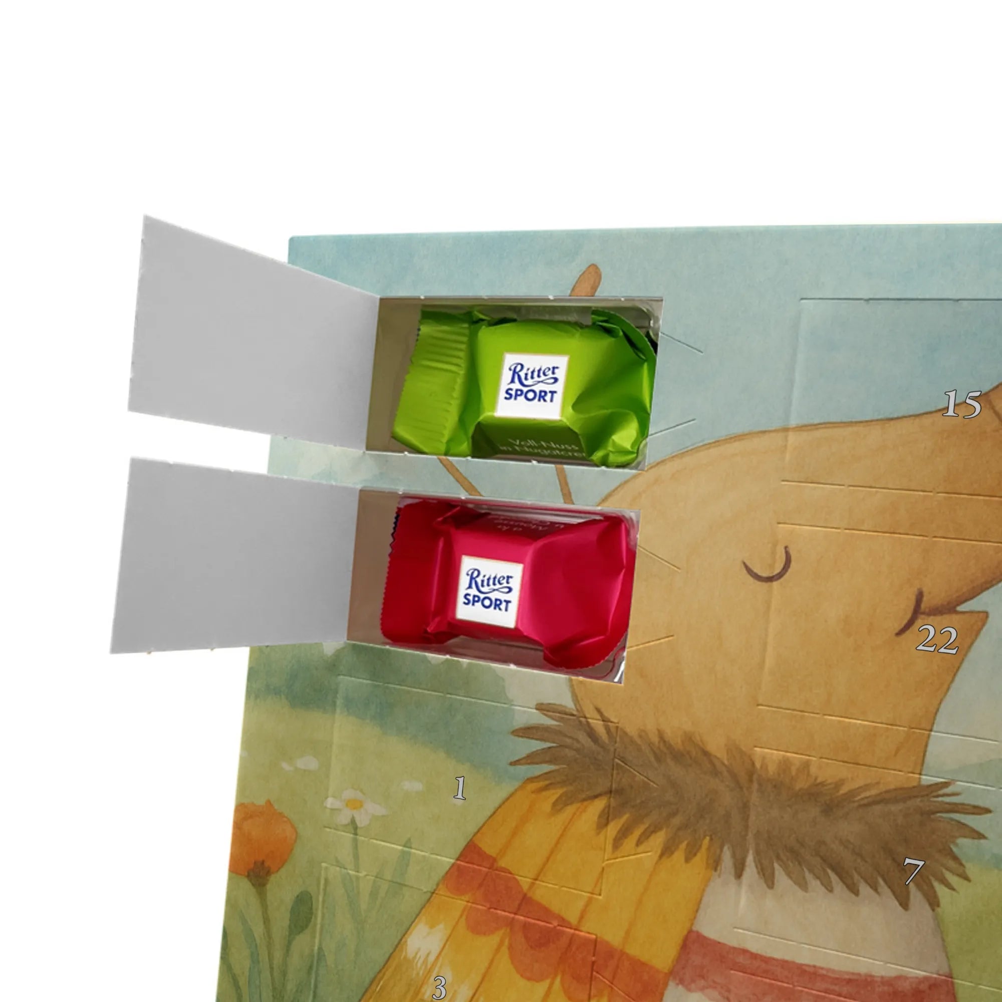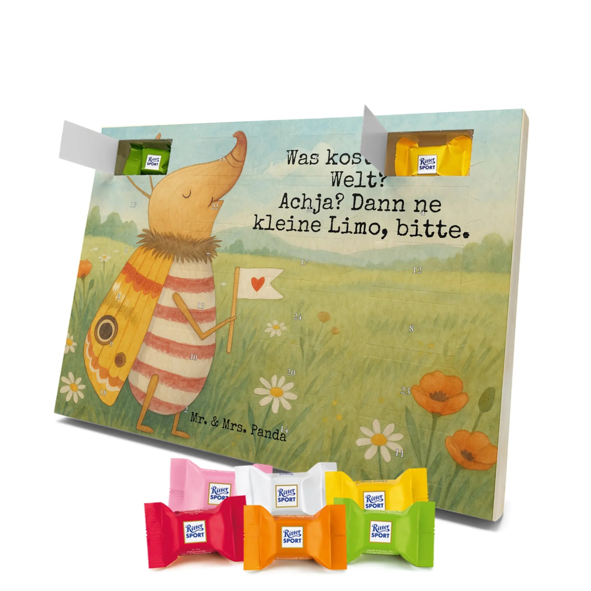 Adventskalender mit Schokolade – so schmeckt Vorfreude! Unser Mr. & Mrs. Panda Adventskalender ist liebevoll gestaltet und bedruckt mit wunderschönen Motiven & Sprüchen, die jeden Tag versüßen. Die brillante Druckqualität mit seidenmatter Oberflächenveredelung sorgt für ein edles Finish, und auch die Seitenflächen sind hübsch bedruckt. Der Kalender ist nicht personalisierbar, dafür aber vielseitig einsetzbar: Maße: 325 mm x 225 mm x 27 mm und die besondere Eigenschaft, dass du ihn aufgehängt oder aufgestellt verwenden kannst, geben dir Flexibilität bei der Dekoration. Gefüllt ist der Kalender mit Ritter Sport Schokowürfeln in beliebten Geschmacksrichtungen wie Mousse au Chocolat, Schoko Crisp, Voll-Nuss in Nougatcreme, Karamell Duo, Joghurt und Erdbeer-Joghurt. Wichtig: Es handelt sich um einen Kalender gefüllt mit Ritter Sport Schokolade, nicht um einen Kalender der Marke Ritter Sport. Ideal als Geschenk oder als Adventsdeko für dein Zuhause – kleine Schokofreuden warten hinter jedem Türchen.