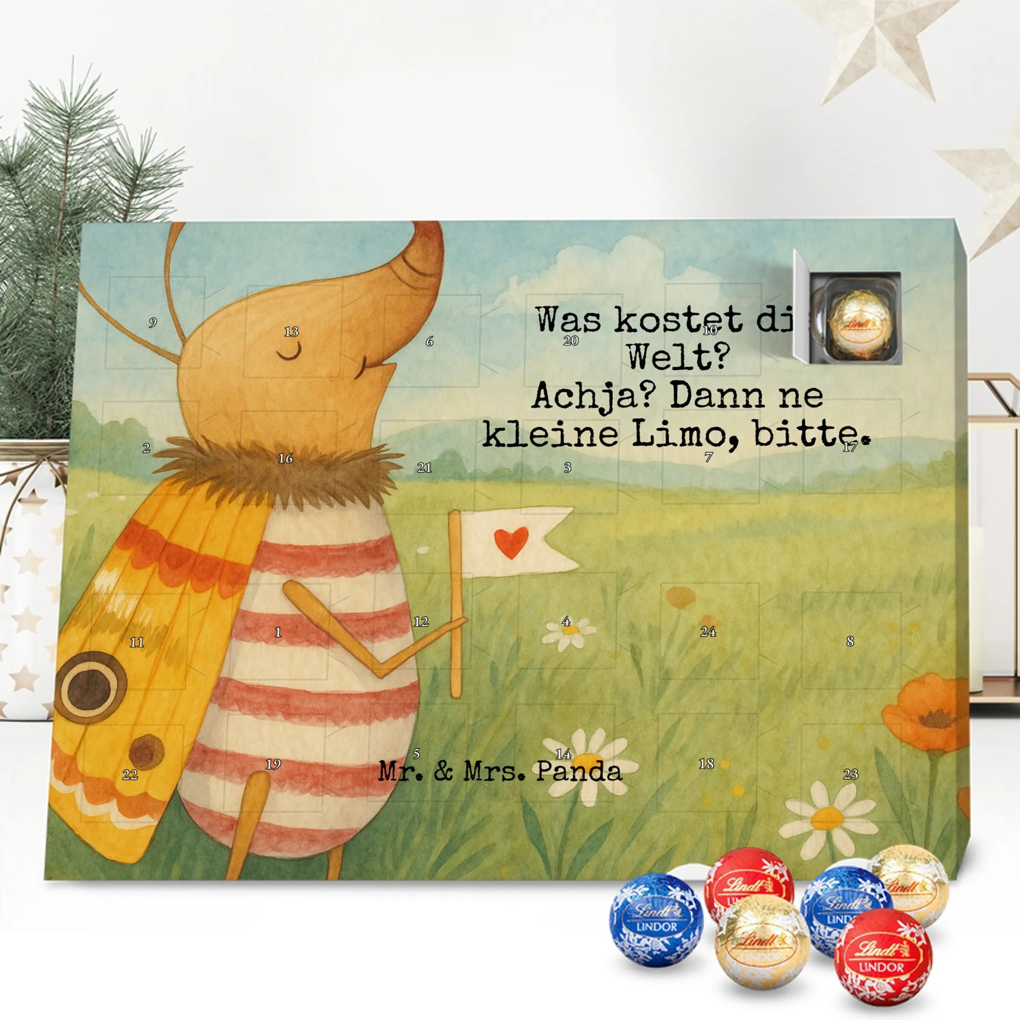 Der Schokolade Adventskalender von Mr. & Mrs. Panda ist ein liebevoll gestaltetes Highlight für deine Adventsdeko. Bedruckt mit wunderschönen Motiven & Sprüchen, nicht personalisierbar, bietet er eine charmante Optik für jeden Haushalt. Die brillante Druckqualität mit seidenmatter Oberflächenveredelung sorgt für edle Akzente, und die bedruckten Seitenflächen machen den Kalender rundum schön. Maße: 233 mm x 178 mm x 24 mm. Besonderheit: kann aufgehängt oder aufgestellt werden – richtig praktisch! Gefüllt mit Lindt Lindor: 24 einzeln verpackte Markenschokoladen Kugeln in drei köstlichen Varianten – Vollmilch, Feinherb und Weiße Schokolade – sorgen für tägliche Freuden. Zutaten: Zucker, pflanzliches Fett (Kokosnuss, Palmkern), Kakaobutter, Vollmilchpulver, Kakaomasse, Milchzucker, Magermilchpulver, Butterreinfett, Emulgator (Sojalecithin), Gerstenmalzextrakt, Aromen. Besondere Hinweise: Kann Haselnüsse und Mandeln enthalten. Ob als Geschenk oder für dich selbst – dieser Kalender ist eine wunderbare Mischung aus Design und feiner Markenschokolade.