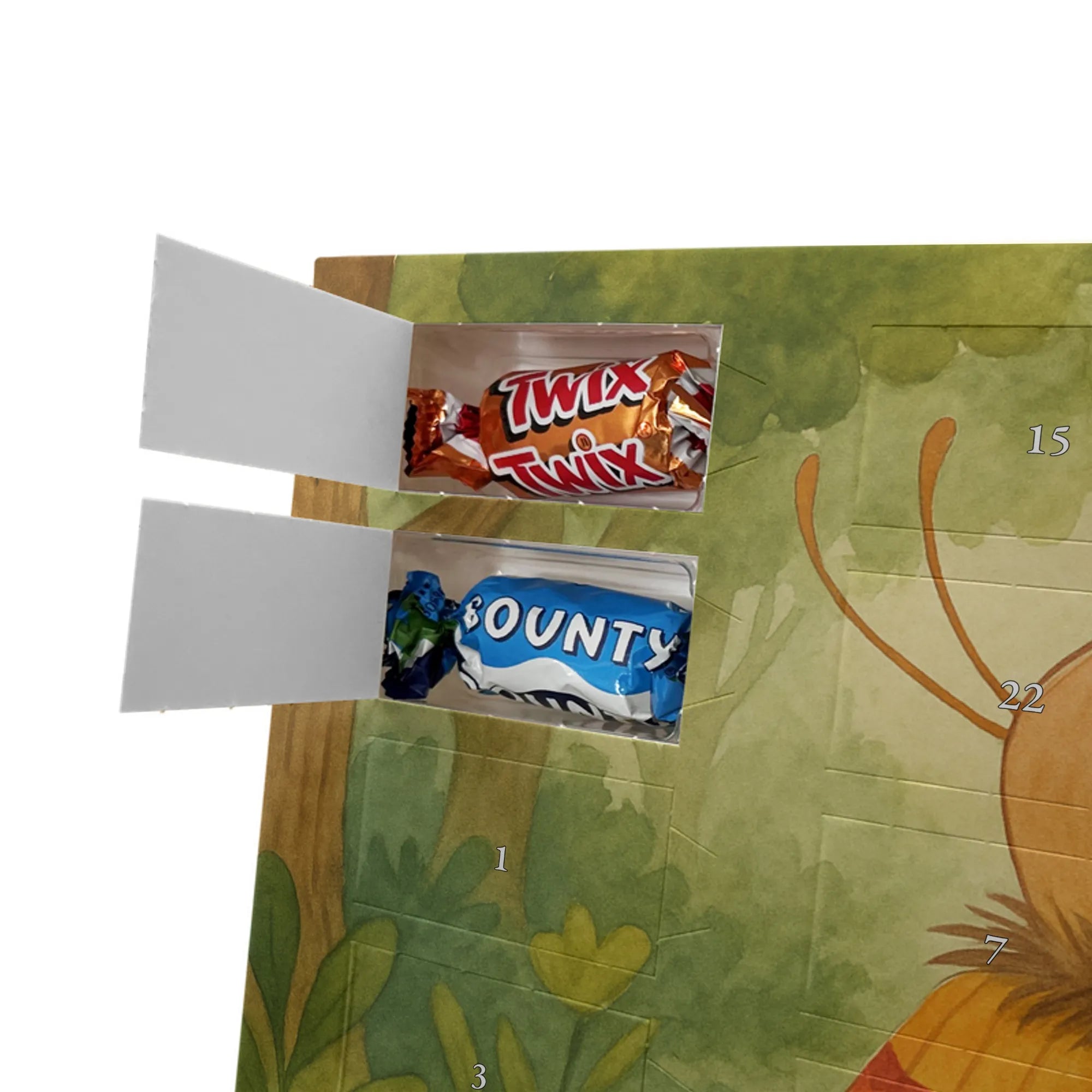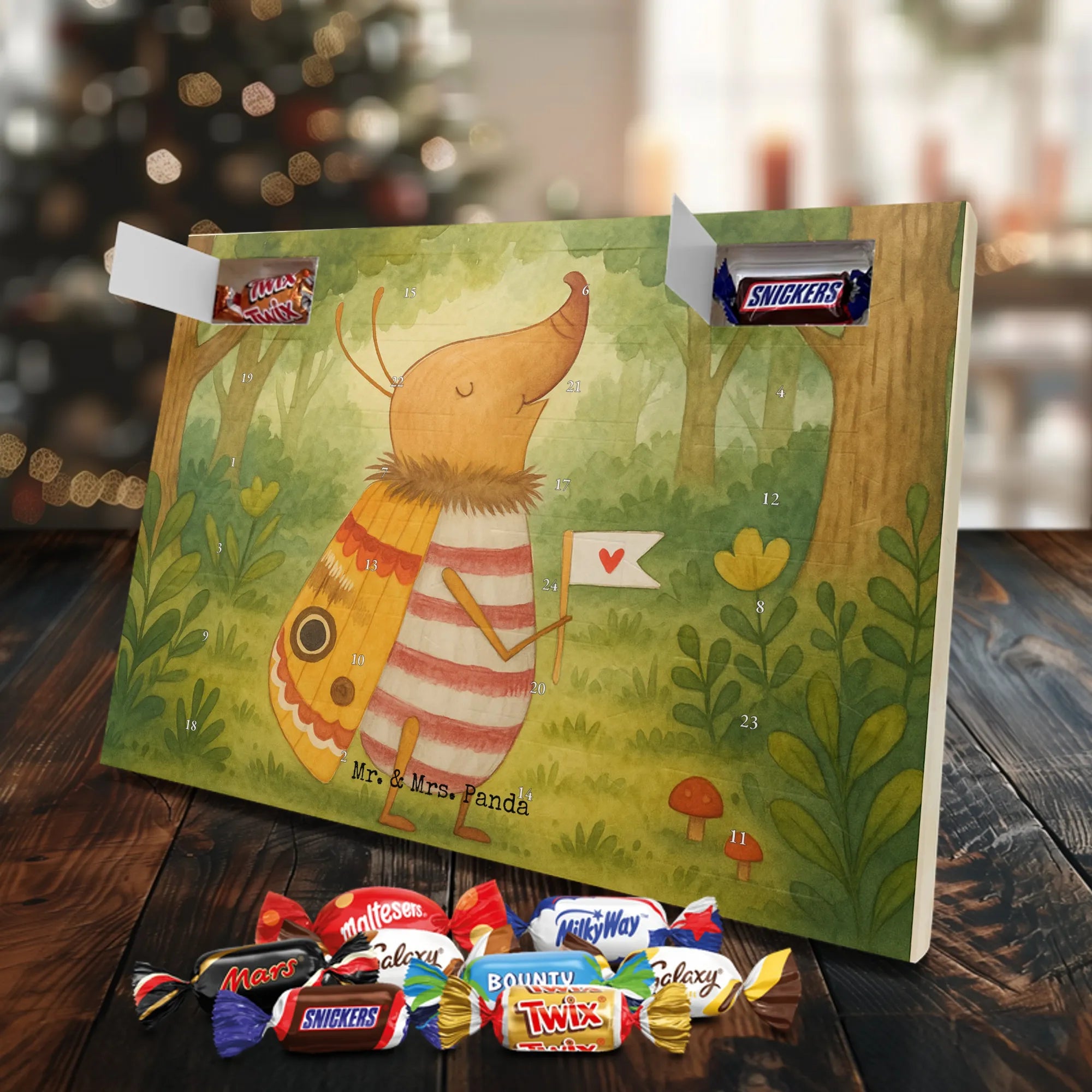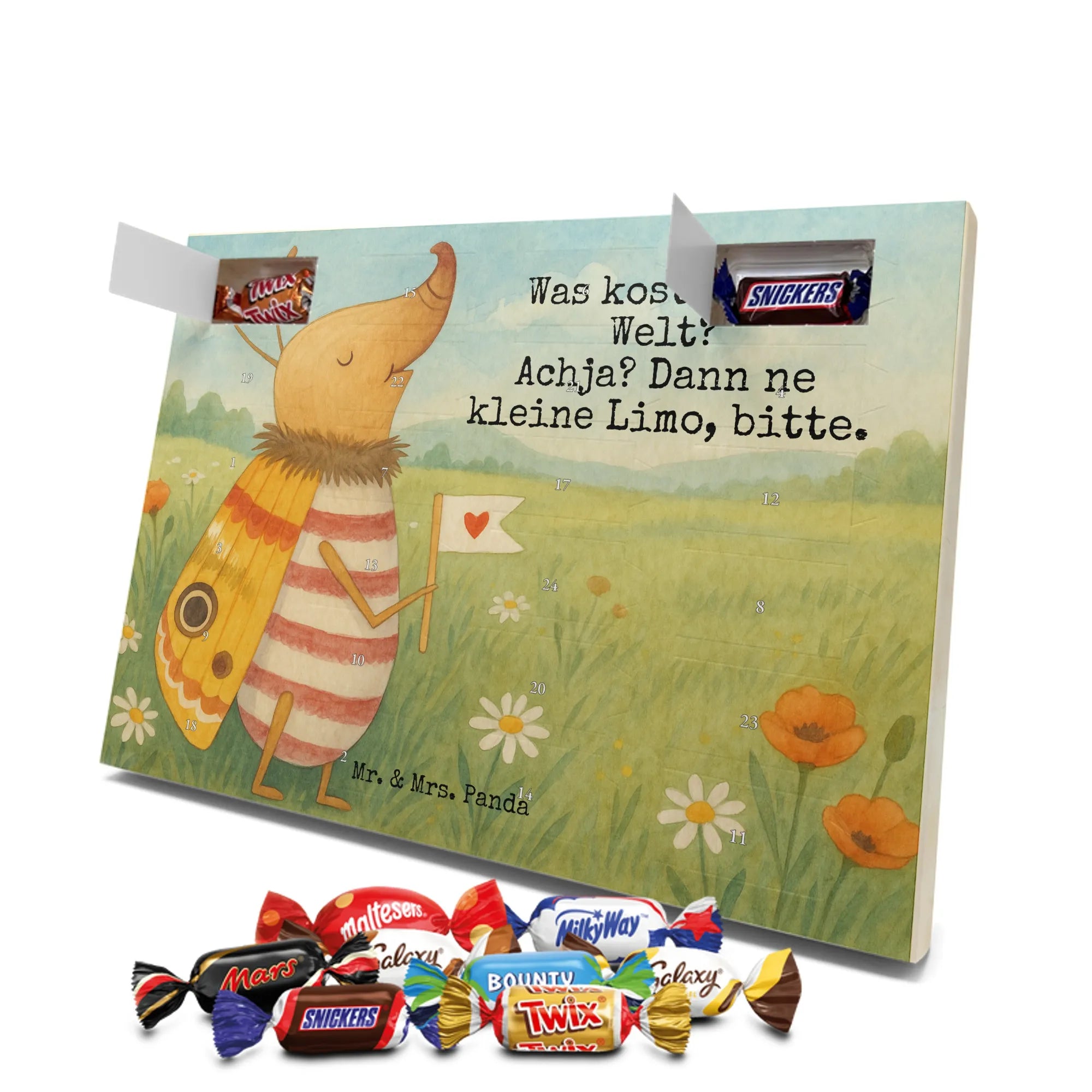 Unser Schoko Adventskalender von Mr. & Mrs. Panda bringt dir und deinen Lieben jede Menge Vorfreude und zauberhafte Momente in die Adventszeit. Der Kalender ist liebevoll bedruckt mit wunderschönen Motiven und frechen Sprüchen im typischen Mr. & Mrs. Panda Stil – ein echter Blickfang auf dem Tisch oder an der Wand. Die brillante Druckqualität kombiniert mit einer seidenmatten Oberflächenveredelung sorgt für edle Farben und ein angenehmes Gefühl beim Anfassen. Auch die Seitenflächen sind bedruckt, sodass der Kalender von allen Seiten hübsch aussieht. Er ist nicht personalisierbar, dafür aber in seiner Gestaltung rundum stimmig. Gefüllt ist der Adventskalender mit 24 hochwertigen Celebrations-Füllungen in acht verschiedenen Sorten: Maltesers, Mars, Snickers, Twix, Milky Way, Bounty, Galaxy und Galaxy Caramel — so ist für jede Naschkatze etwas dabei. Die Besonderheit: Du kannst den Kalender entweder aufstellen oder dank rückseitiger Aufhängung an die Wand hängen. Maße: 325 mm x 225 mm x 27 mm. Ein liebevolles Geschenk für Familie, Freunde oder einfach für dich selbst, das kleine tägliche Glücksmomente schenkt und die Adventszeit versüßt.