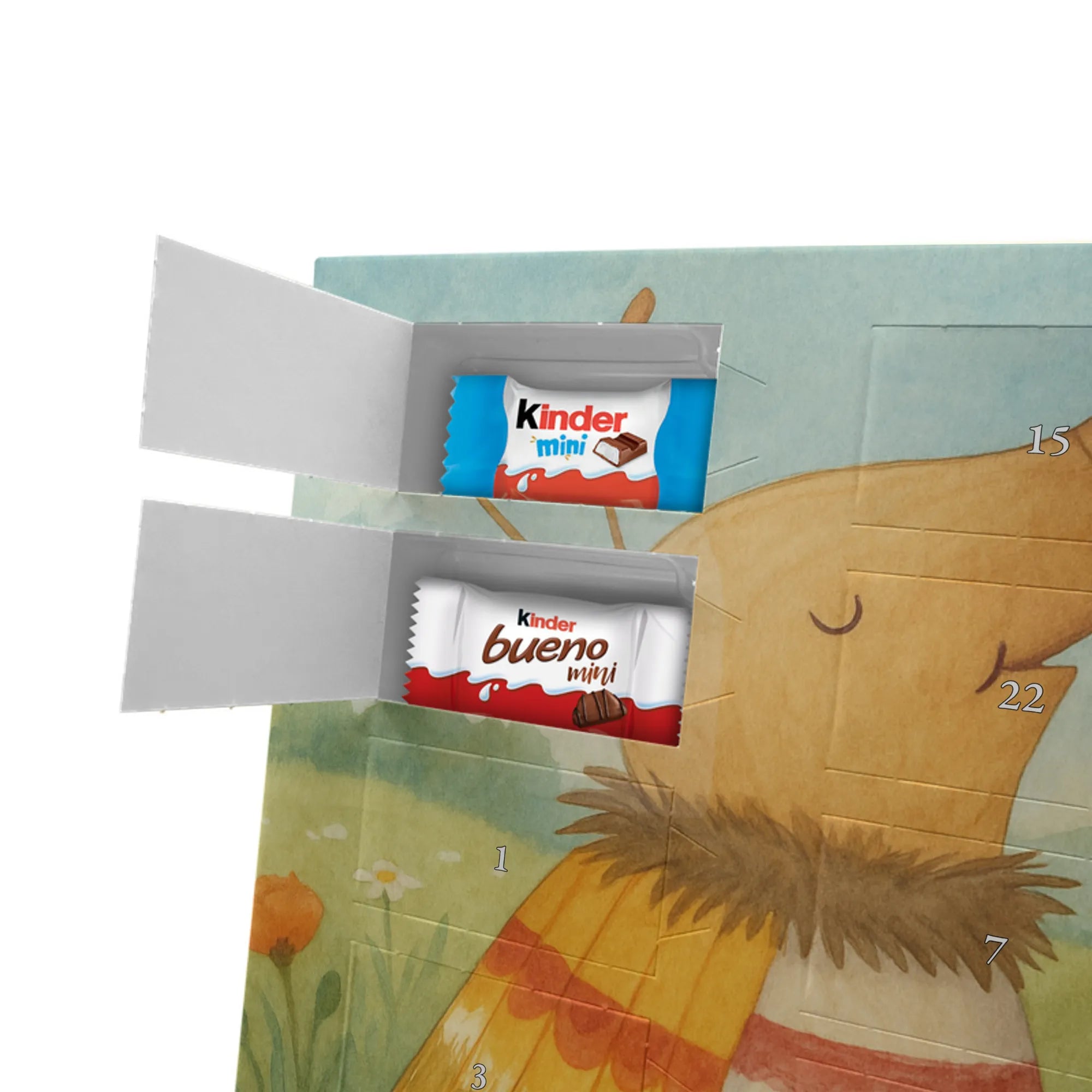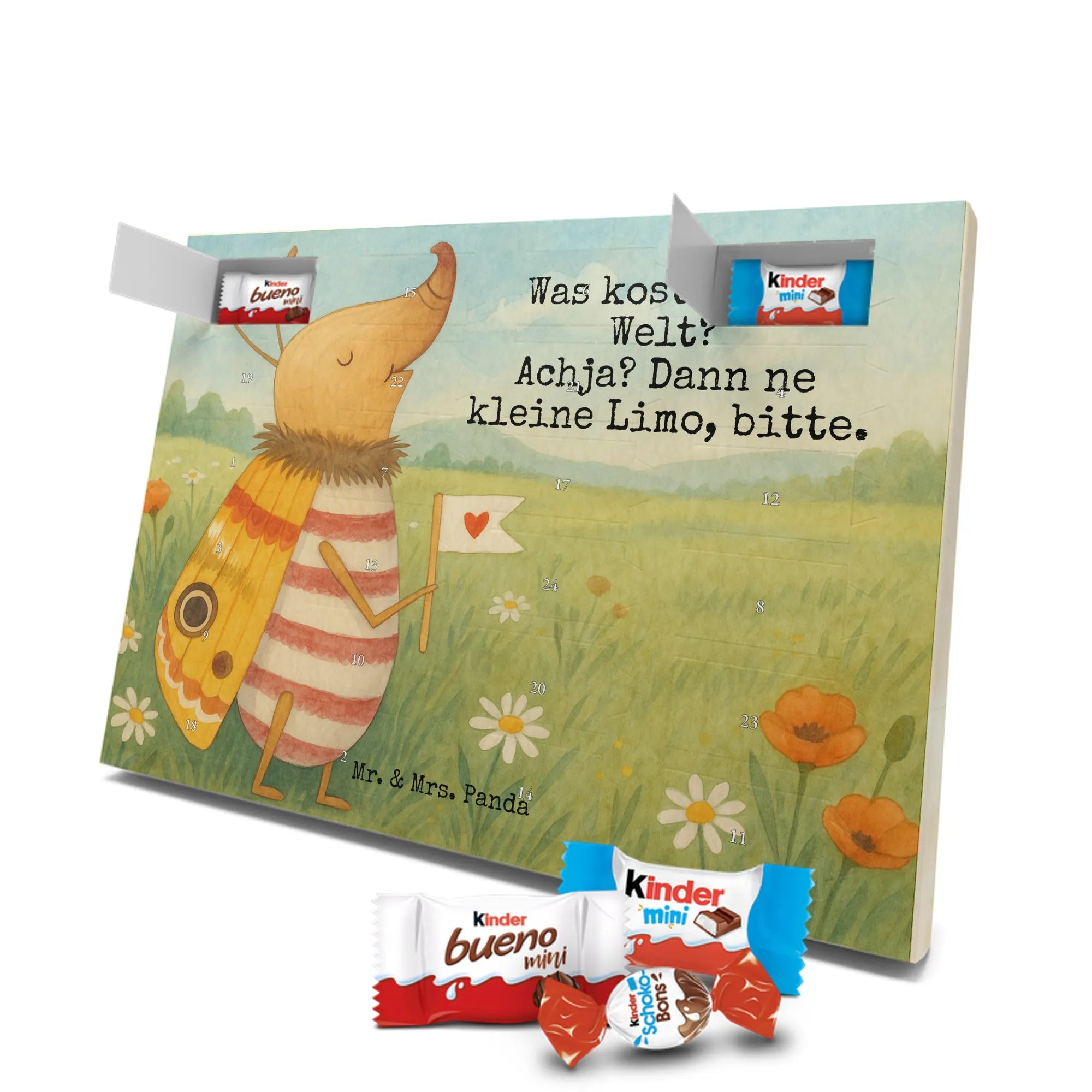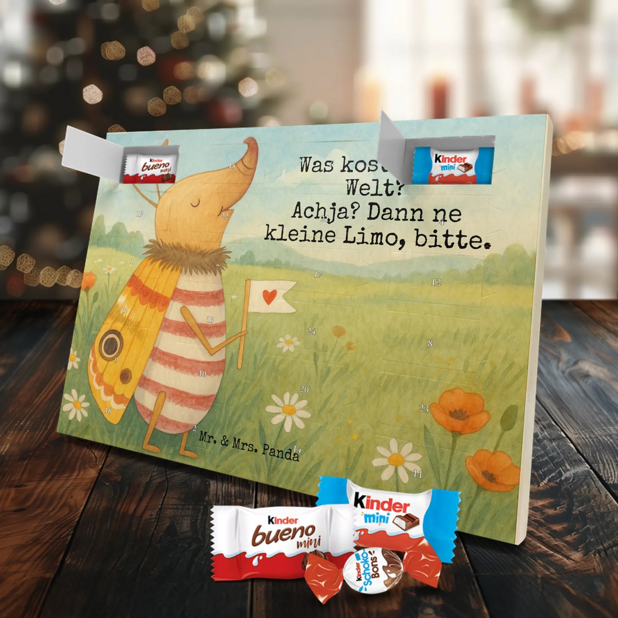 Schoko Adventskalender von Mr. & Mrs. Panda – die charmante Art, sich oder anderen die Adventszeit zu versüßen. Der Kalender ist bedruckt mit wunderschönen Motiven & Sprüchen von Mr. & Mrs. Panda und nicht personalisierbar. Wir legen Wert auf brillante Druckqualität mit seidenmatter Oberflächenveredelung sowie auf bedruckte Seitenflächen für ein stimmiges Gesamtbild. Maße: 355 mm x 245 mm x 11 mm. Besonders praktisch: kann aufgehängt oder aufgestellt werden und passt so in jede Wohnung. Gefüllt mit Markenname Schokolade: Adventskalender gefüllt mit kinder® Schokolade. Inhalt: kinder® Schoko-Bons, kinder® Bueno mini und kinder® Schokolade mini. Die 24 Türchen sind mit kleinen Schoko-Überraschungen bestückt und schaffen jeden Tag Vorfreude. Ob als Geschenk für Kinder, Partner oder als nette Aufmerksamkeit für Kolleginnen und Kollegen – dieser Kalender macht Freude. Robust, schön gestaltet und sofort einsatzbereit für die süßeste Zeit des Jahres!
