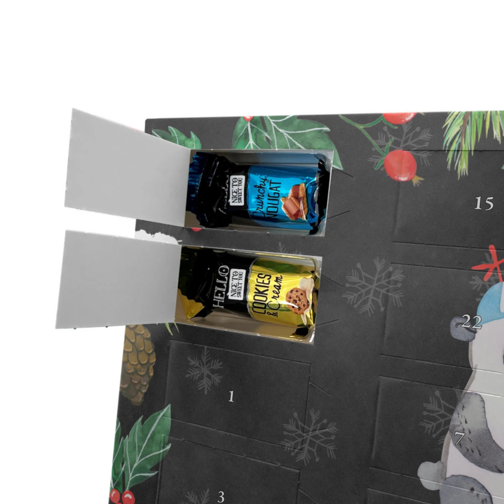 Wunderschöner Adventskalender mit Schokolade von Mr. & Mrs. Panda – für alle, die Advent und Design lieben. Dieser Adventskalender mit Schokolade ist liebevoll bedruckt mit wunderschönen Motiven & Sprüchen von Mr. & Mrs. Panda und ist nicht personalisierbar, aber mit viel Liebe zum Detail gefertigt. Brillante Druckqualität mit seidenmatter Oberflächenveredelung sorgt für einen edlen Look, und die bedruckten Seitenflächen geben dem Kalender eine besondere Optik. Maße: 233 mm x 178 mm x 24 mm. Dank seiner stabilen Verarbeitung kannst du ihn aufstellen oder ganz einfach aufhängen – Besonderheit: kann aufgehängt oder aufgestellt werden. Gefüllt mit MARKENNAMEN Schokolade und leckeren Schokoladenkugeln, bringt er jeden Tag ein kleines Glückserlebnis. Wichtige Hinweise: (Kann Spuren von Haselnüssen, Mandeln, Gluten und Soja enthalten!), bitte kühl und trocken lagern. Ob als Geschenk, Mitbringsel oder Adventsdeko – dieser Kalender zaubert ein Lächeln und sorgt für gemütliche Vorfreude. Viel Freude beim Entdecken der süßen Überraschungen wünscht dir Mr. & Mrs. Panda!