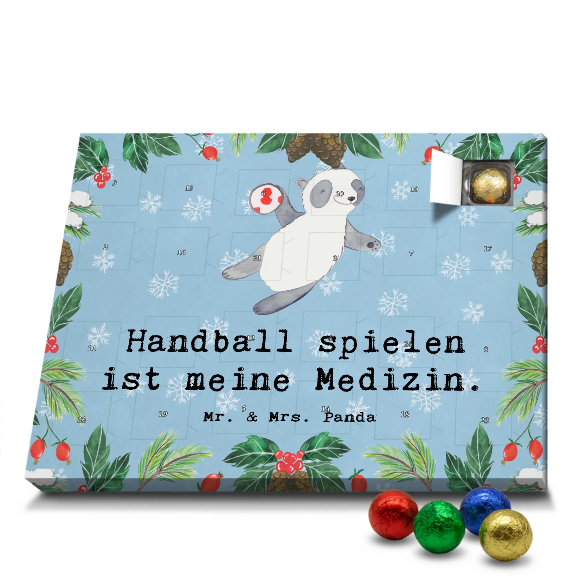 Schoko Adventskalender Panda Handball spielen - Classic - Blau Pastell