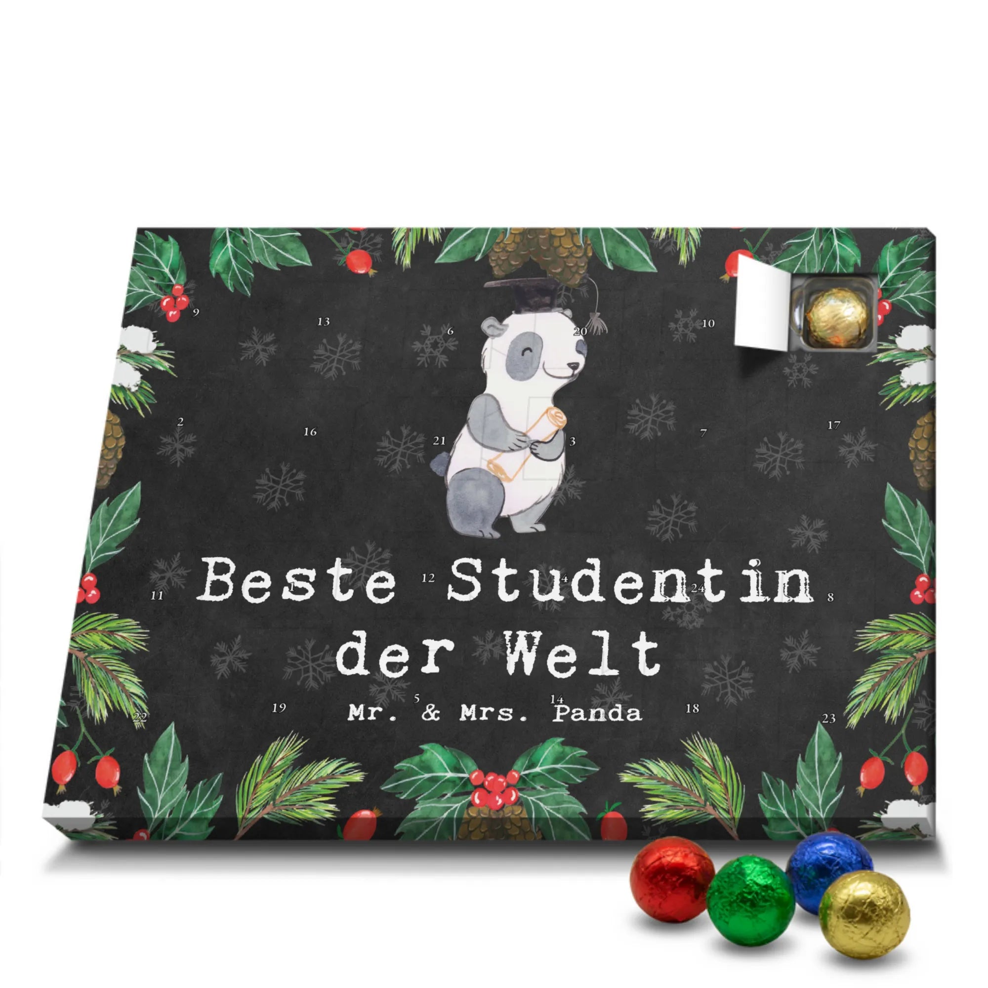 🐼 Schoko Adventskalender mit Mr. & Mrs. Panda Motiven, brillante Druckqualität, nicht personalisierbar.