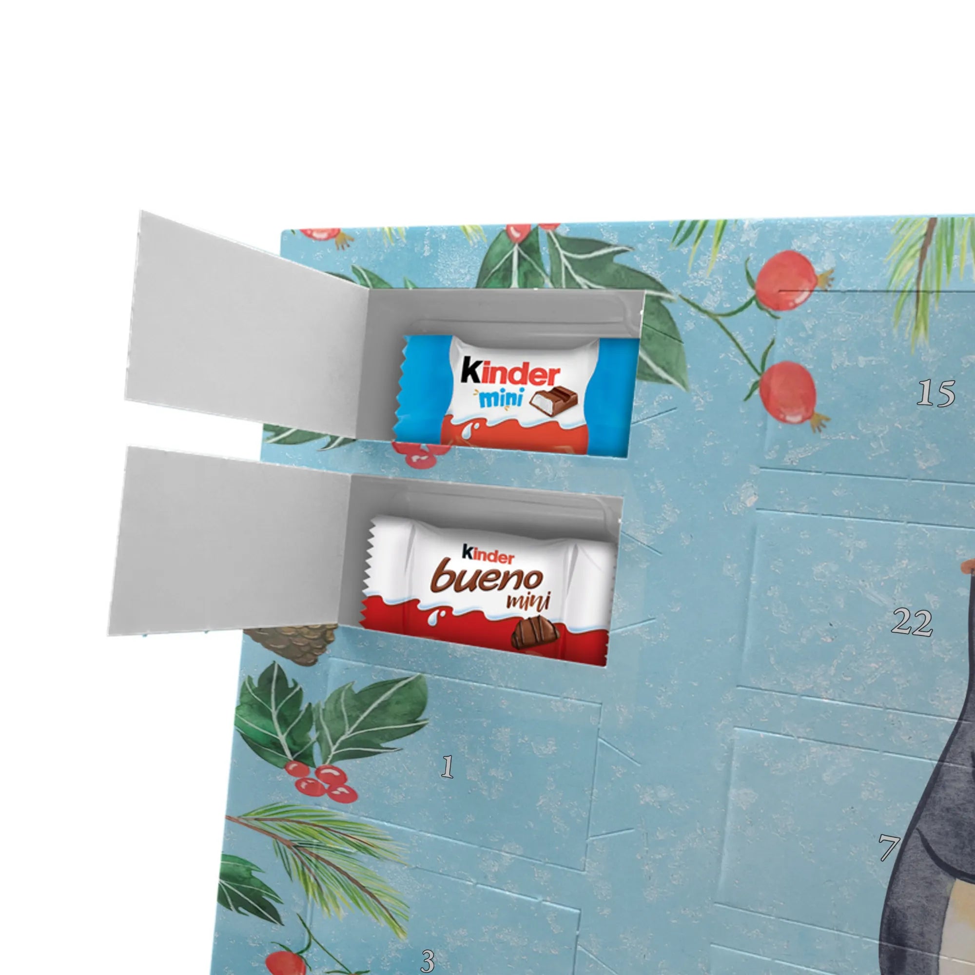 Adventskalender mit Schokolade – liebevoll gestaltet von Mr. & Mrs. Panda. Dieser niedliche Kalender ist bedruckt mit wunderschönen Motiven & Sprüchen von Mr. & Mrs. Panda und trotzdem nicht personalisierbar. Du bekommst brillante Druckqualität mit seidenmatter Oberflächenveredelung sowie bedruckte Seitenflächen, die dem Kalender ein hochwertiges Finish verleihen. Maße: 355 mm x 245 mm x 11 mm. Ein tolles Extra: kann aufgehängt oder aufgestellt werden, sodass du ihn flexibel platzieren kannst. Gefüllt mit Markenname Schokolade: Adventskalender gefüllt mit kinder® Schokolade. Inhalt: kinder® Schoko-Bons, kinder® Bueno mini und kinder® Schokolade mini. Die 24 Türchen sind liebevoll befüllt und sorgen jeden Tag für ein Lächeln – ideal für Kinder, Paare oder als kleines Geschenk für Freunde. Robust und dekorativ zugleich, bringt dieser Adventskalender süße Vorfreude in dein Zuhause. Verschenke oder genieße eine adventliche Zeit voller kleiner, schokoladiger Überraschungen!