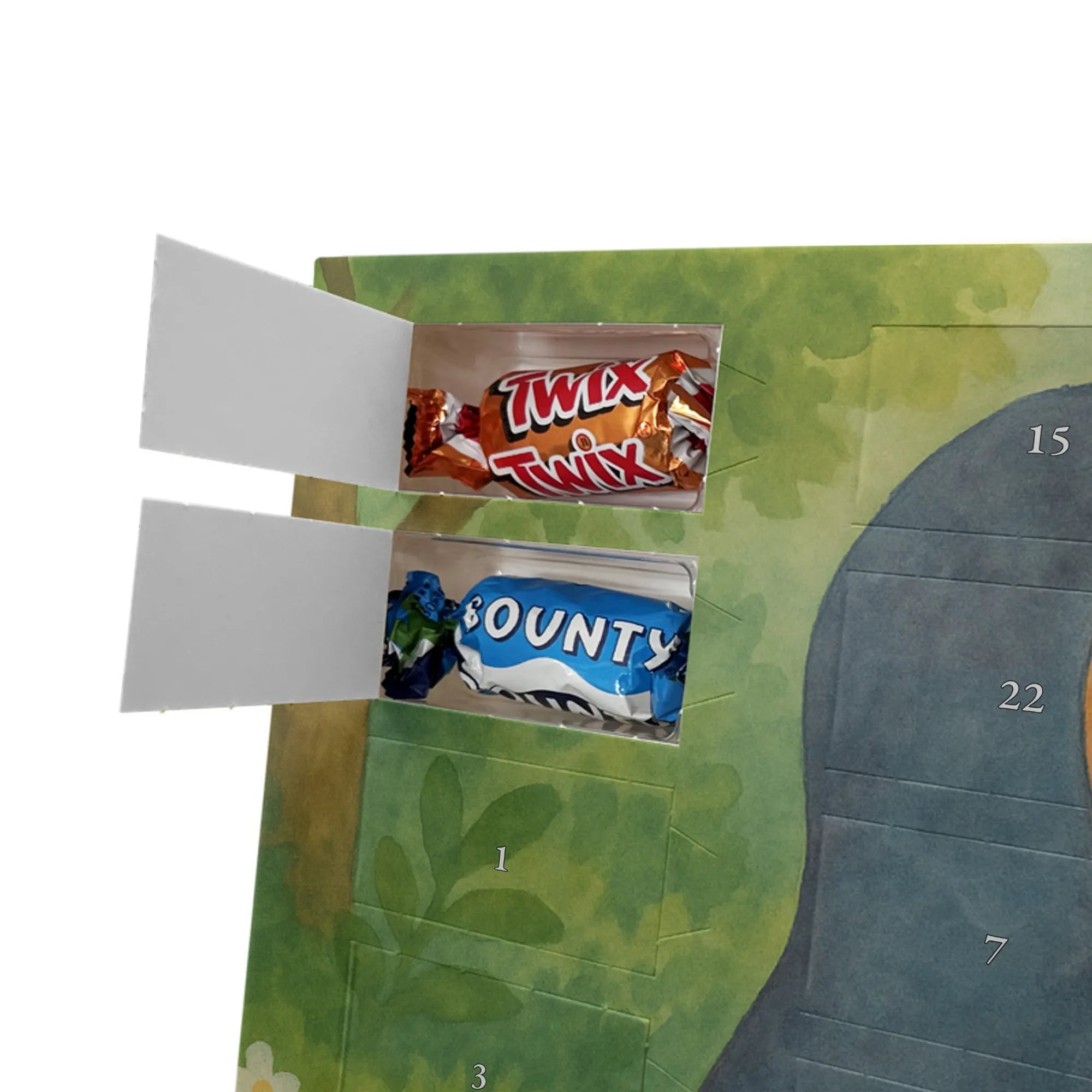 Unser Schoko Adventskalender von Mr. & Mrs. Panda bringt dir und deinen Lieben jede Menge Vorfreude und zauberhafte Momente in die Adventszeit. Der Kalender ist liebevoll bedruckt mit wunderschönen Motiven und frechen Sprüchen im typischen Mr. & Mrs. Panda Stil – ein echter Blickfang auf dem Tisch oder an der Wand. Die brillante Druckqualität kombiniert mit einer seidenmatten Oberflächenveredelung sorgt für edle Farben und ein angenehmes Gefühl beim Anfassen. Auch die Seitenflächen sind bedruckt, sodass der Kalender von allen Seiten hübsch aussieht. Er ist nicht personalisierbar, dafür aber in seiner Gestaltung rundum stimmig. Gefüllt ist der Adventskalender mit 24 hochwertigen Celebrations-Füllungen in acht verschiedenen Sorten: Maltesers, Mars, Snickers, Twix, Milky Way, Bounty, Galaxy und Galaxy Caramel — so ist für jede Naschkatze etwas dabei. Die Besonderheit: Du kannst den Kalender entweder aufstellen oder dank rückseitiger Aufhängung an die Wand hängen. Maße: 325 mm x 225 mm x 27 mm. Ein liebevolles Geschenk für Familie, Freunde oder einfach für dich selbst, das kleine tägliche Glücksmomente schenkt und die Adventszeit versüßt.