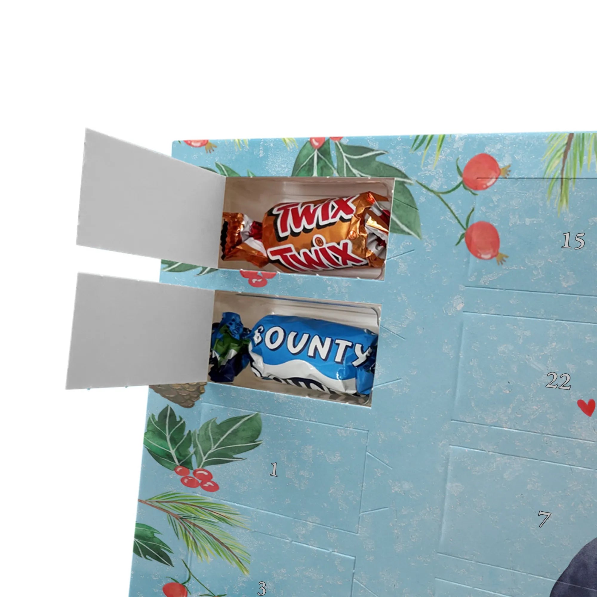 Unser Schoko Adventskalender von Mr. & Mrs. Panda bringt dir und deinen Lieben jede Menge Vorfreude und zauberhafte Momente in die Adventszeit. Der Kalender ist liebevoll bedruckt mit wunderschönen Motiven und frechen Sprüchen im typischen Mr. & Mrs. Panda Stil – ein echter Blickfang auf dem Tisch oder an der Wand. Die brillante Druckqualität kombiniert mit einer seidenmatten Oberflächenveredelung sorgt für edle Farben und ein angenehmes Gefühl beim Anfassen. Auch die Seitenflächen sind bedruckt, sodass der Kalender von allen Seiten hübsch aussieht. Er ist nicht personalisierbar, dafür aber in seiner Gestaltung rundum stimmig. Gefüllt ist der Adventskalender mit 24 hochwertigen Celebrations-Füllungen in acht verschiedenen Sorten: Maltesers, Mars, Snickers, Twix, Milky Way, Bounty, Galaxy und Galaxy Caramel — so ist für jede Naschkatze etwas dabei. Die Besonderheit: Du kannst den Kalender entweder aufstellen oder dank rückseitiger Aufhängung an die Wand hängen. Maße: 325 mm x 225 mm x 27 mm. Ein liebevolles Geschenk für Familie, Freunde oder einfach für dich selbst, das kleine tägliche Glücksmomente schenkt und die Adventszeit versüßt.