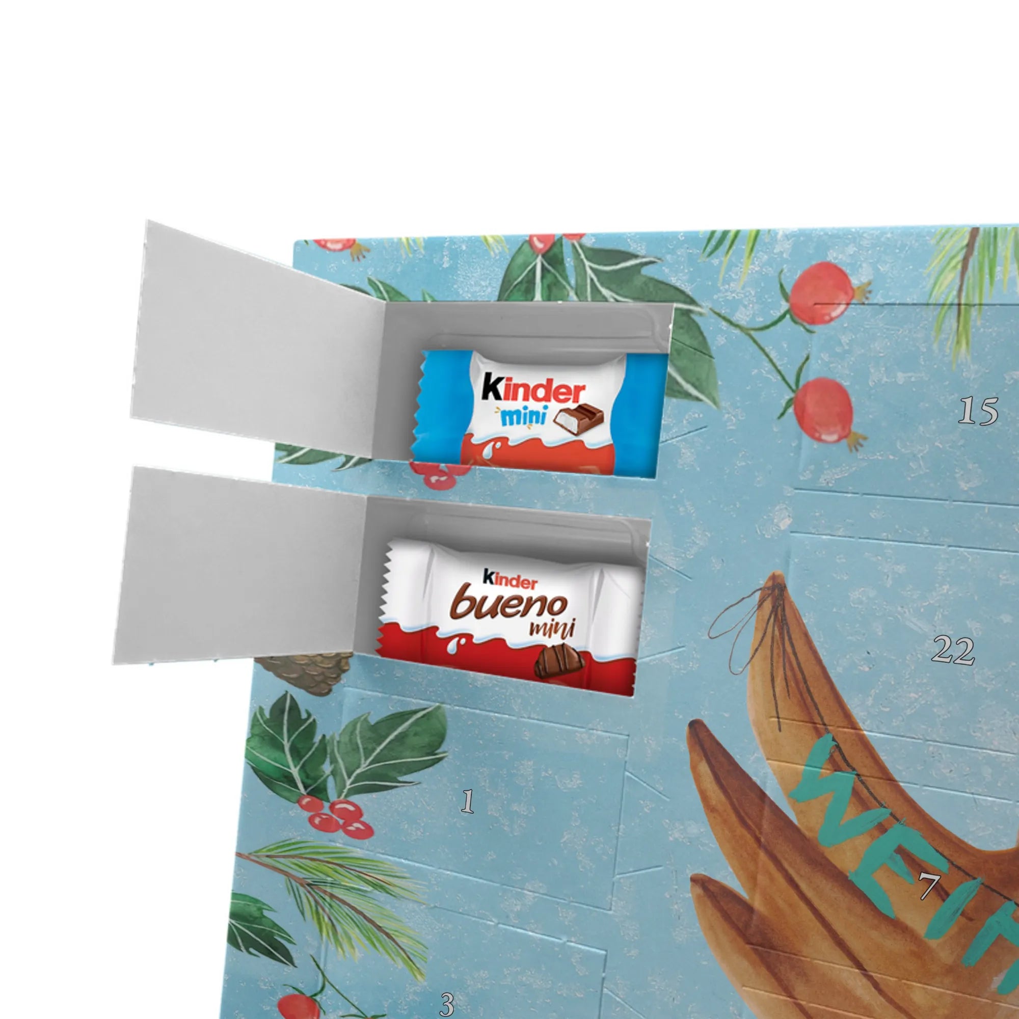 Schoko Adventskalender von Mr. & Mrs. Panda – die charmante Art, sich oder anderen die Adventszeit zu versüßen. Der Kalender ist bedruckt mit wunderschönen Motiven & Sprüchen von Mr. & Mrs. Panda und nicht personalisierbar. Wir legen Wert auf brillante Druckqualität mit seidenmatter Oberflächenveredelung sowie auf bedruckte Seitenflächen für ein stimmiges Gesamtbild. Maße: 355 mm x 245 mm x 11 mm. Besonders praktisch: kann aufgehängt oder aufgestellt werden und passt so in jede Wohnung. Gefüllt mit Markenname Schokolade: Adventskalender gefüllt mit kinder® Schokolade. Inhalt: kinder® Schoko-Bons, kinder® Bueno mini und kinder® Schokolade mini. Die 24 Türchen sind mit kleinen Schoko-Überraschungen bestückt und schaffen jeden Tag Vorfreude. Ob als Geschenk für Kinder, Partner oder als nette Aufmerksamkeit für Kolleginnen und Kollegen – dieser Kalender macht Freude. Robust, schön gestaltet und sofort einsatzbereit für die süßeste Zeit des Jahres!