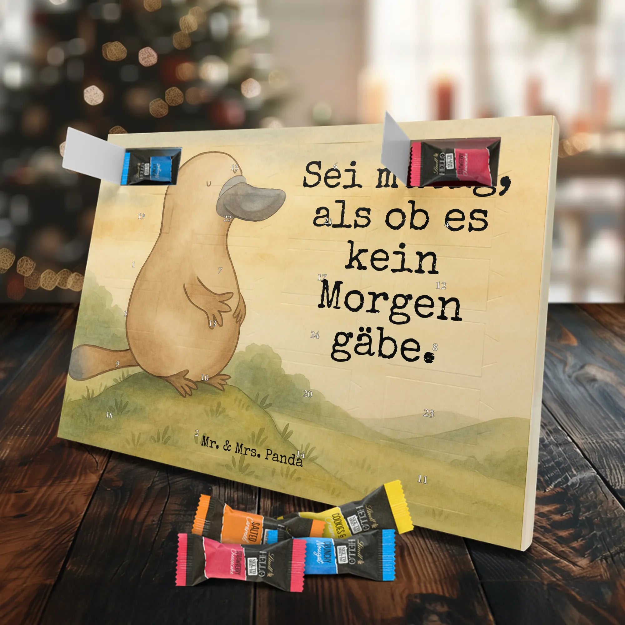 Unser entzückender Schokoladen Adventskalender von Mr. & Mrs. Panda ist das perfekte Highlight für die Adventszeit. Bedruckt mit wunderschönen Motiven & Sprüchen von Mr. & Mrs. Panda zaubert er dir ein Lächeln an jedem Tag im Dezember. Der Kalender ist nicht personalisierbar, überzeugt aber durch brillante Druckqualität mit seidenmatter Oberflächenveredelung und sorgsame bedruckte Seitenflächen. Die stabile Verarbeitung macht ihn zu einem dekorativen Hingucker. Maße: 325 mm x 225 mm x 27 mm. Besonders praktisch: Er kann aufgehängt oder aufgestellt werden, ganz nach deinem Geschmack und Platzangebot. Gefüllt ist der Adventskalender mit Ritter Sport Schokowürfeln – in verführerischen Sorten wie Mousse au Chocolat, Schoko Crisp, Voll-Nuss in Nougatcreme, Karamell Duo, Joghurt und Erdbeer-Joghurt. Wichtiger Hinweis: Es handelt sich um einen Kalender gefüllt mit Ritter Sport Schokolade, nicht um einen Kalender der Marke Ritter Sport. Schenk ihn Freunden, der Familie oder gönn dir selbst eine süße Vorfreude: kleine Schokoladenmomente, liebevoll verpackt von Mr. & Mrs. Panda.