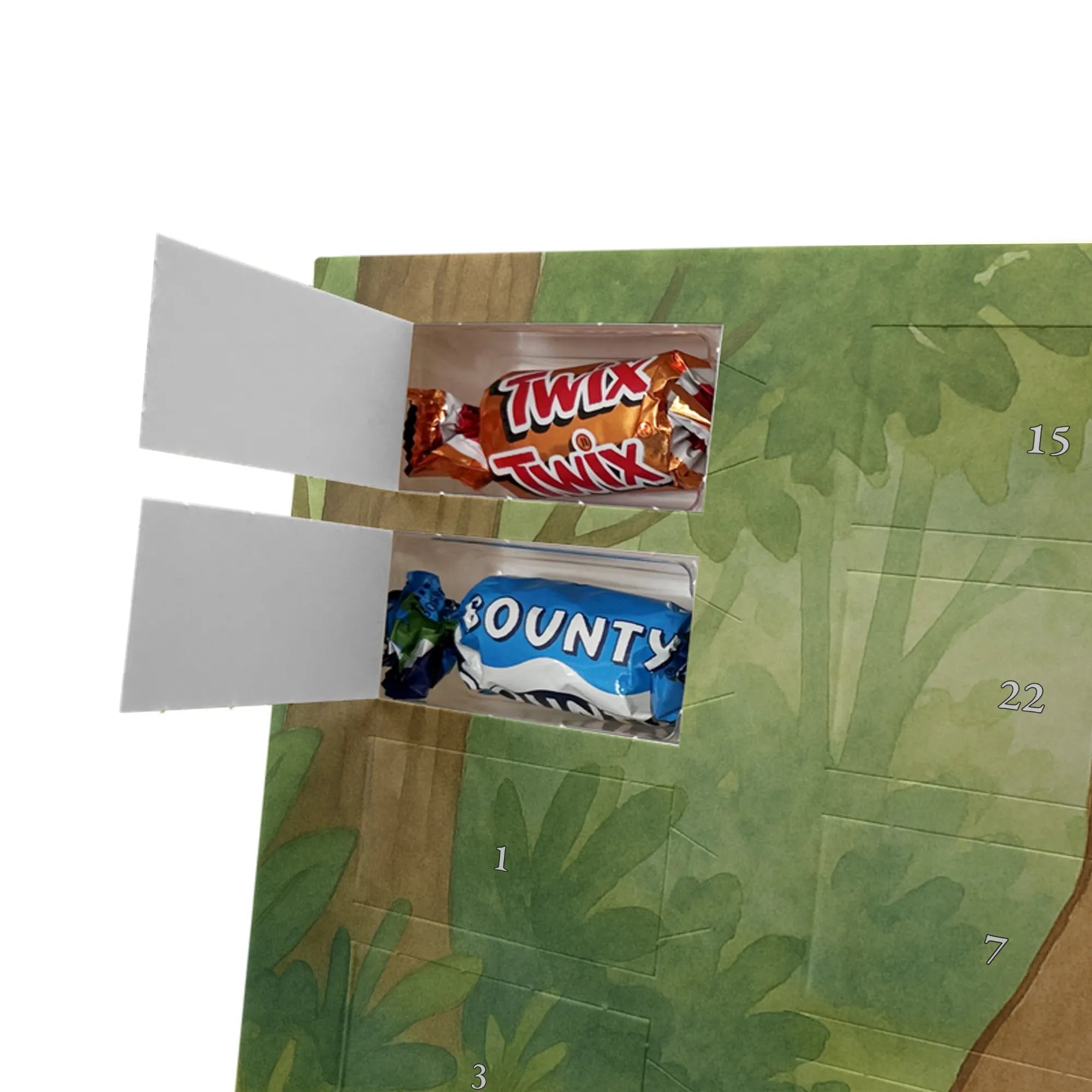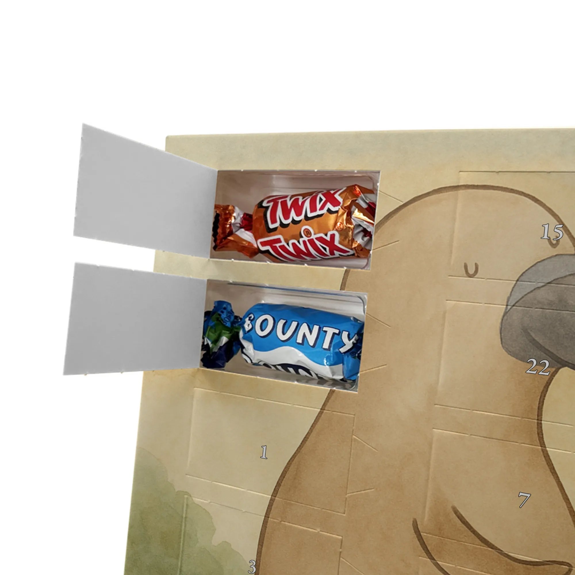 Unser Adventskalender mit Schokolade von Mr. & Mrs. Panda ist ein liebevoll gestaltetes Highlight für die Adventszeit. Die süßen Illustrationen und charmanten Sprüche sorgen für gute Stimmung bei Groß und Klein. Gedruckt in brillanter Qualität mit seidenmatter Oberflächenveredelung, wirken die Farben kräftig und edel; auch die Seitenflächen sind dekorativ bedruckt. Bitte beachten: Der Kalender ist nicht personalisierbar. Gefüllt ist er mit 24 Celebrations-Überraschungen in acht verschiedenen Sorten: Maltesers, Mars, Snickers, Twix, Milky Way, Bounty, Galaxy und Galaxy Caramel — perfekte Abwechslung für jeden Tag. Besonderheit: Du kannst den Kalender sowohl aufstellen als auch aufhängen. Maße: 325 mm x 225 mm x 27 mm. Schenke Vorfreude und kleine Genussmomente – ideal als Geschenk oder für deine eigene Adventszeit.
