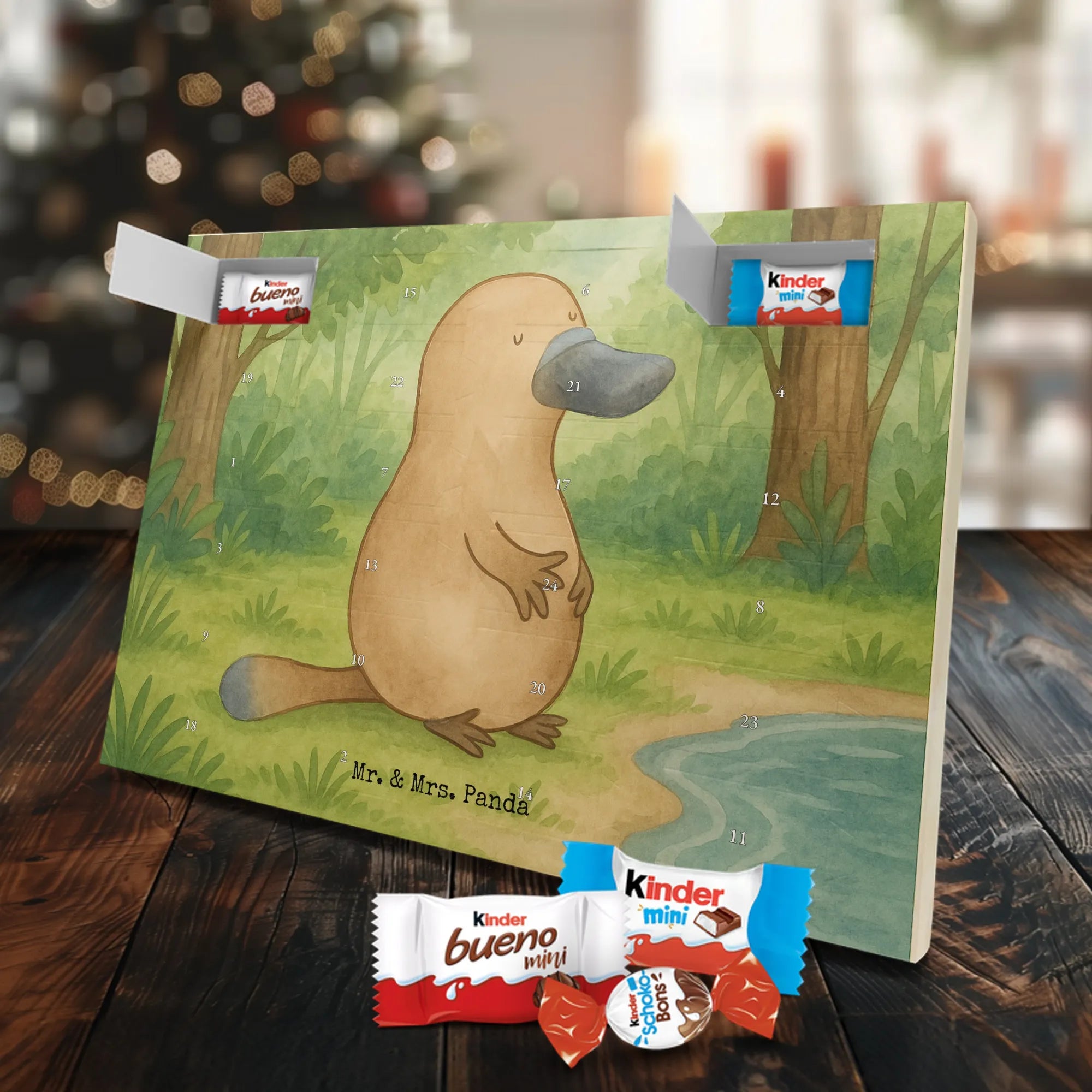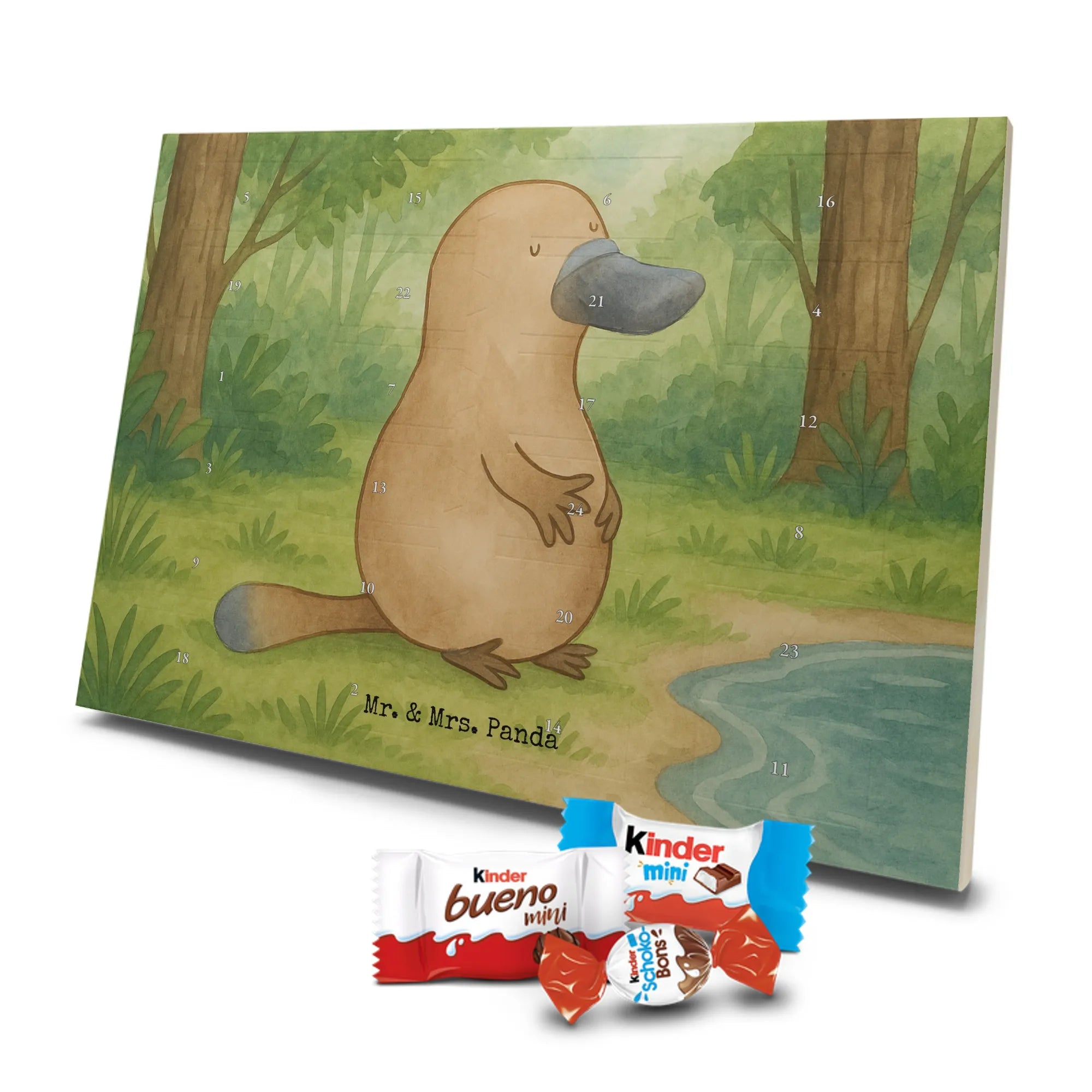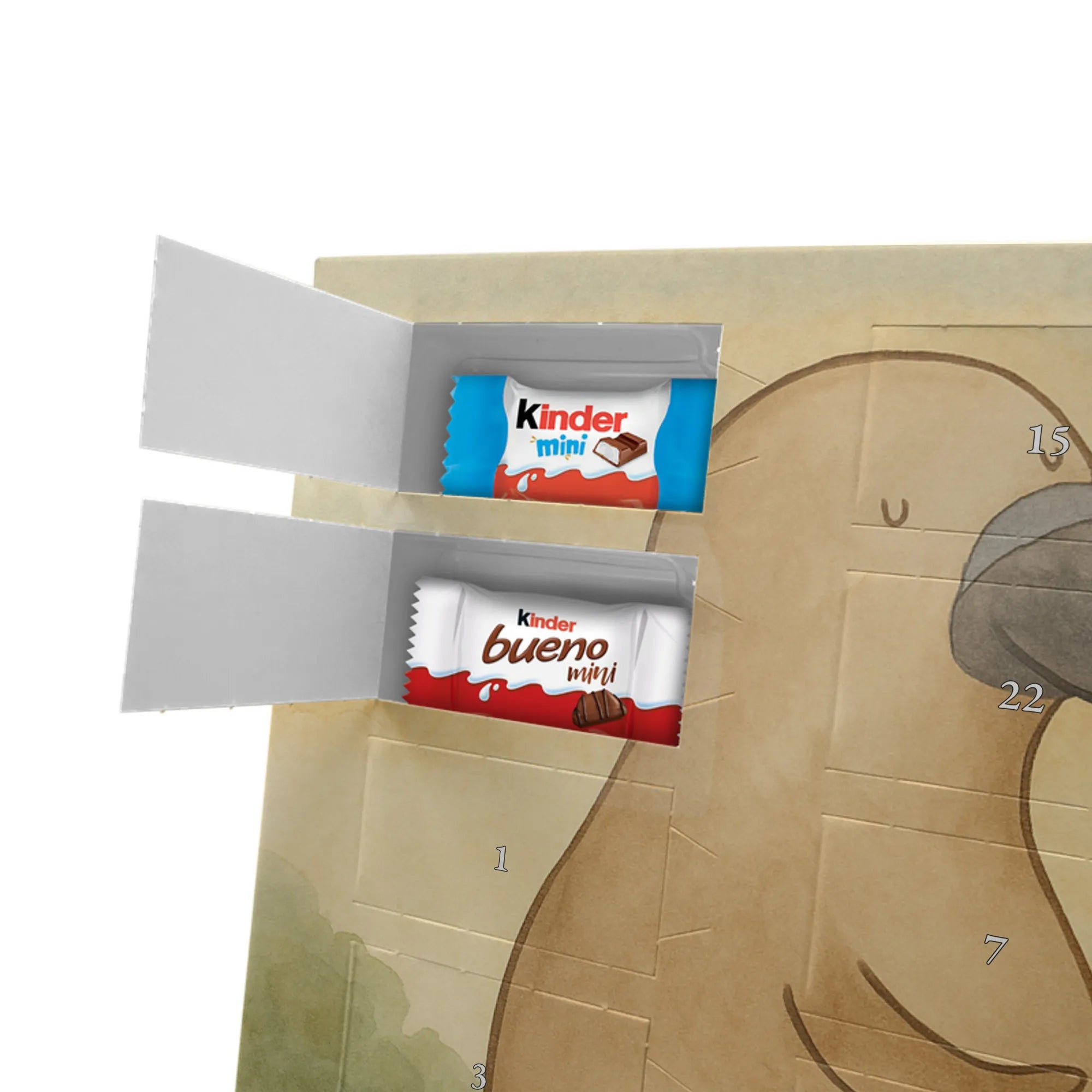 Entdecke unseren liebevoll gestalteten Schoko-Adventskalender von Mr. & Mrs. Panda – eine zauberhafte Idee, um die Tage bis Weihnachten zu versüßen. Der Kalender ist bedruckt mit wunderschönen Motiven & Sprüchen von Mr. & Mrs. Panda und ist nicht personalisierbar. Wir setzen auf brillante Druckqualität mit seidenmatter Oberflächenveredelung und bedruckte Seitenflächen für ein rundum schönes Erscheinungsbild. Maße: 355 mm x 245 mm x 11 mm. Die clevere Bauweise erlaubt es, den Kalender entweder aufzuhängen oder freistehend aufzustellen – so bist du flexibel bei der Dekoration. Gefüllt mit Markenname Schokolade: Adventskalender gefüllt mit kinder® Schokolade. Inhalt: kinder® Schoko-Bons, kinder® Bueno mini und kinder® Schokolade mini. Jeder Tag bringt eine kleine Freude und eignet sich perfekt als Geschenk oder als dekoratives Highlight in deinem Zuhause. Die stabile Verarbeitung sorgt dafür, dass der Kalender die ganze Adventszeit über Freude bereitet. Hol dir diesen Schoko-Adventskalender und lade die Vorweihnachtszeit mit süßen Überraschungen auf!
