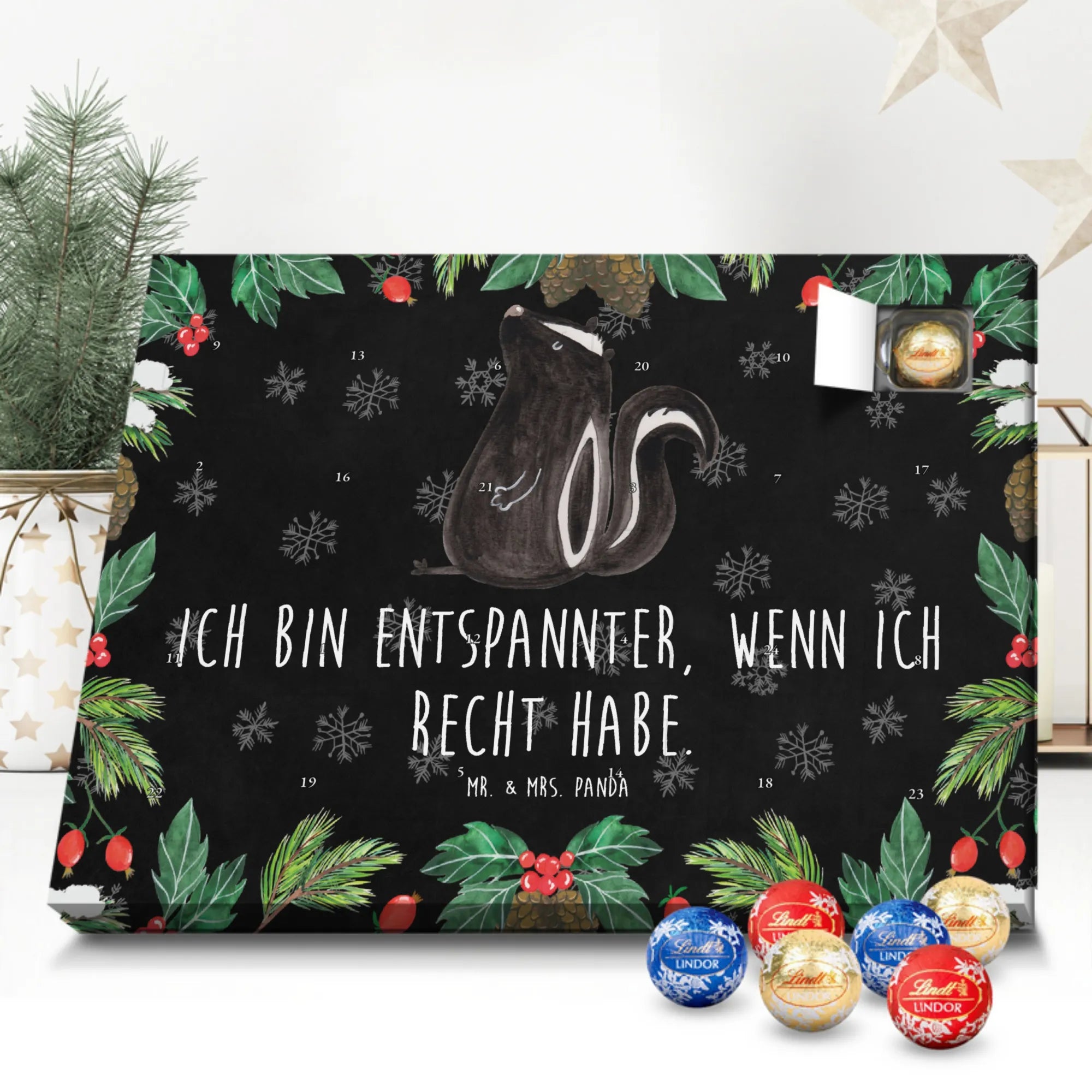 Wunderschöner Adventskalender mit Schokolade von Mr. & Mrs. Panda – für alle, die Advent und Design lieben. Dieser Adventskalender mit Schokolade ist liebevoll bedruckt mit wunderschönen Motiven & Sprüchen von Mr. & Mrs. Panda und ist nicht personalisierbar, aber mit viel Liebe zum Detail gefertigt. Brillante Druckqualität mit seidenmatter Oberflächenveredelung sorgt für einen edlen Look, und die bedruckten Seitenflächen geben dem Kalender eine besondere Optik. Maße: 233 mm x 178 mm x 24 mm. Dank seiner stabilen Verarbeitung kannst du ihn aufstellen oder ganz einfach aufhängen – Besonderheit: kann aufgehängt oder aufgestellt werden. Gefüllt mit MARKENNAMEN Schokolade und leckeren Schokoladenkugeln, bringt er jeden Tag ein kleines Glückserlebnis. Wichtige Hinweise: (Kann Spuren von Haselnüssen, Mandeln, Gluten und Soja enthalten!), bitte kühl und trocken lagern. Ob als Geschenk, Mitbringsel oder Adventsdeko – dieser Kalender zaubert ein Lächeln und sorgt für gemütliche Vorfreude. Viel Freude beim Entdecken der süßen Überraschungen wünscht dir Mr. & Mrs. Panda!