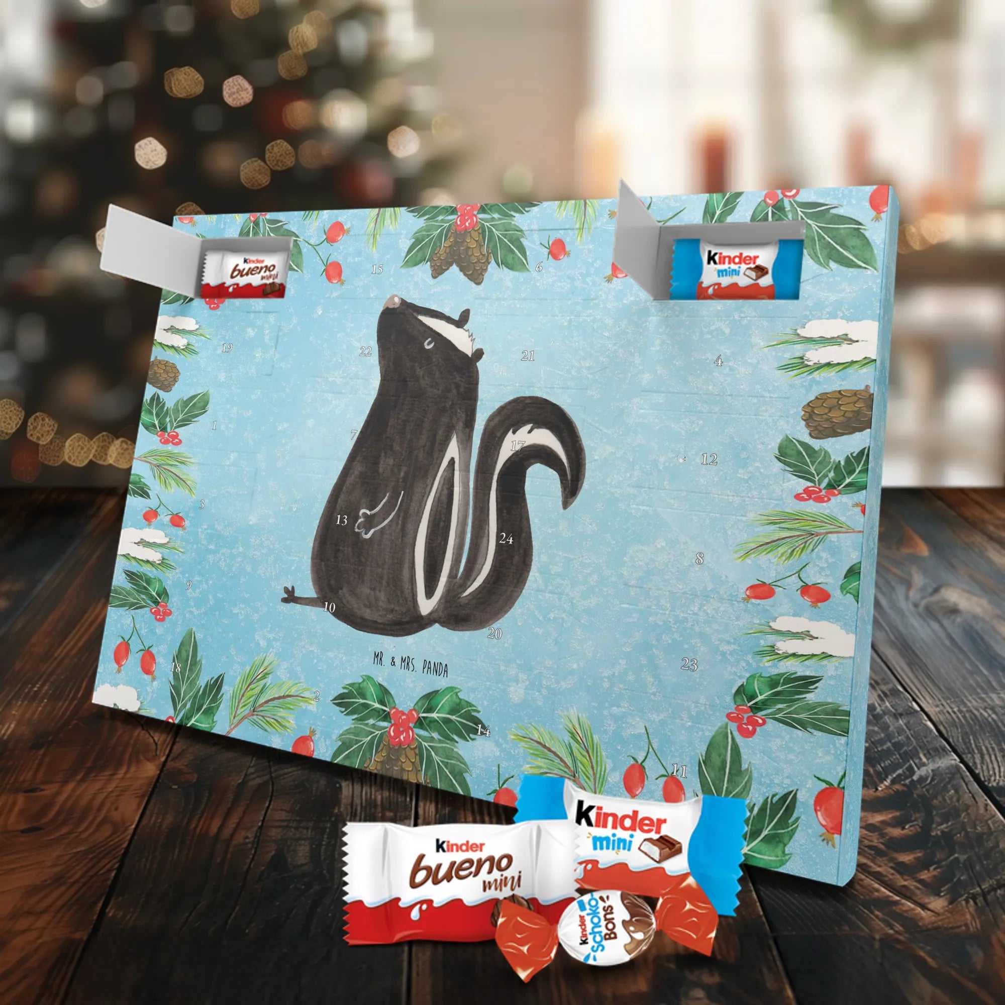 Adventskalender mit Schokolade – liebevoll gestaltet von Mr. & Mrs. Panda. Dieser niedliche Kalender ist bedruckt mit wunderschönen Motiven & Sprüchen von Mr. & Mrs. Panda und trotzdem nicht personalisierbar. Du bekommst brillante Druckqualität mit seidenmatter Oberflächenveredelung sowie bedruckte Seitenflächen, die dem Kalender ein hochwertiges Finish verleihen. Maße: 355 mm x 245 mm x 11 mm. Ein tolles Extra: kann aufgehängt oder aufgestellt werden, sodass du ihn flexibel platzieren kannst. Gefüllt mit Markenname Schokolade: Adventskalender gefüllt mit kinder® Schokolade. Inhalt: kinder® Schoko-Bons, kinder® Bueno mini und kinder® Schokolade mini. Die 24 Türchen sind liebevoll befüllt und sorgen jeden Tag für ein Lächeln – ideal für Kinder, Paare oder als kleines Geschenk für Freunde. Robust und dekorativ zugleich, bringt dieser Adventskalender süße Vorfreude in dein Zuhause. Verschenke oder genieße eine adventliche Zeit voller kleiner, schokoladiger Überraschungen!