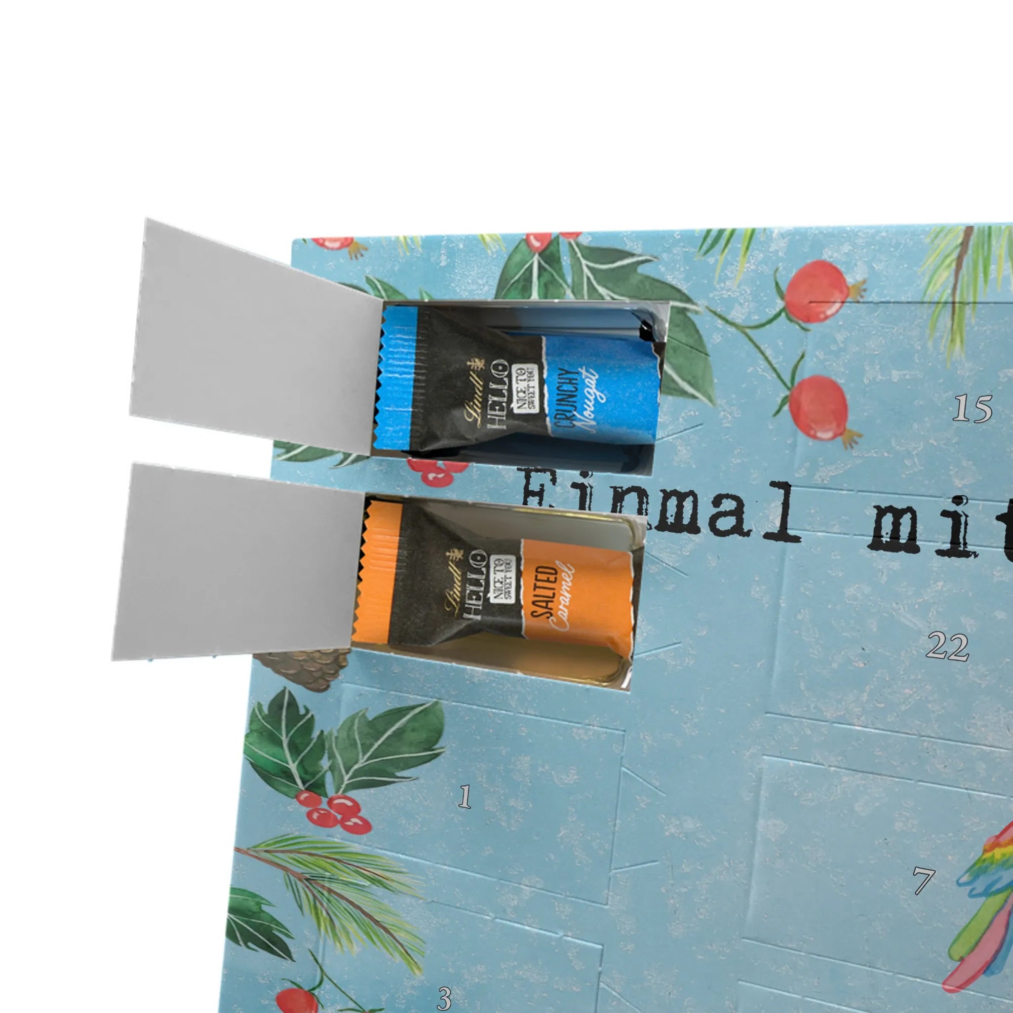 Wunderschöner Schoko Adventskalender von Mr. & Mrs. Panda – perfekt, wenn du dir oder deinen Liebsten die Adventszeit mit süßen Überraschungen versüßen willst. Unser liebevoll gestalteter Schokoladen Adventskalender ist bedruckt mit bezaubernden Motiven und frechen Sprüchen von Mr. & Mrs. Panda und sorgt jeden Tag für ein Lächeln. Der Kalender ist nicht personalisierbar, dafür aber in brillanter Druckqualität mit seidenmatter Oberflächenveredelung gefertigt. Auch die Seitenflächen sind vollständig bedruckt, was dem Design noch mehr Tiefe verleiht. Maße: 325 mm x 225 mm x 27 mm. Besonders praktisch: Der Kalender kann aufgehängt oder aufgestellt werden – so findest du immer den idealen Platz bei dir zu Hause. Gefüllt mit Lindt Hello Schokolade: 24 einzeln verpackte Schokoladen Mini Sticks in vier verschiedenen Sorten – Karamell-Schokoladenkuchen, Kekse, Knuspriger Nougat und Erdbeer-Cheesecake. Zutaten und Allergene findest du auf der Verpackung; wichtige Hinweise: enthält Milcheiweiß, Milchzucker, Soja, Weizen und Haselnüsse, kann Mandeln und andere Schalenfrüchte enthalten. Dieser Adventskalender ist eine liebevolle Geschenkidee für Freunde, Familie und alle Schoko-Fans, die jeden Tag bis Weihnachten mit feinem Schoko-Genuss feiern möchten.