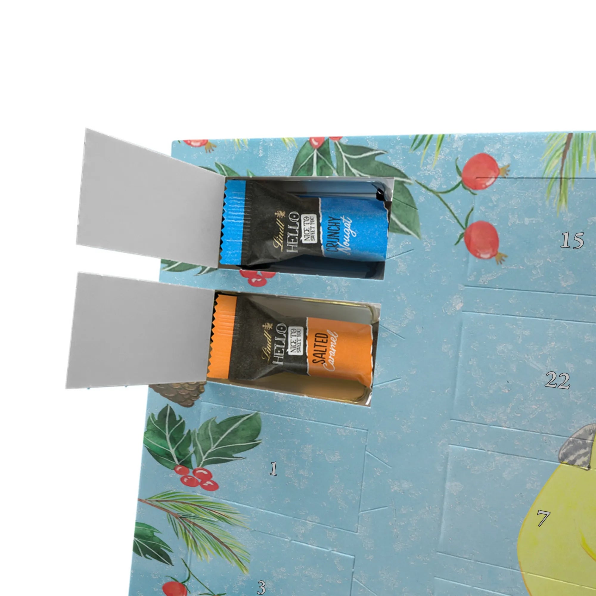 Entdecke den charmanten Schokoladen Adventskalender von Mr. & Mrs. Panda – ein kleines Kunstwerk für alle Schoko-Liebhaber. Der Schoko-Adventskalender ist mit liebevollen Illustrationen und kurzen Sprüchen bedruckt und verbreitet gemütliche Vorfreude auf Weihnachten. Er ist nicht personalisierbar, aber durch die brillante Druckqualität und die seidenmatte Oberflächenveredelung ein echtes Hingucker-Produkt. Auch die Seitenflächen sind bedruckt, was dem Kalender ein rundum schönes Erscheinungsbild verleiht. Maße: 325 mm x 225 mm x 27 mm. Das praktische Design erlaubt es, den Kalender aufzuhängen oder aufzustellen. Gefüllt mit Lindt Hello Schokolade: 24 einzeln verpackte Mini Sticks in vier leckeren Sorten – Karamell-Schokoladenkuchen, Kekse, Knuspriger Nougat und Erdbeer-Cheesecake. Zutaten sind u. a. Zucker, Kakaobutter, Vollmilchpulver, Haselnüsse und weitere Zutaten; Allergene: Milcheiweiß, Milchzucker, Soja, Weizen, Haselnüsse; kann Spuren von Mandeln und anderen Schalenfrüchten enthalten. Ideal als Geschenk oder zum Selbernaschen – einfach jeden Tag ein Türchen öffnen und genießen.