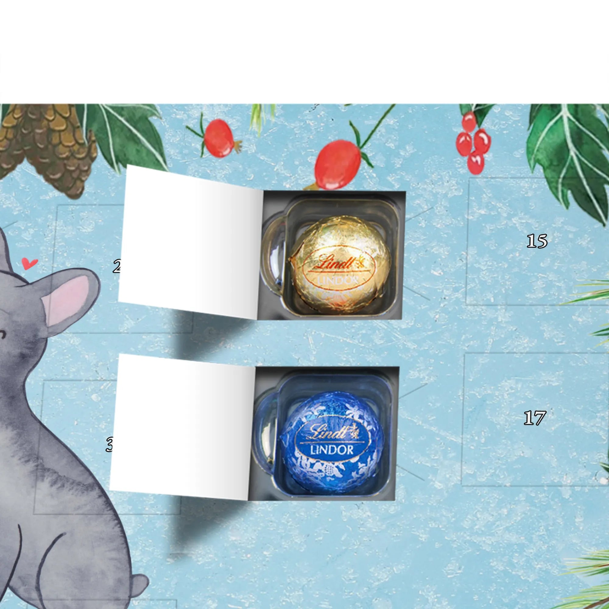 Der Schokolade Adventskalender von Mr. & Mrs. Panda ist ein liebevoll gestaltetes Highlight für deine Adventsdeko. Bedruckt mit wunderschönen Motiven & Sprüchen, nicht personalisierbar, bietet er eine charmante Optik für jeden Haushalt. Die brillante Druckqualität mit seidenmatter Oberflächenveredelung sorgt für edle Akzente, und die bedruckten Seitenflächen machen den Kalender rundum schön. Maße: 233 mm x 178 mm x 24 mm. Besonderheit: kann aufgehängt oder aufgestellt werden – richtig praktisch! Gefüllt mit Lindt Lindor: 24 einzeln verpackte Markenschokoladen Kugeln in drei köstlichen Varianten – Vollmilch, Feinherb und Weiße Schokolade – sorgen für tägliche Freuden. Zutaten: Zucker, pflanzliches Fett (Kokosnuss, Palmkern), Kakaobutter, Vollmilchpulver, Kakaomasse, Milchzucker, Magermilchpulver, Butterreinfett, Emulgator (Sojalecithin), Gerstenmalzextrakt, Aromen. Besondere Hinweise: Kann Haselnüsse und Mandeln enthalten. Ob als Geschenk oder für dich selbst – dieser Kalender ist eine wunderbare Mischung aus Design und feiner Markenschokolade.